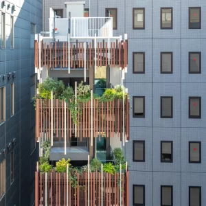 A movable folded metal screen, acting as a curtain, bridges the sidewalk and the office’s courtyard, creating a flexible space for social events.