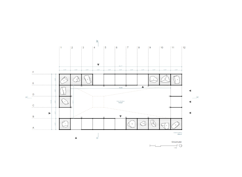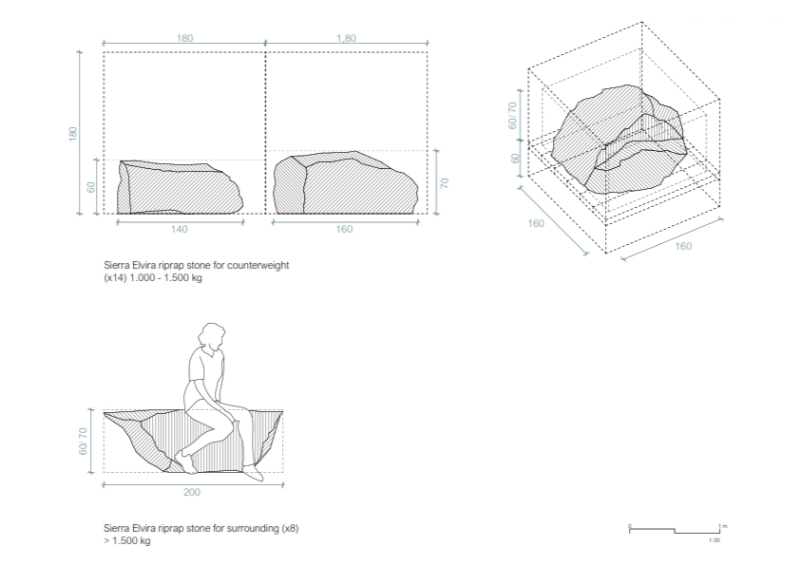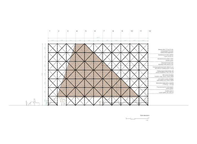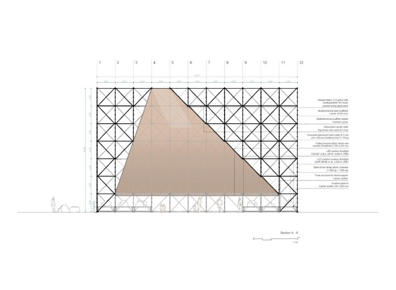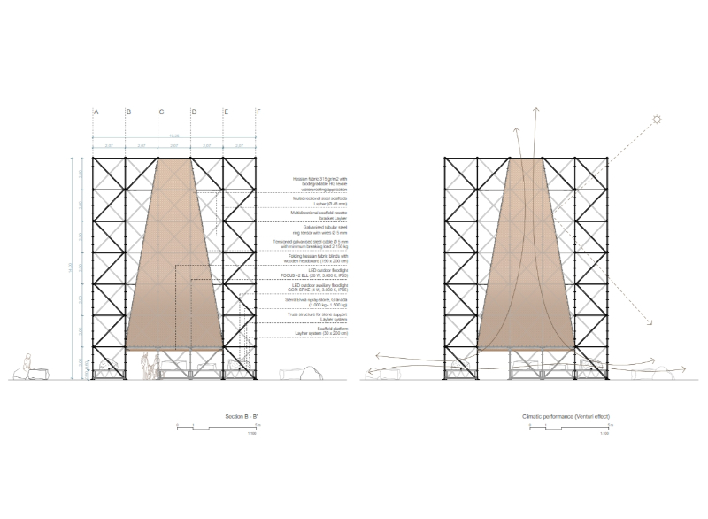 AIRE is resolved solely by means of three material strategies, which seek to establish an exercise of synthesis, constructive veracity and sustainability. Firstly, a scaffolding system, a reflection of industrial systematization, which, although it has its origins in the very beginnings of the architectural tradition, today represents modularity and globalization in construction, as well as ephemerality and apparent fragility, which is condemned to disappear once the work is finished. This system resolves the load-bearing structure of the pavilion; a resistant fabric that is linked to a lighter one, an envelope of hessian fabric, a symbol of locality, handicraft, the shade (or the control of light), tradition and vernacular knowledge, the recognisable, the commonplace of the area. A way of rescuing Granada’s own identity and its climate. Finally, a group of riprap stones from Sierra Elvira (the local quarry) provides the necessary counterweight to the structure and implements new urban furniture in the surroundings of the pavilion, connecting the intervention with Plaza del Humilladero.