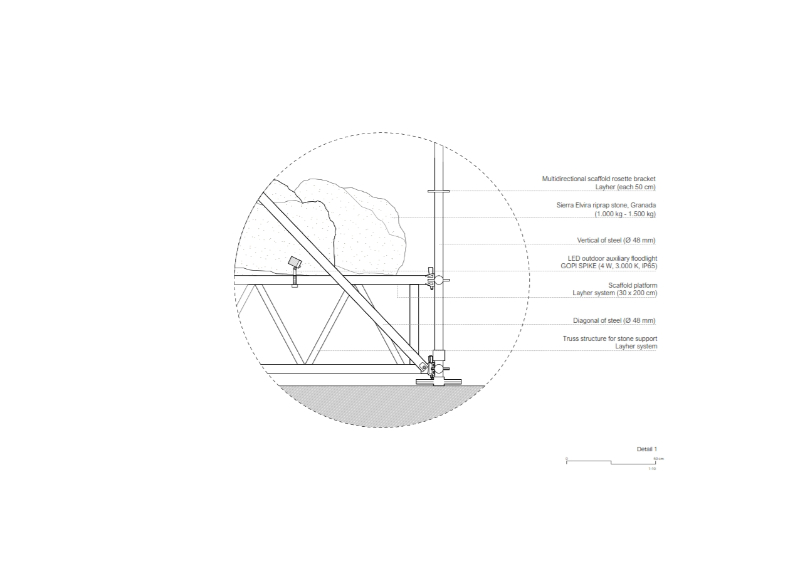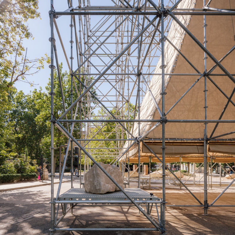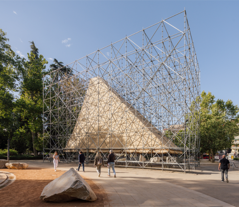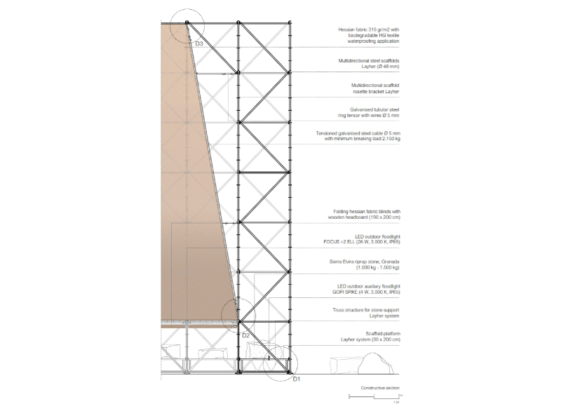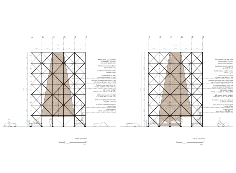 The use of these three materials demonstrates AIRE’s commitment to circular economy, as well as to the value of local economy and the traditions and trades of Granada. Thus, the scaffolding, which is rented, will have a new use once the pavilion is dismantled; in the same way, the riprap stone will return to its original quarry; and finally, the locally made hessian fabric, will also have a second life, as it is an element widely used as a shade in the city, and can be easily relocated to another public space in Granada.