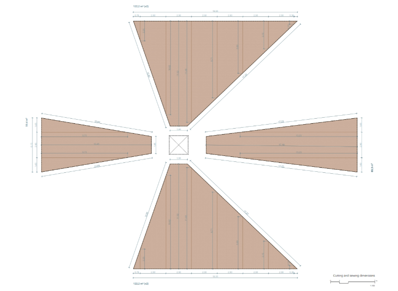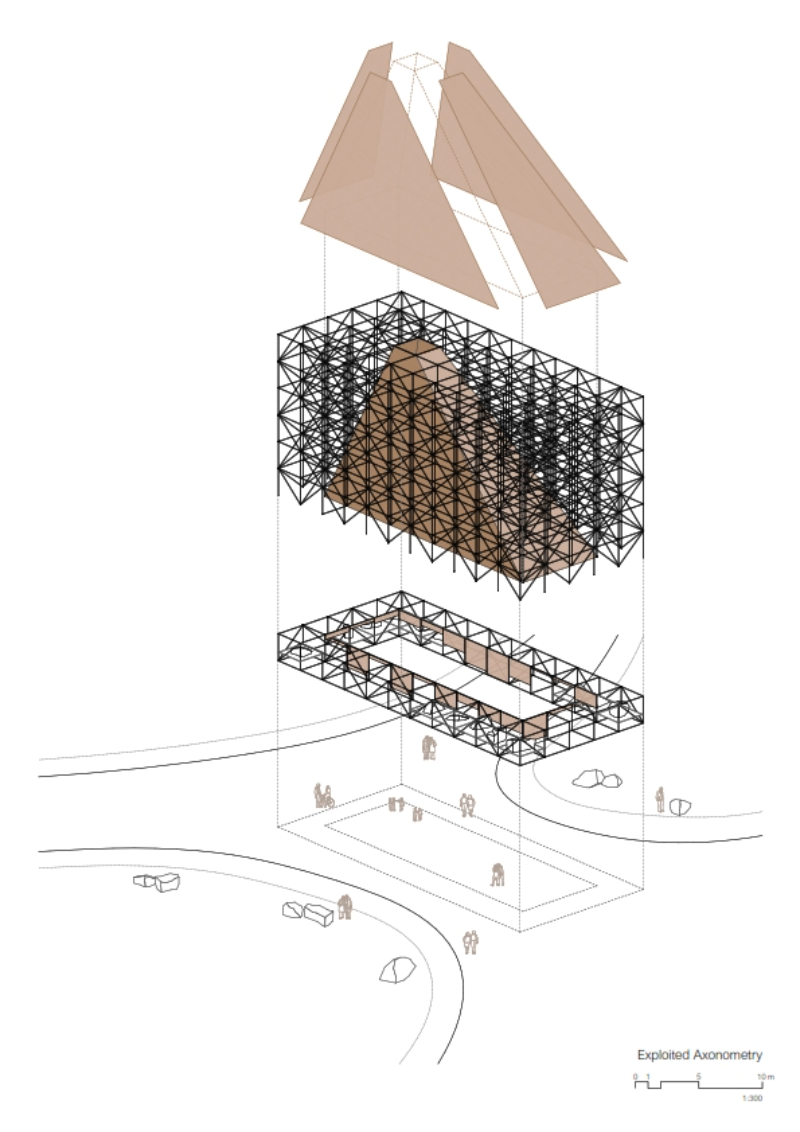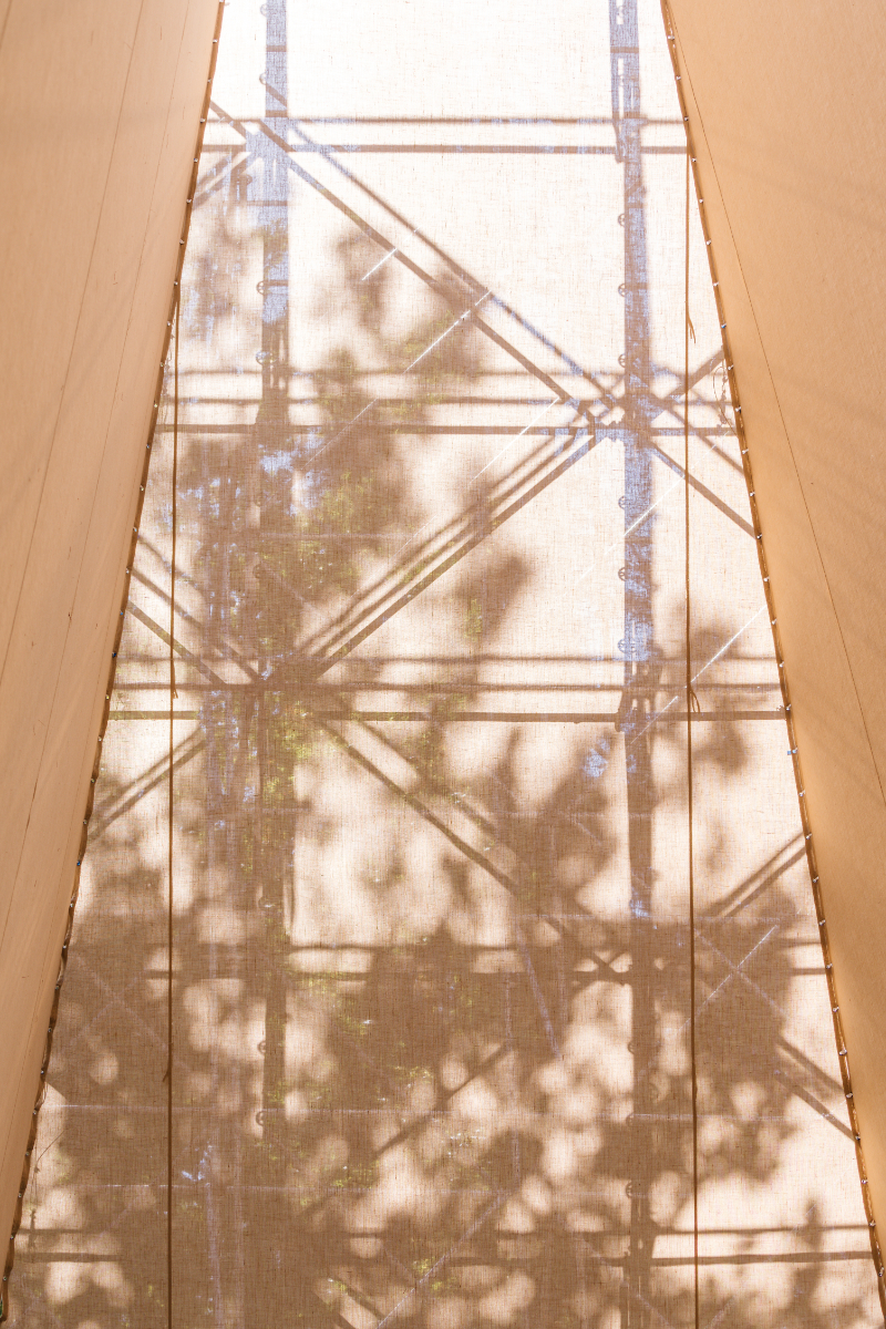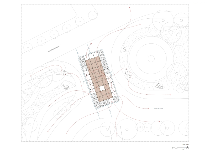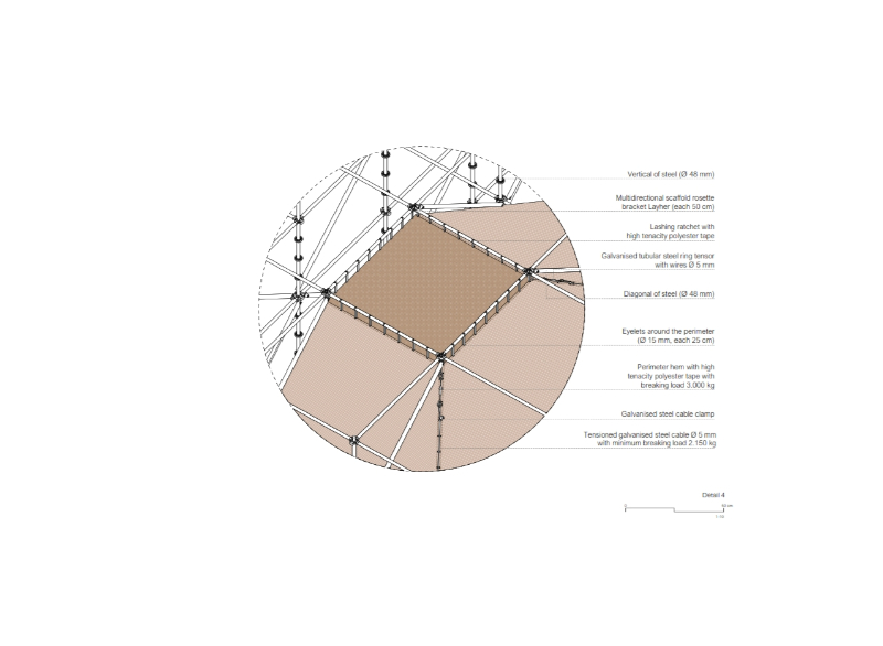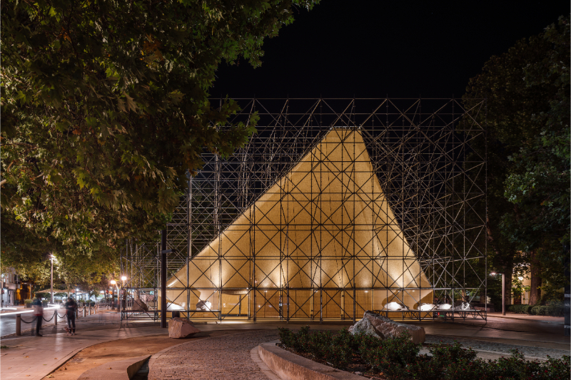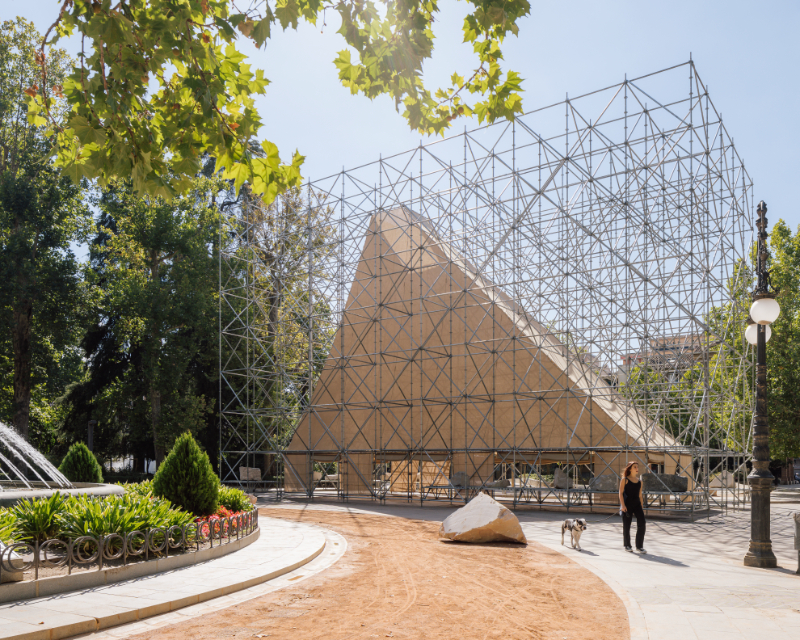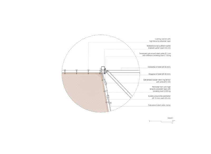 AIRE pavilion is built on the imaginary of the ephemeral, the fragile and immaterial, alluding to one of the most essential and intangible elements of architecture. As occurs in a tent in the middle of the desert to protect from the sun, or in the airy space of the circus supported by a series of masts, an image that reflects the condition of the unfinished or in the process of being erected with all its corporeity, a half-finished architecture, is constructed. Thus, the spatial strategy of the pavilion is synthesised in the elementary operation of containing the “AIRE” (air) that will define an indeterminate space, open to the multiple needs of both TAC! Festival and the city of Granada and its inhabitants; promoting the transformation and adaptability of the space, without requiring greater operations than opening or closing the fragile limit that defines it.