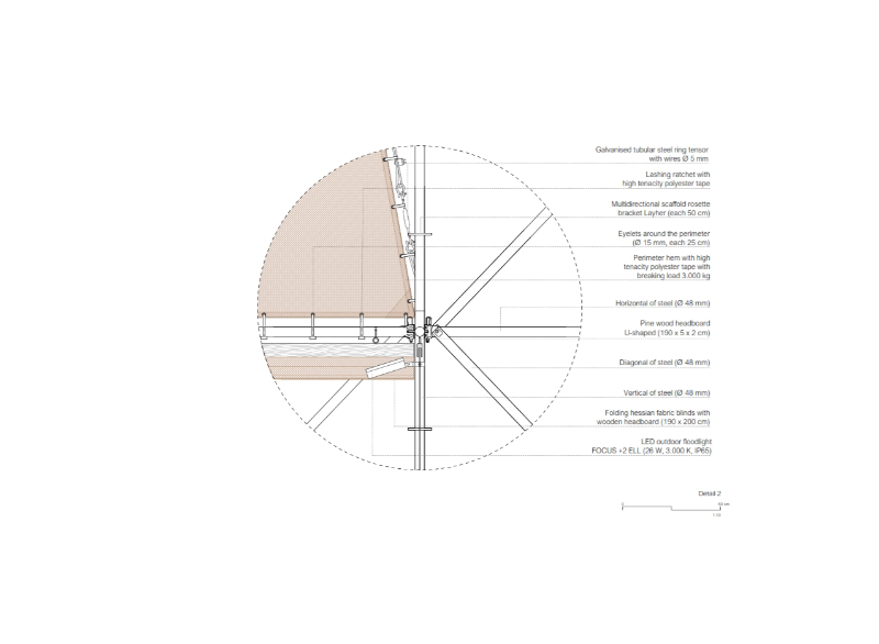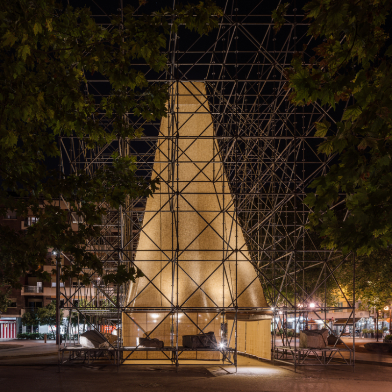 In this way, AIRE “rises”, as its own etymological origin indicates, in search of light, taking shape as a pavilion woven between scaffolding and hessian fabric, establishing a new scenario of diverse, open, indeterminate and flexible encounters that will allow new relationships and uses to be interlinked into the Plaza del Humilladero in Granada.