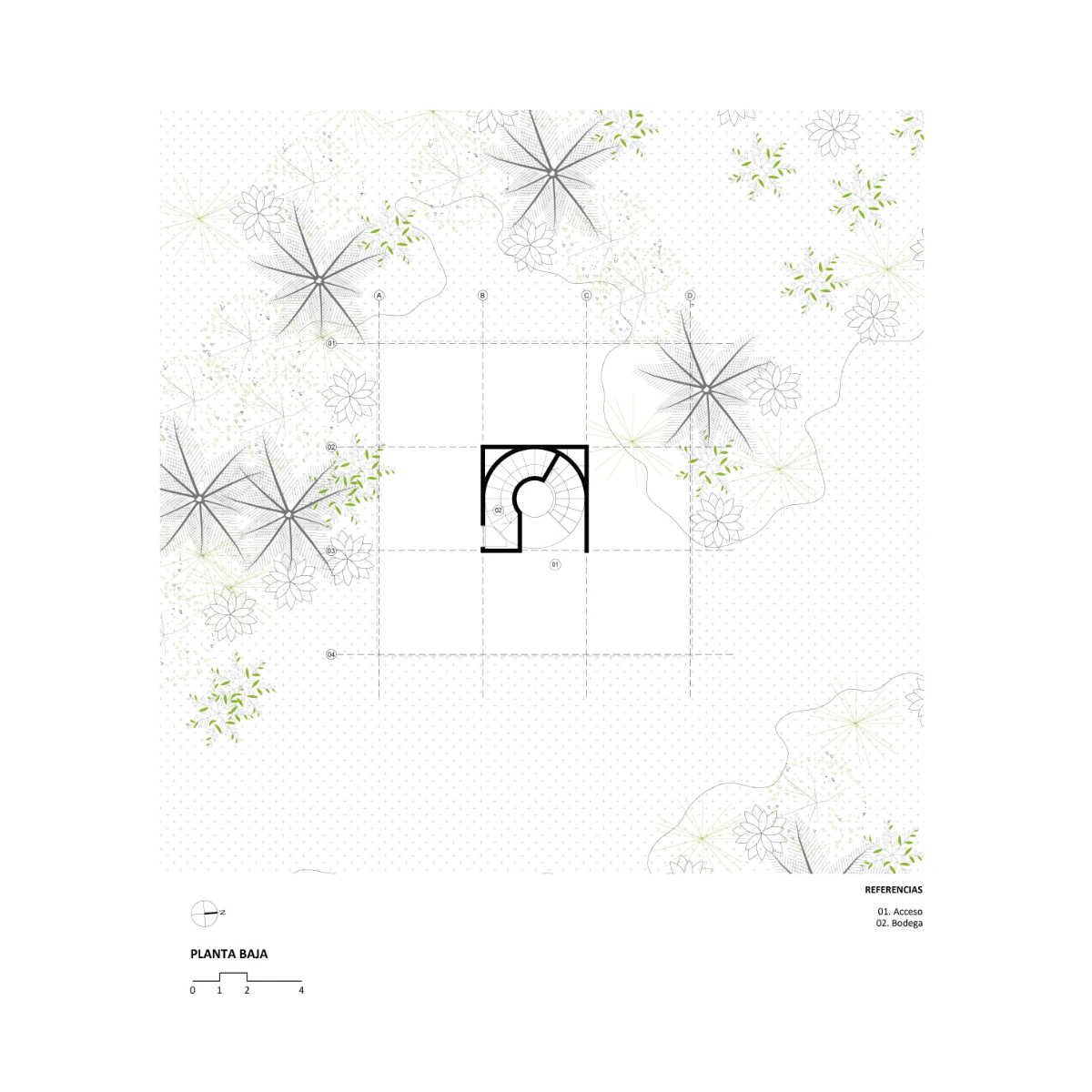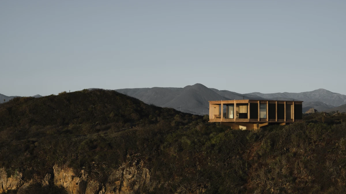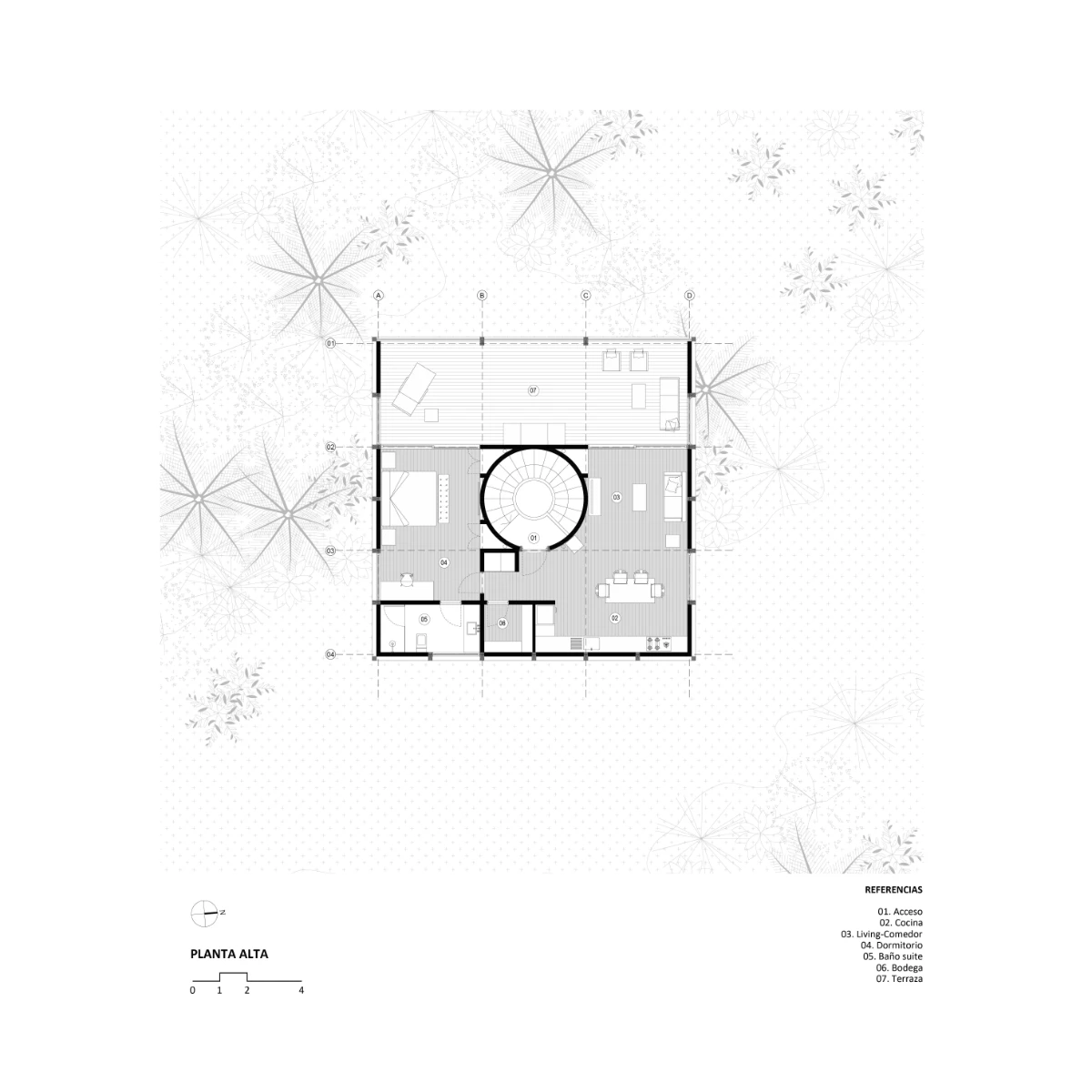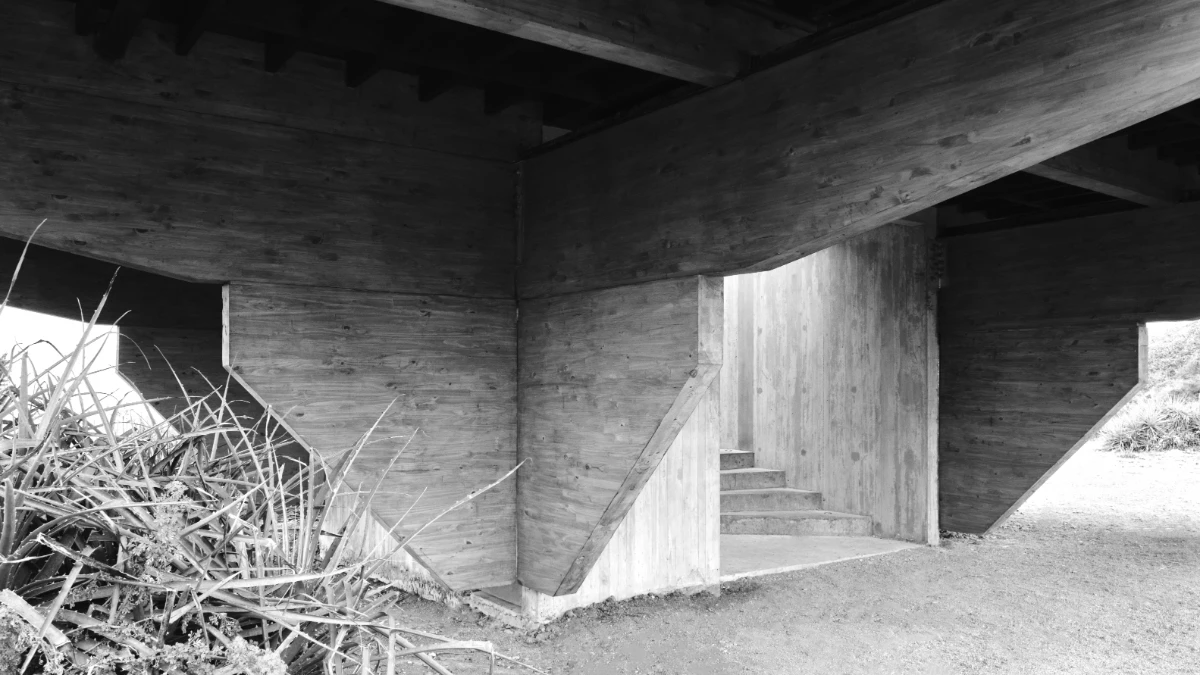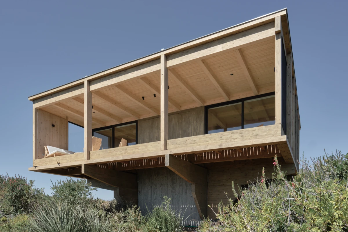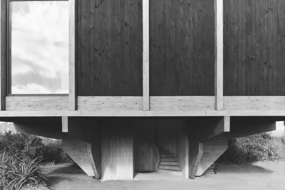 The design is organized around a grid of nine quadrants: eight peripheral wooden quadrants and one central circular concrete quadrant, which is elevated to serve as the main access point to the house. This entry is defined by a sculptural element—a project in itself—a helical staircase that anchors the composition. The house is lifted above the ground both to preserve the native flora and to maximize 360-degree panoramic views of the surrounding landscape.