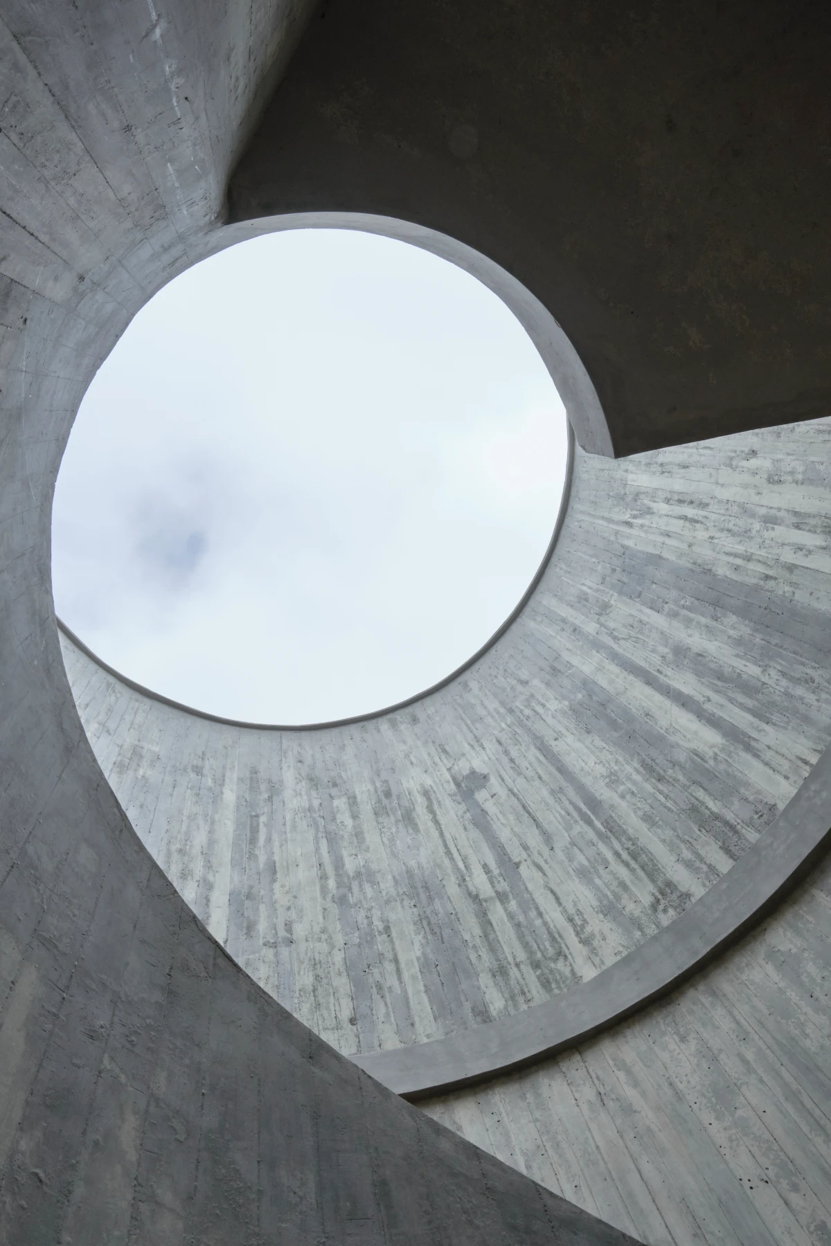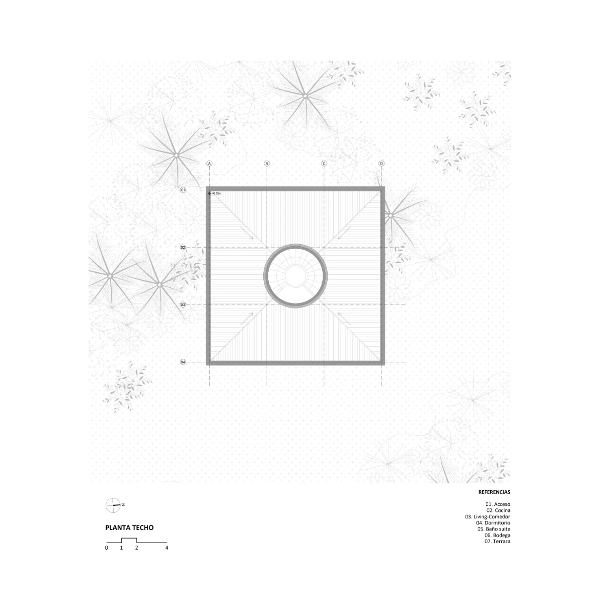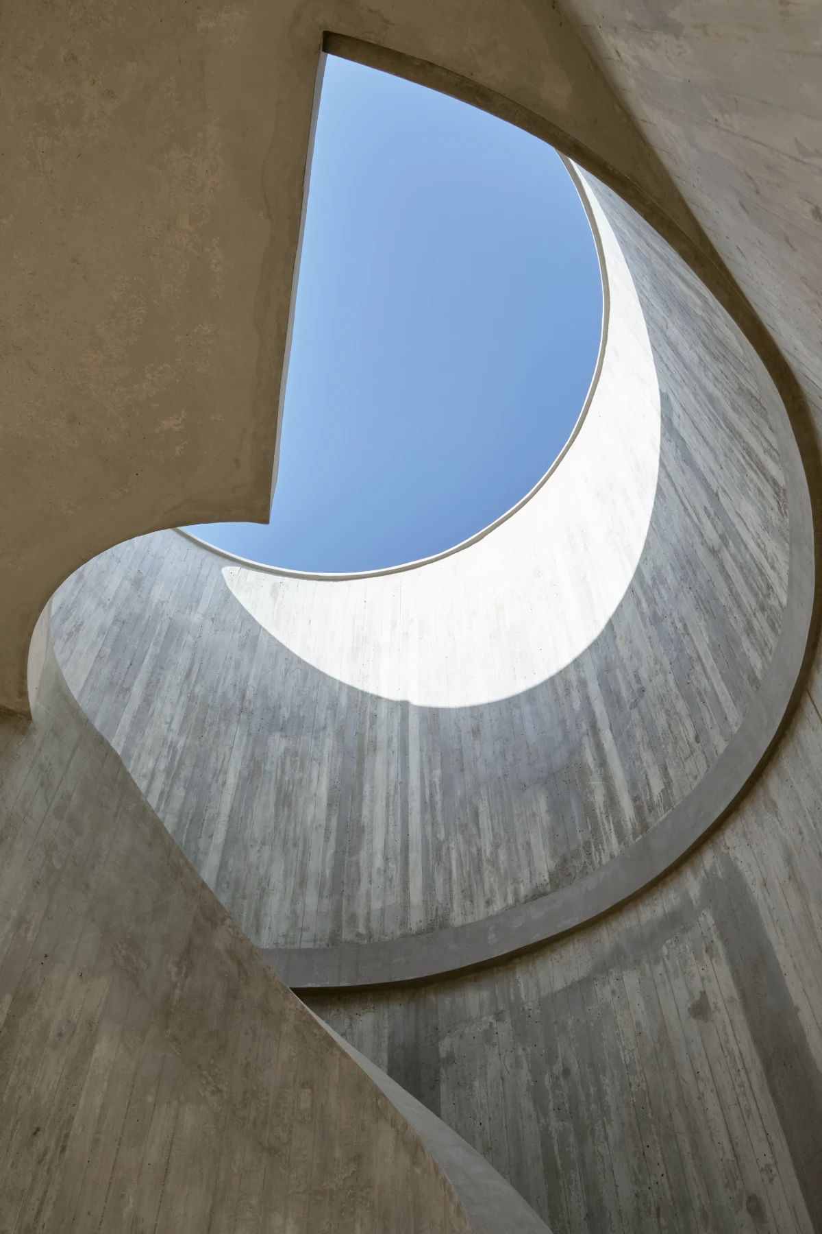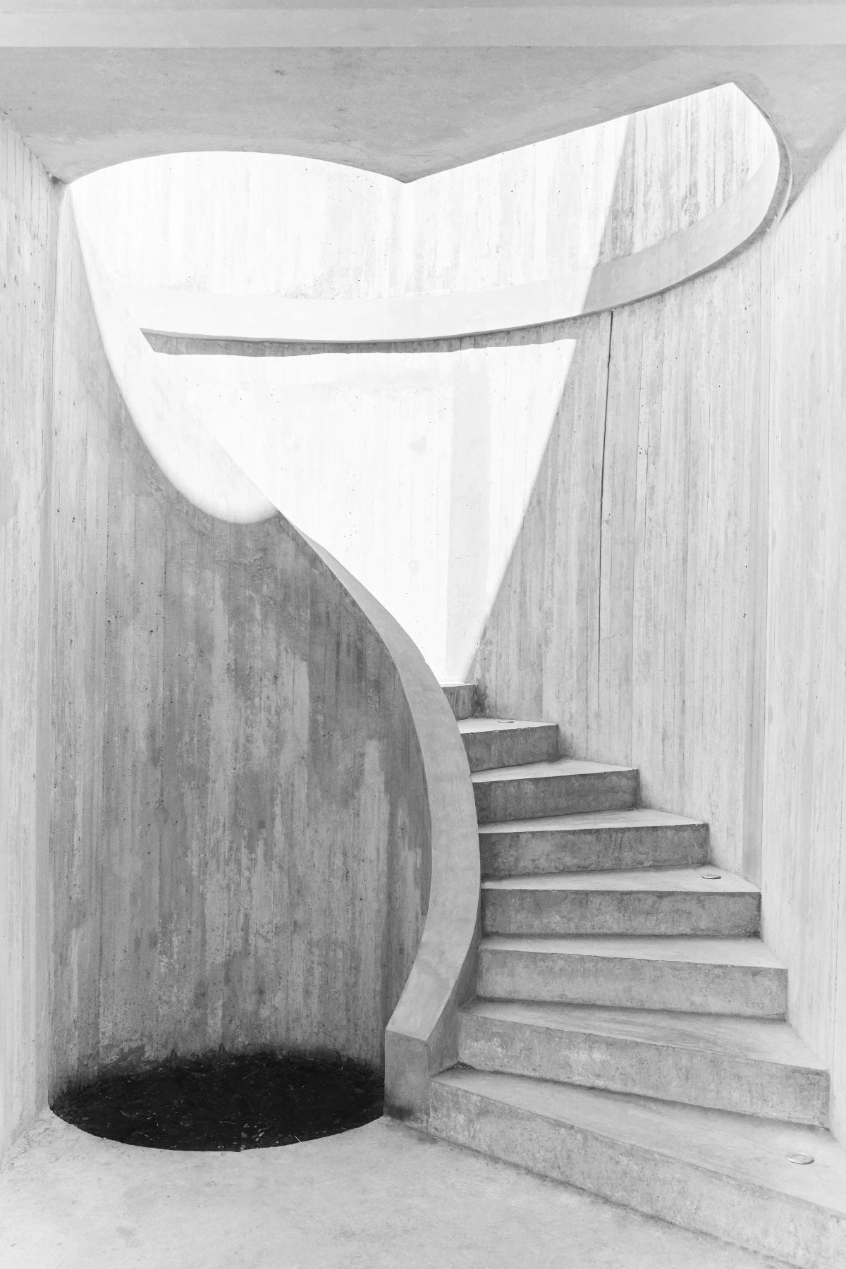 The design is organized around a grid of nine quadrants: eight peripheral wooden quadrants and one central circular concrete quadrant, which is elevated to serve as the main access point to the house. This entry is defined by a sculptural element—a project in itself—a helical staircase that anchors the composition. The house is lifted above the ground both to preserve the native flora and to maximize 360-degree panoramic views of the surrounding landscape.