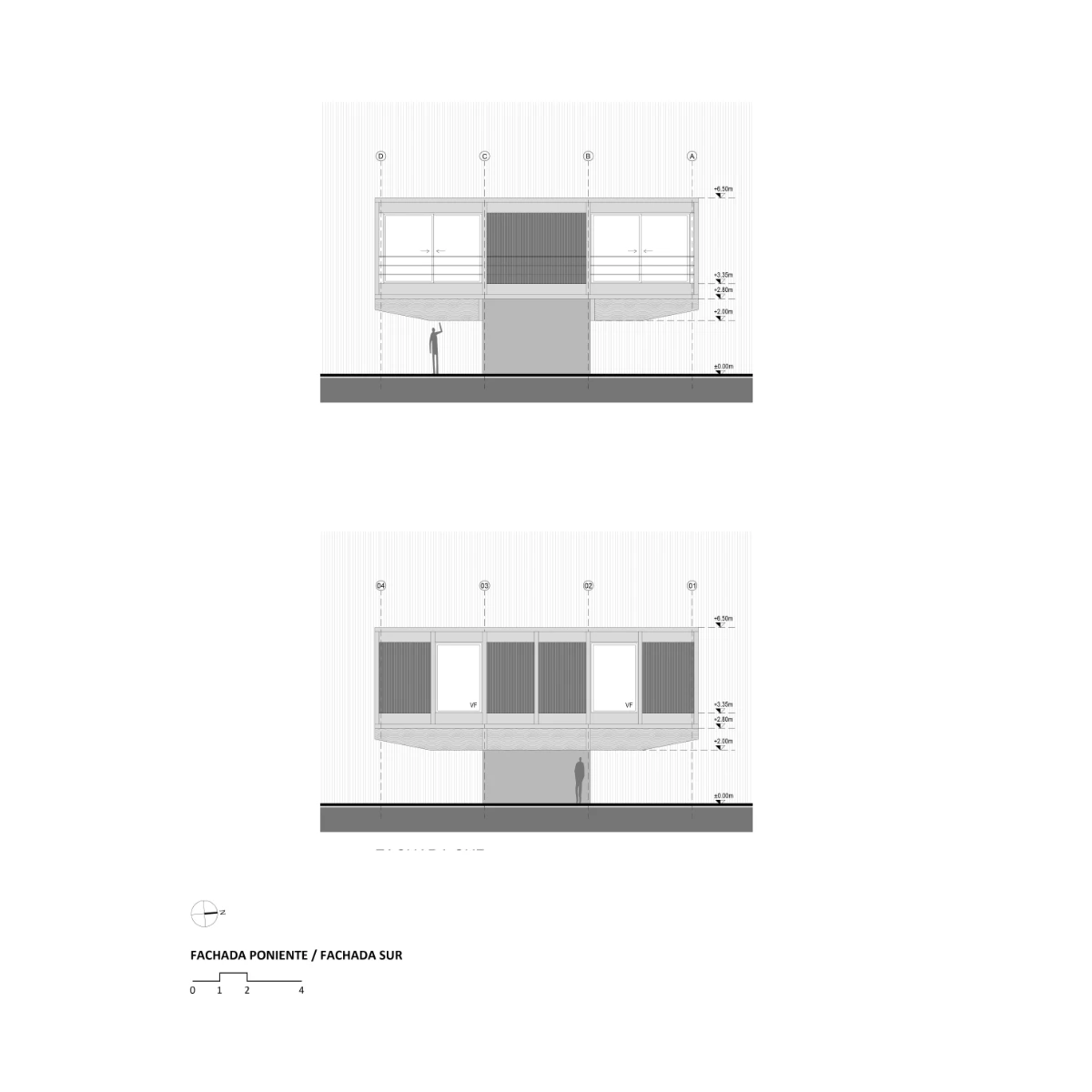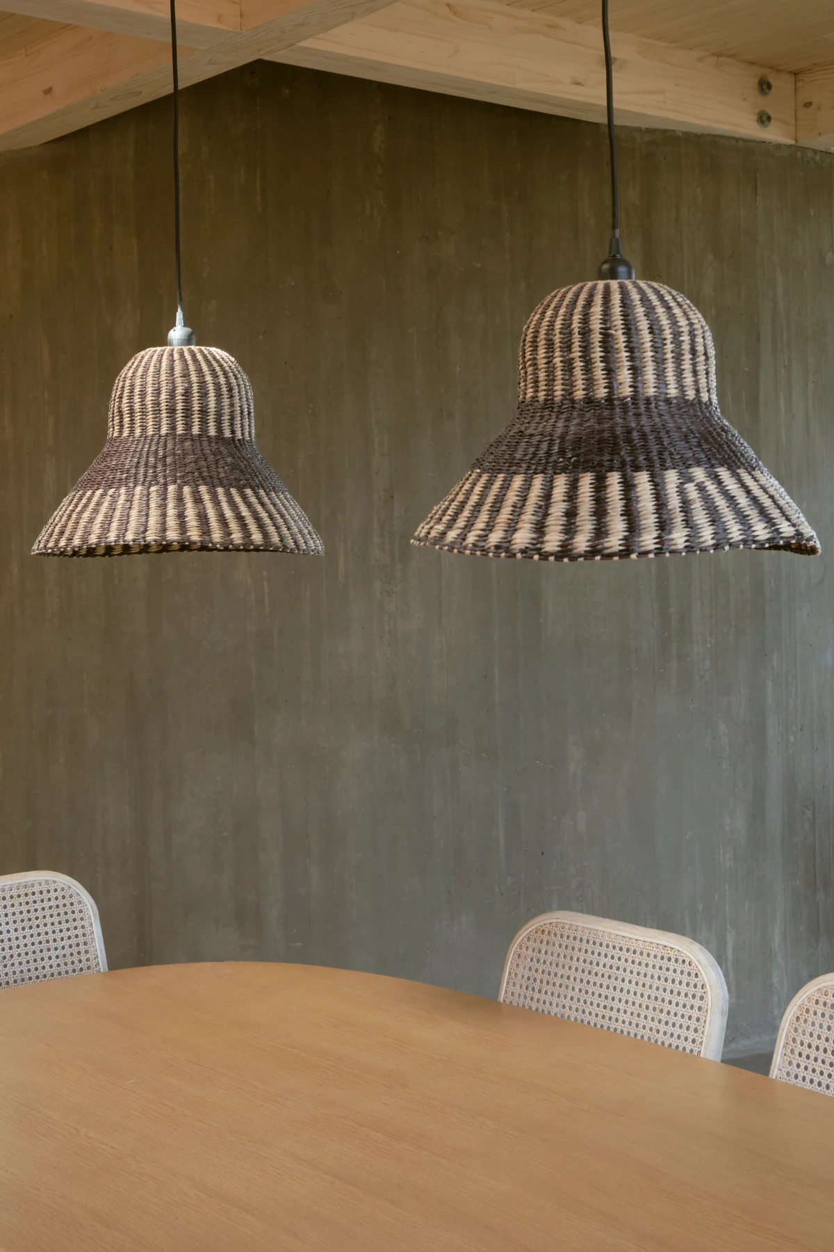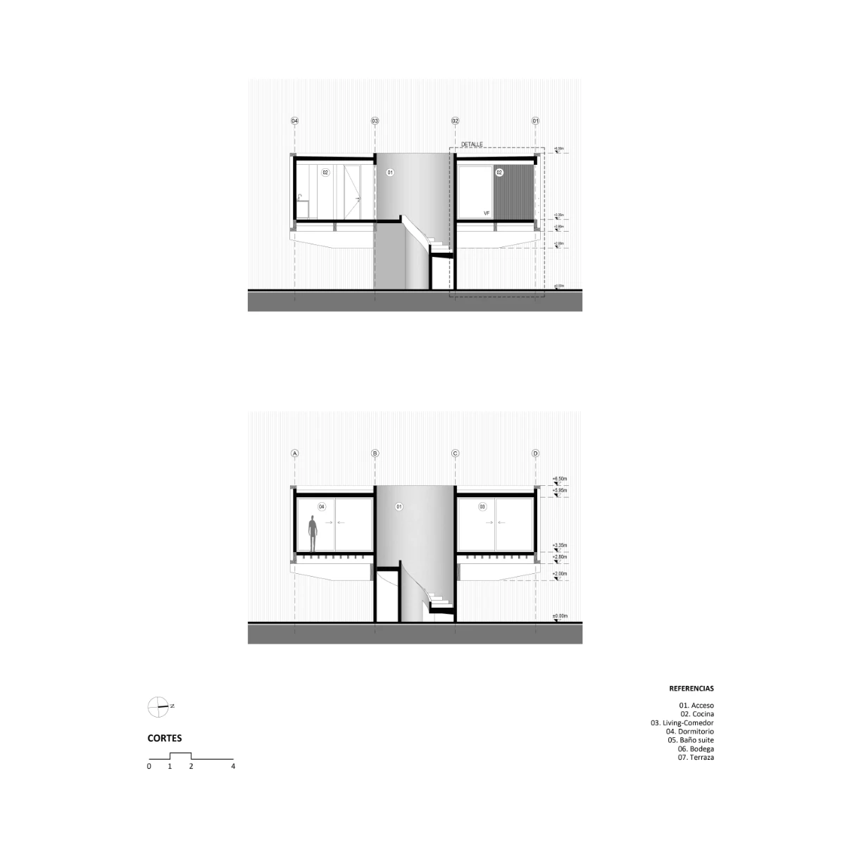 The primary structure consists of glulam timber beams that rest on the central reinforced concrete core. Secondary beams of smaller section are laid across the primaries, and atop them, a series of purlins complete the elevated structural framework of the main level.