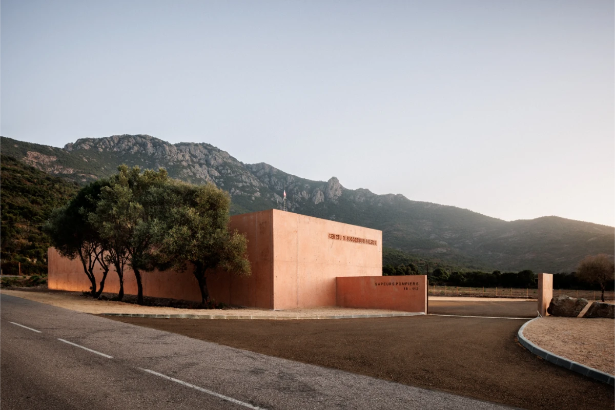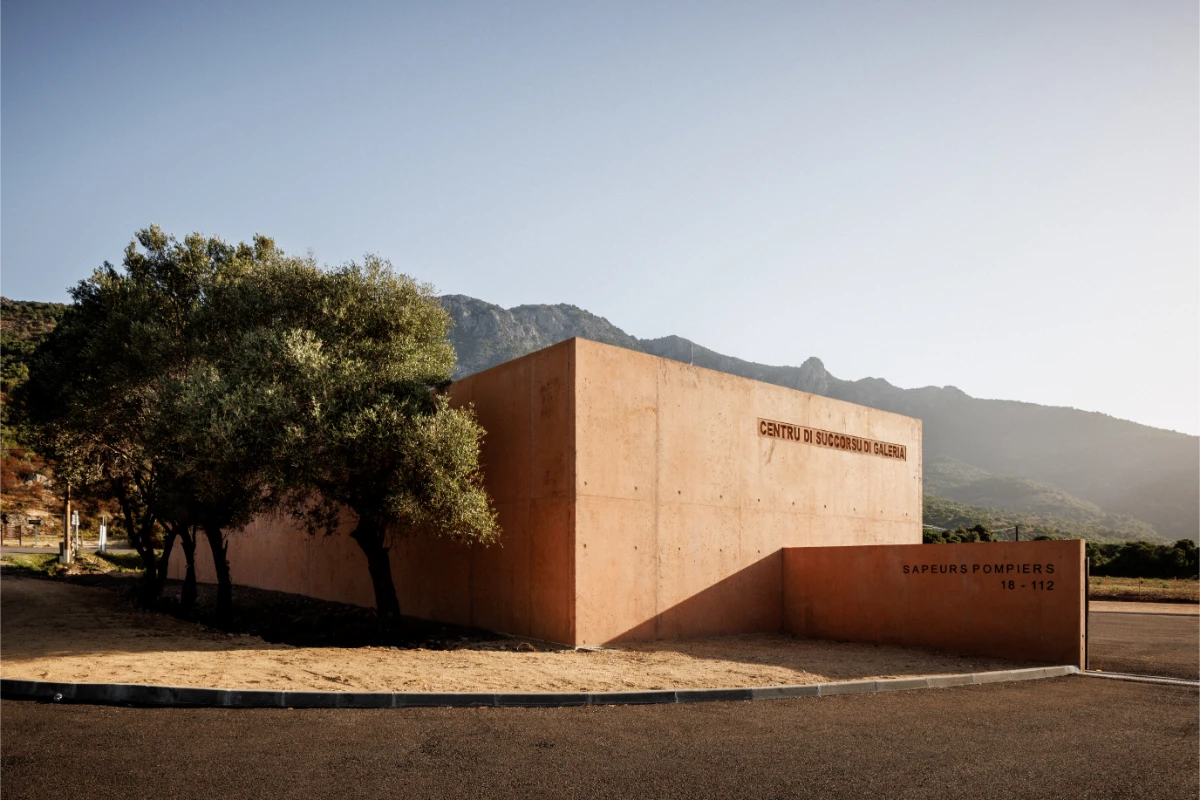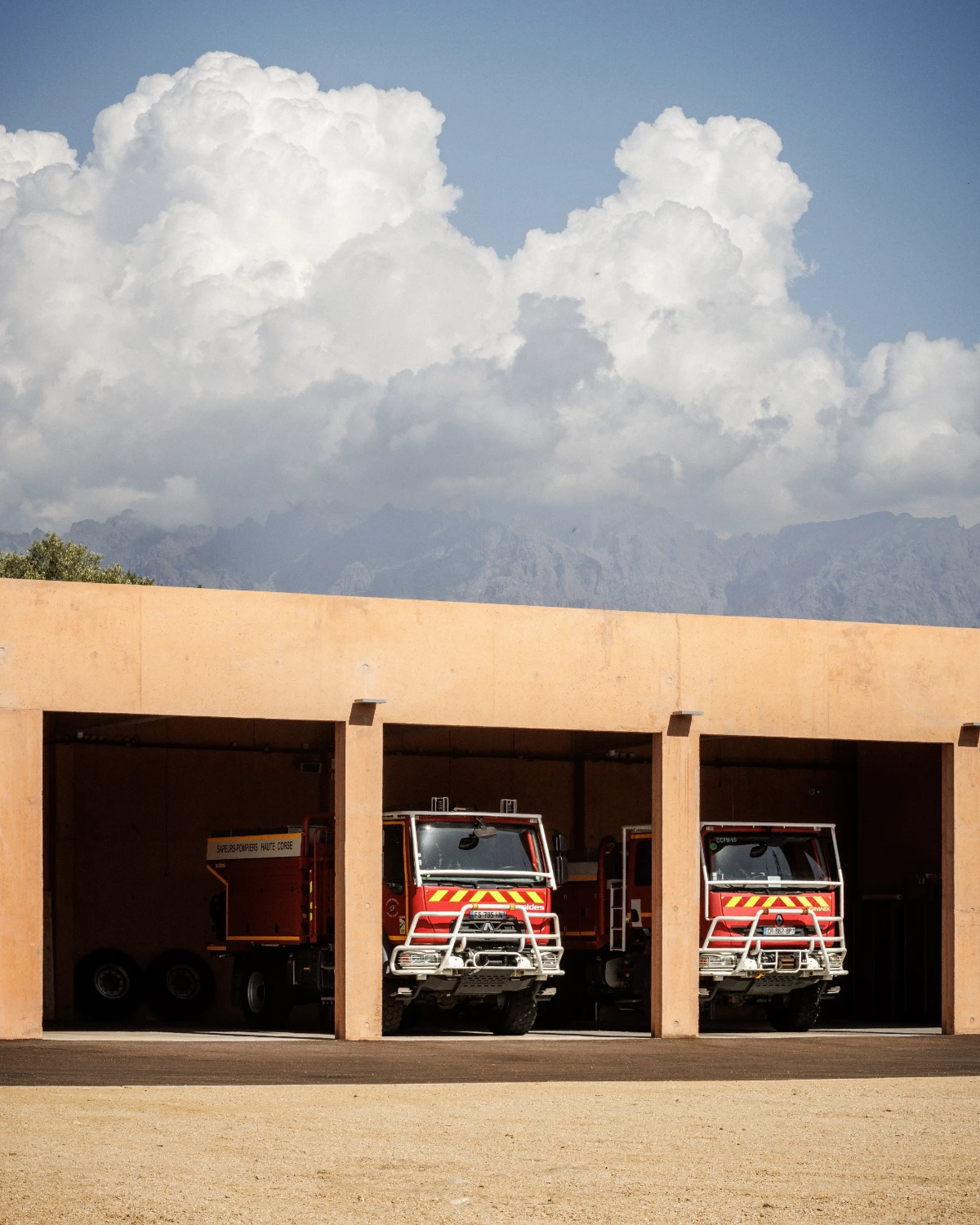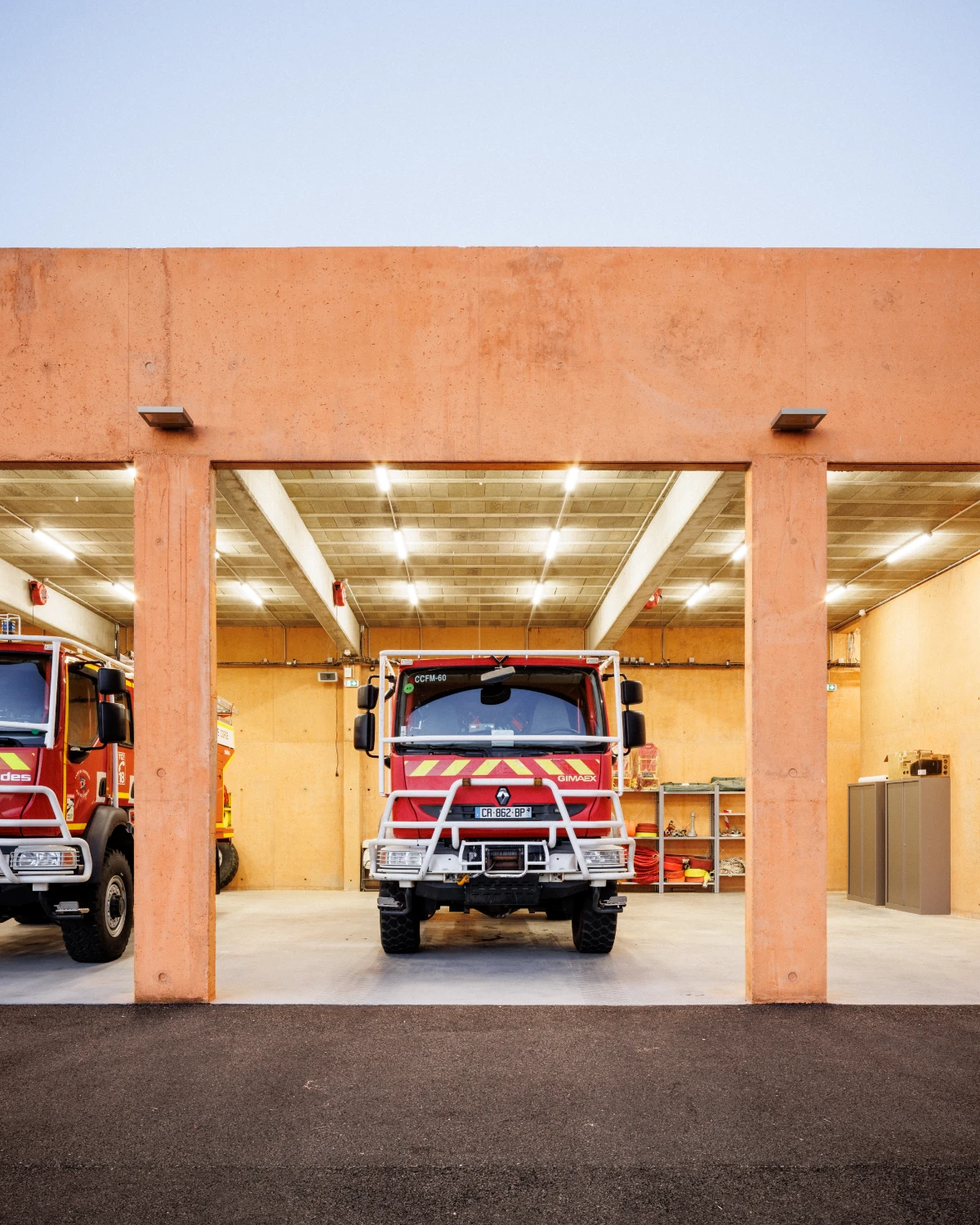 The landscape integration guided the search for plasticity. The sloping topography allows for a semi-embedded building, reducing its impact on this remarkable site. A work of material, here tinted concrete in the mass that takes on the colors of the site’s minerals (rhyolite and red pyrite), contributes to the integration and affirmation of the building. Like the rock that composes the landscape, the concrete is sculpted in the mass to offer users and passersby, residents, and visitors, an integrated, functional, and identifiable fire station.