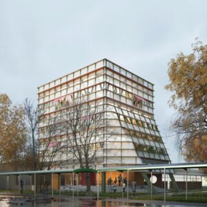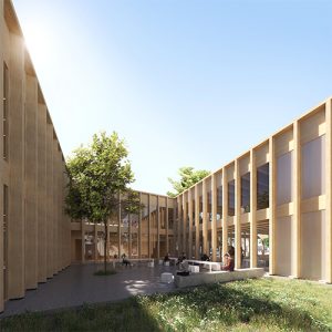 The building’s construction relies on a predominantly wooden structure, with minimal use of reinforced concrete limited to the foundations and semi-buried lower level. Stability is achieved through a combination of wooden box slab floors, metal bracing, and cross-laminated timber cores. Natural ventilation and energy efficiency are integral to the design. Clerestory windows and mechanized openings allow continuous airflow, cooling the building in summer and providing passive solar gain in winter. The north-facing façade, extensively glazed, ensures ample daylight while leveraging cooler park-side air for natural cooling. The integration of architectural, structural, and environmental strategies enhances the building’s functionality and its connection to the surrounding campus, creating a harmonious and sustainable addition to La Sallaz.