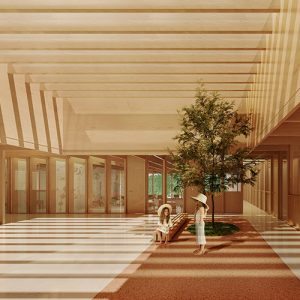 +1 and +2. Above, the classrooms are arranged along a bright, spacious hall that faces the park. This generous central area, oriented towards the cedar tree, serves as hubs for socialization and community within the school, enriched by filtered light through the surrounding vegetation. The classrooms align along the southern façade, benefiting from natural light and views. Service blocks subtly define circulation areas, housing staircases, cloakrooms, and multifunctional spaces. On the first floor, a multifunctional room extends from the classrooms, with direct outdoor access provided by an external staircase.