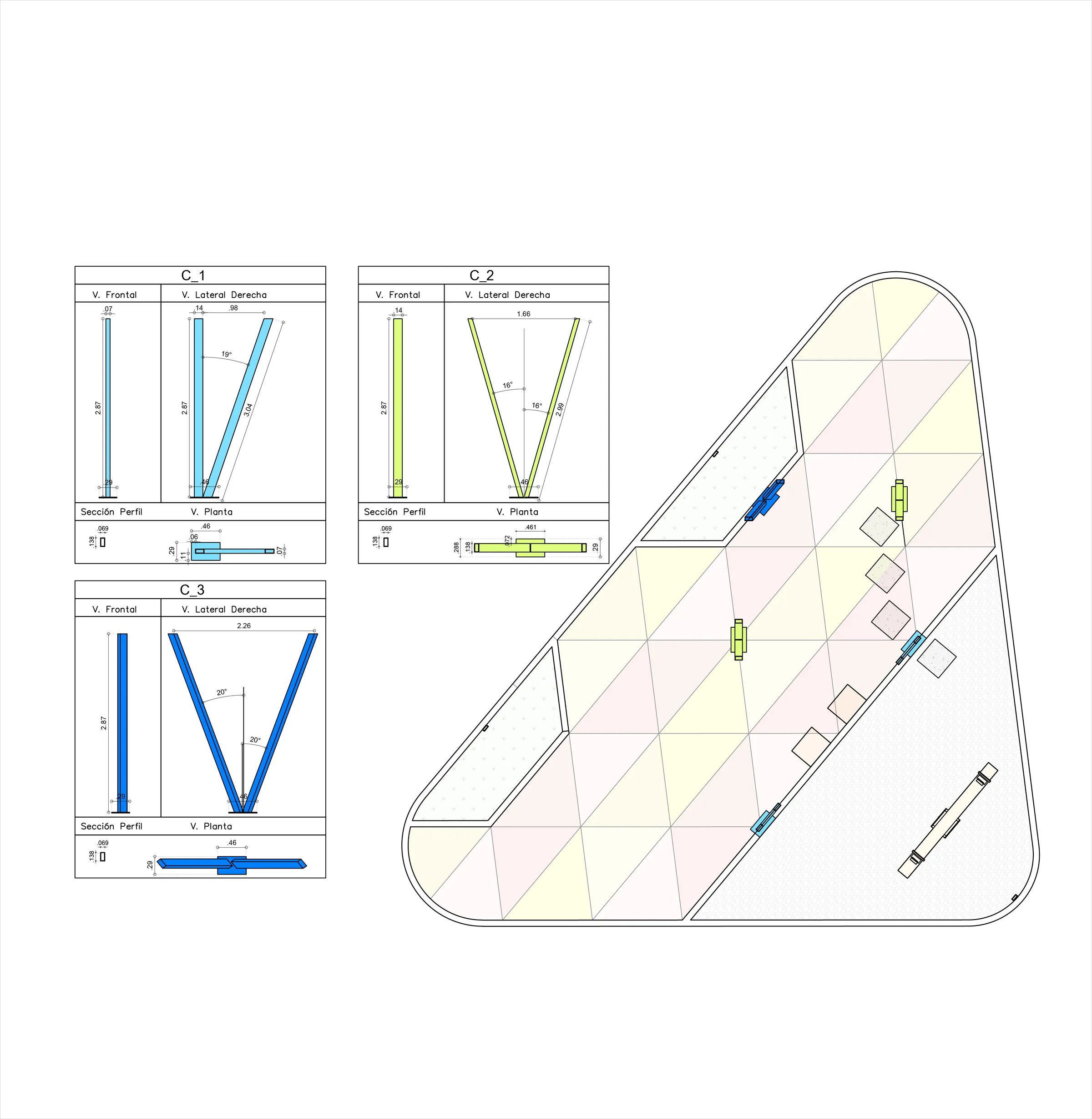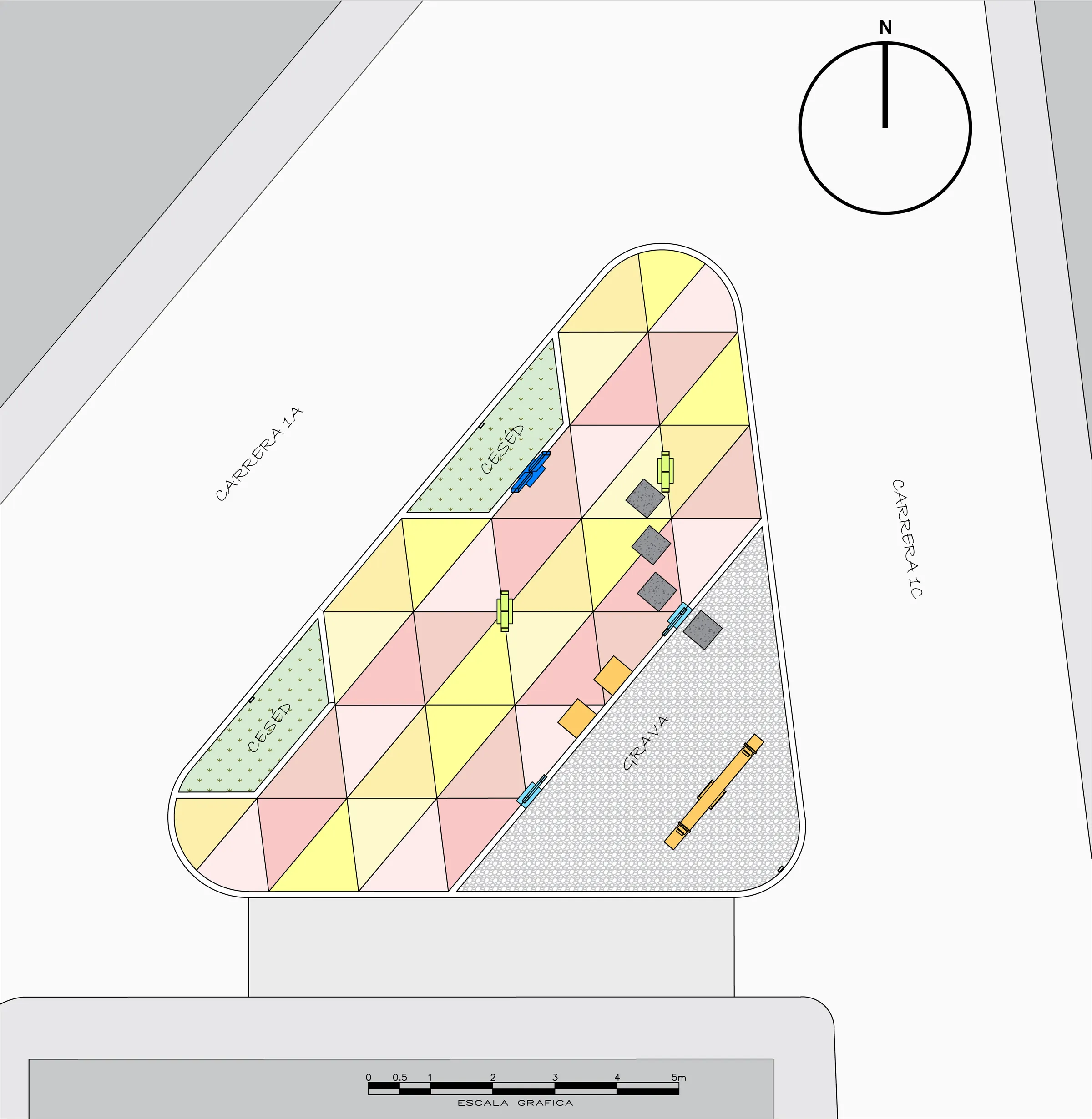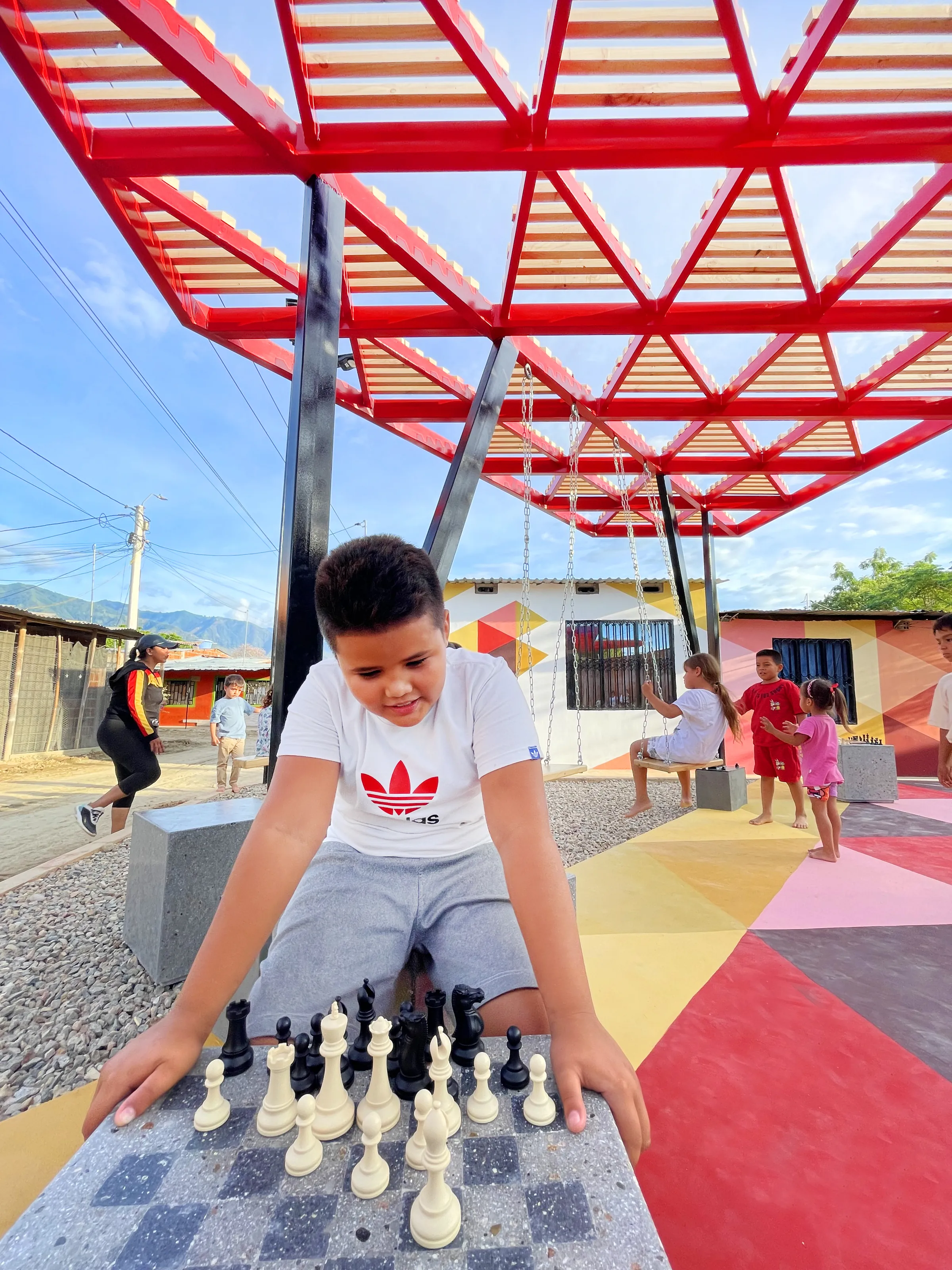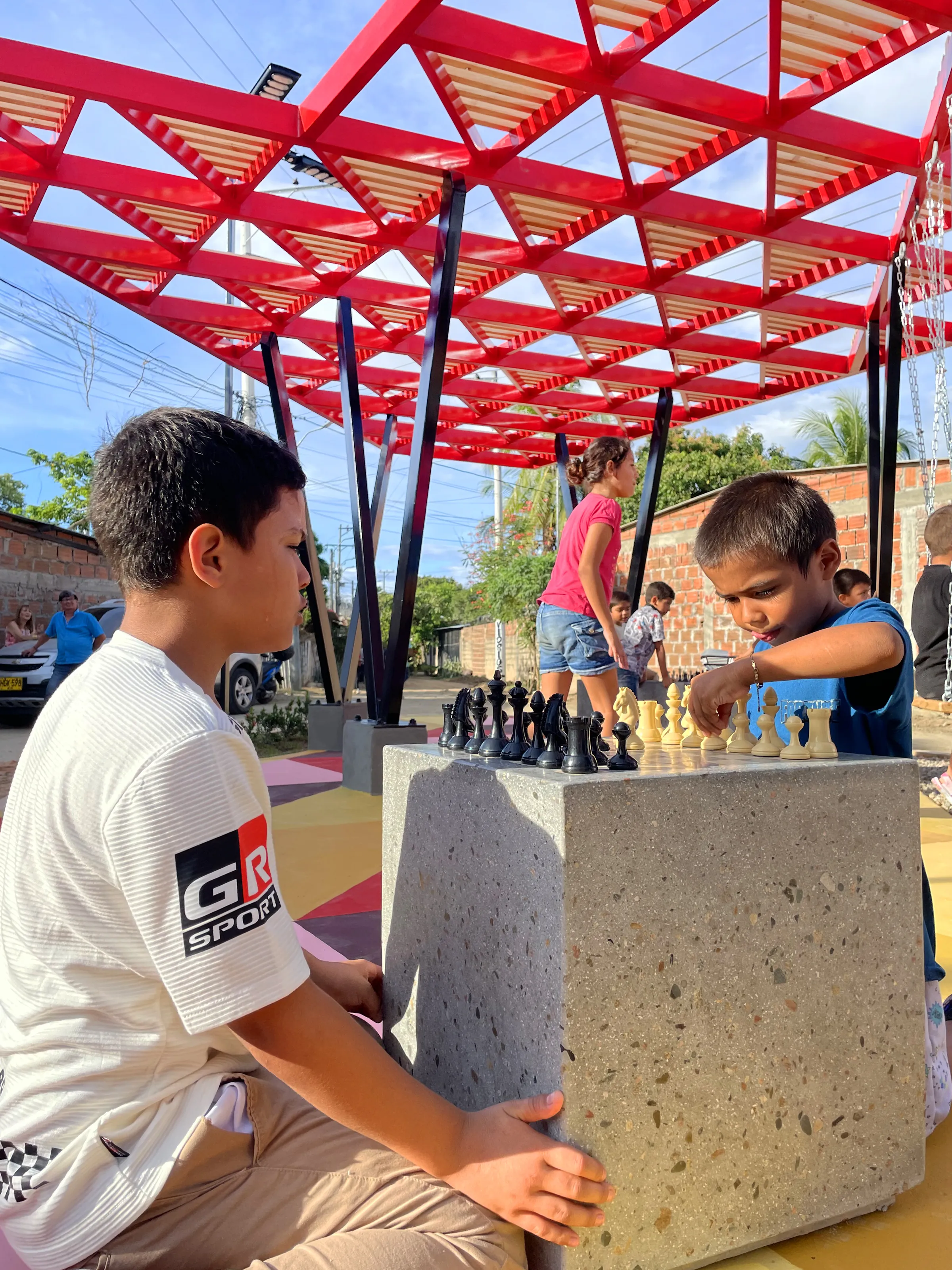 The space was organized with a balance of 50% hard surface and 50% green areas, incorporating planters and lawns with native, low-water-consumption species. Ten cubes emerge from the slab: five serve structural functions and five become urban furniture, including benches with chess boards. The triangular pergola, elevated to 2.60 meters and fragmented to optimize solar control and ventilation, provides shade throughout the day and thermal comfort under Neiva’s warm climate.