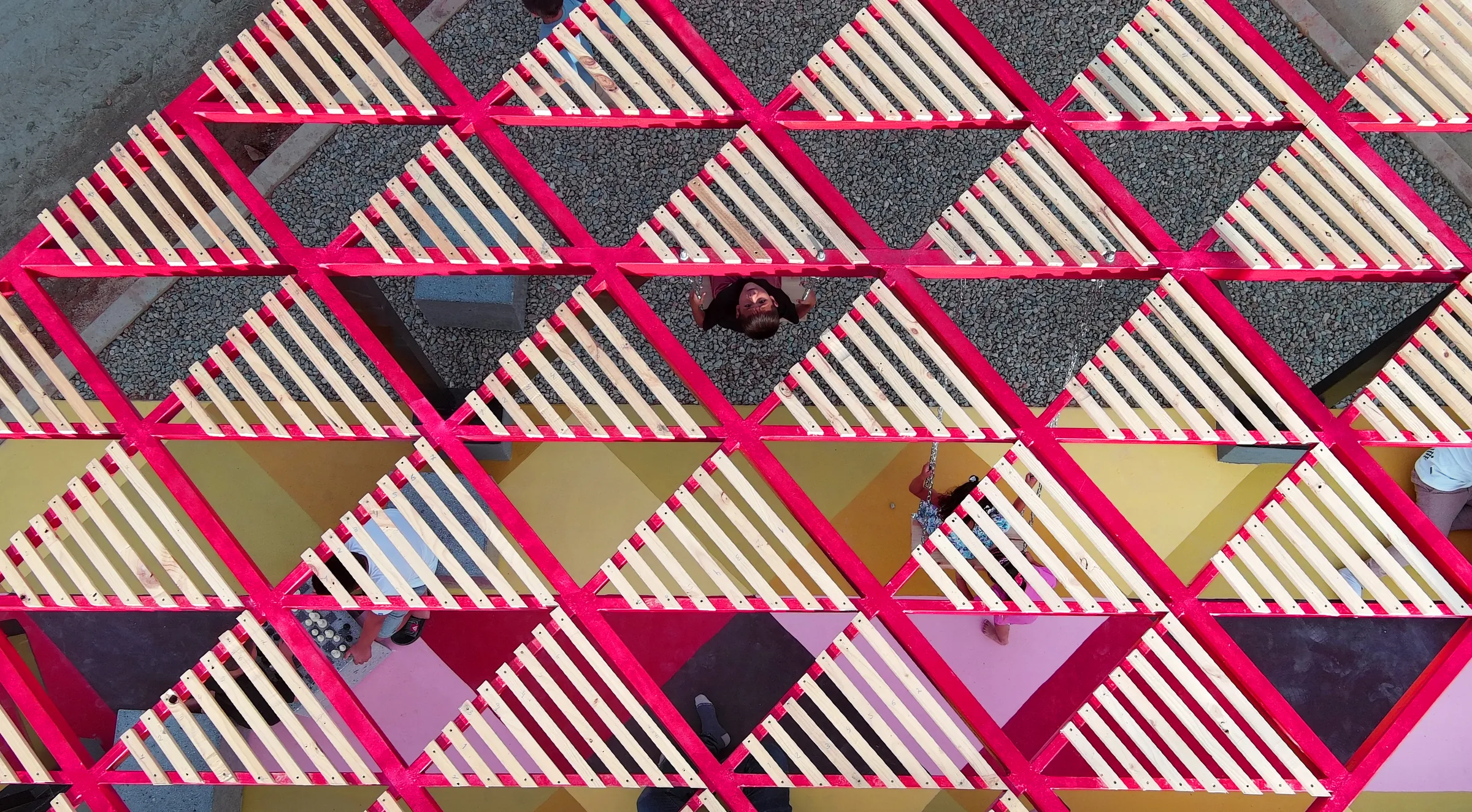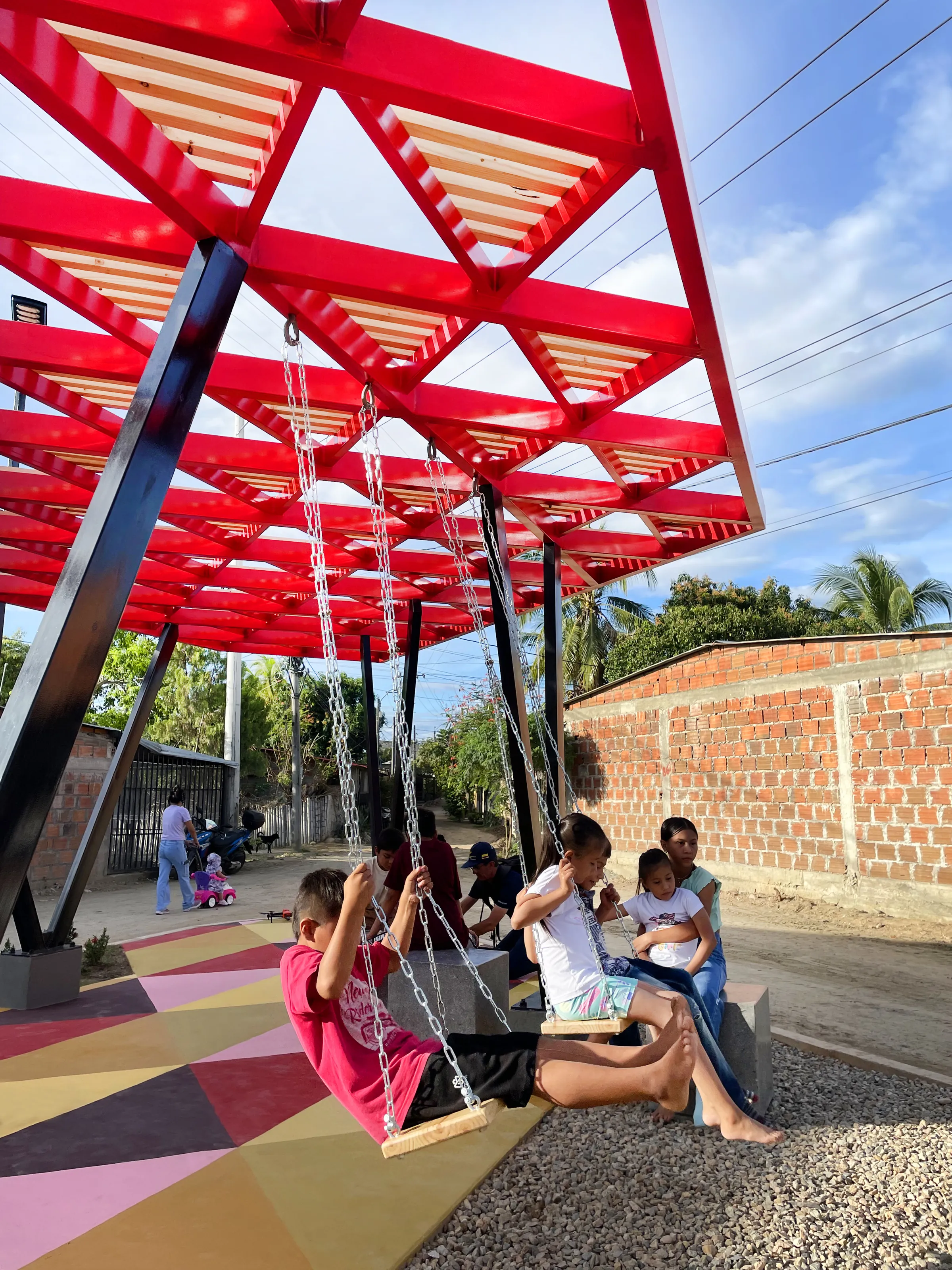 Color played an essential role in the process. A palette of reds, yellows, whites, and blacks was collectively applied to floors, columns, and a community mural, consolidating an aesthetic that reflects the neighborhood’s identity and sense of ownership.