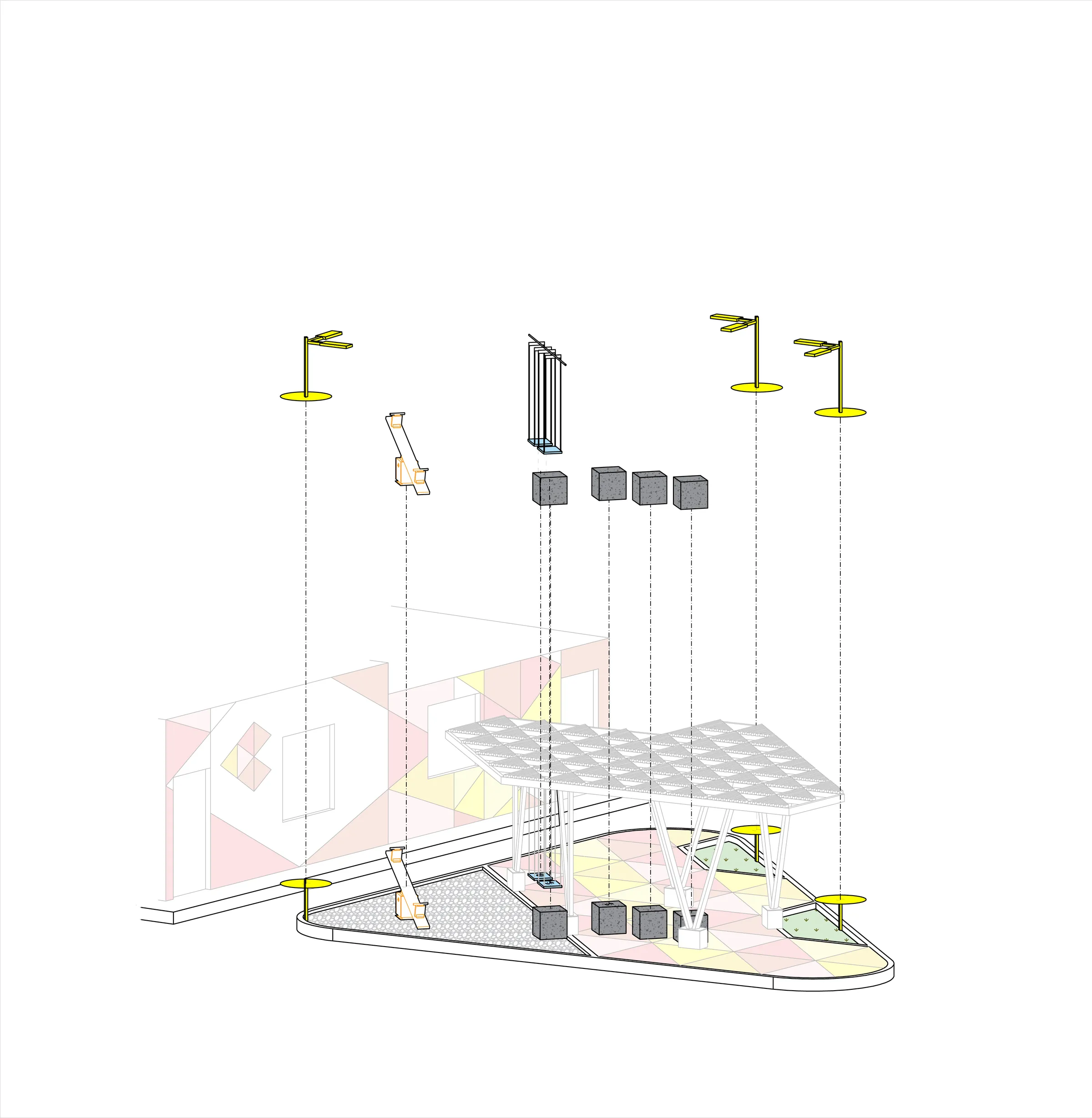 The inspiration arose from the geometry of the site. The triangle, initially perceived as a limitation, became the conceptual matrix of the project. From this form, the hard and green areas, furniture, pergola, and columns were organized. What could have been a simple park was transformed into a symbol of collective identity.