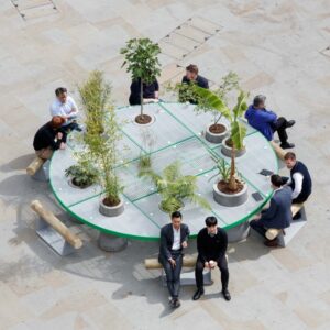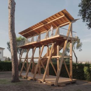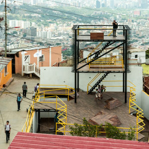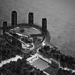 It offers a semi protected space of vague programmatic functions underneath it- a place for open discussions, a sculpture garden, a shaded place to relax in a hot summer day, a space for small open-door concerts, separated from the park just by a metallic curtain.