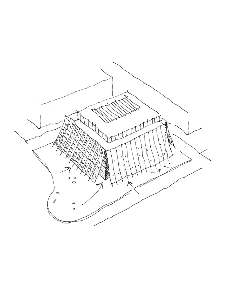 Guided by the Mediterranean sun and the rhythms of the palm grove, the architecture responds with clarity and restraint. A compact volume rises from a solid base, opening itself to light, air, and public space. Its vegetal veil—crafted from esparto—recalls ancestral wisdom, filtering sunlight as it once did in vernacular homes, while redefining it through contemporary expression.