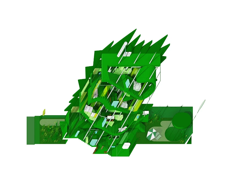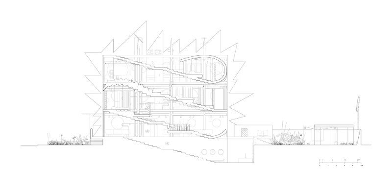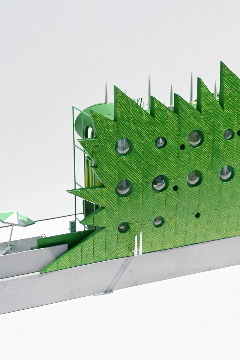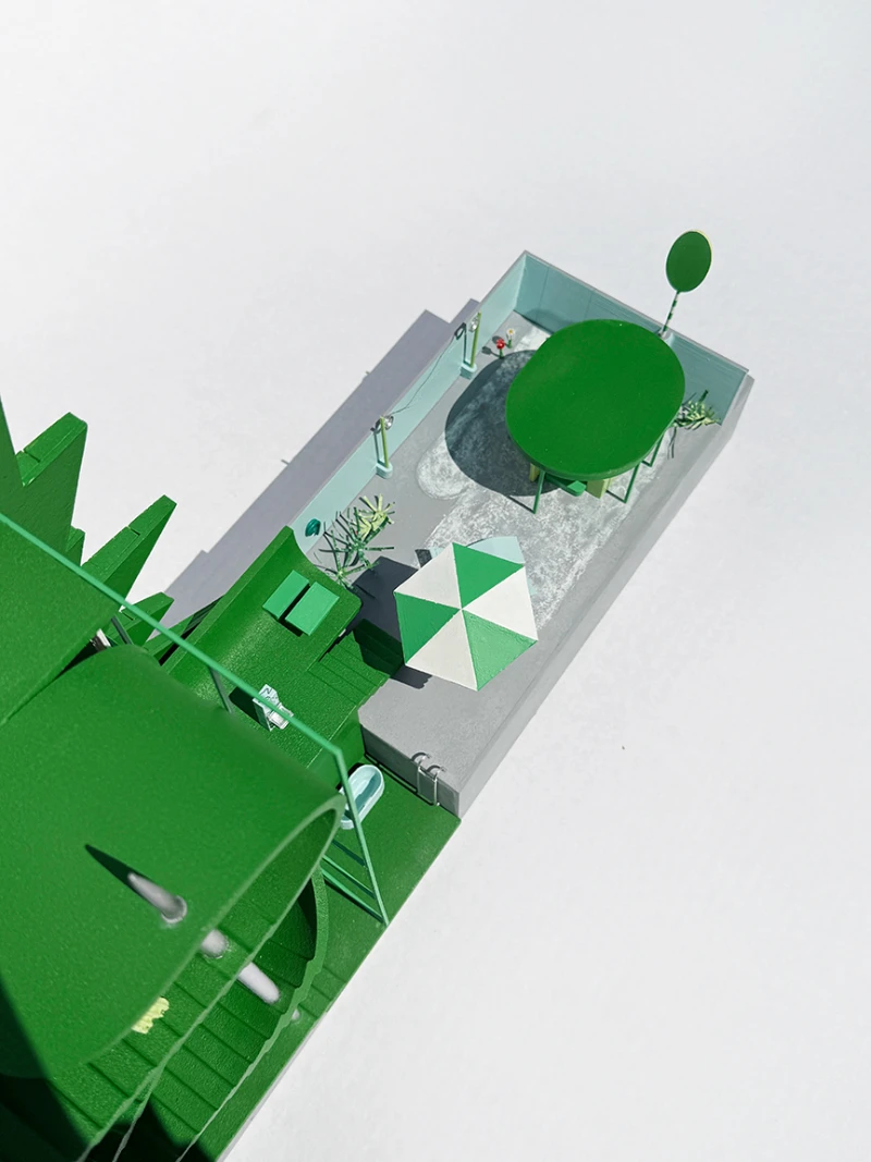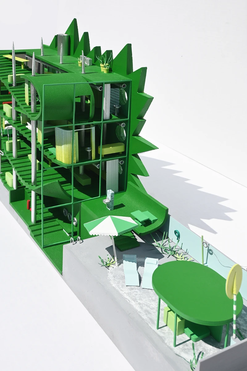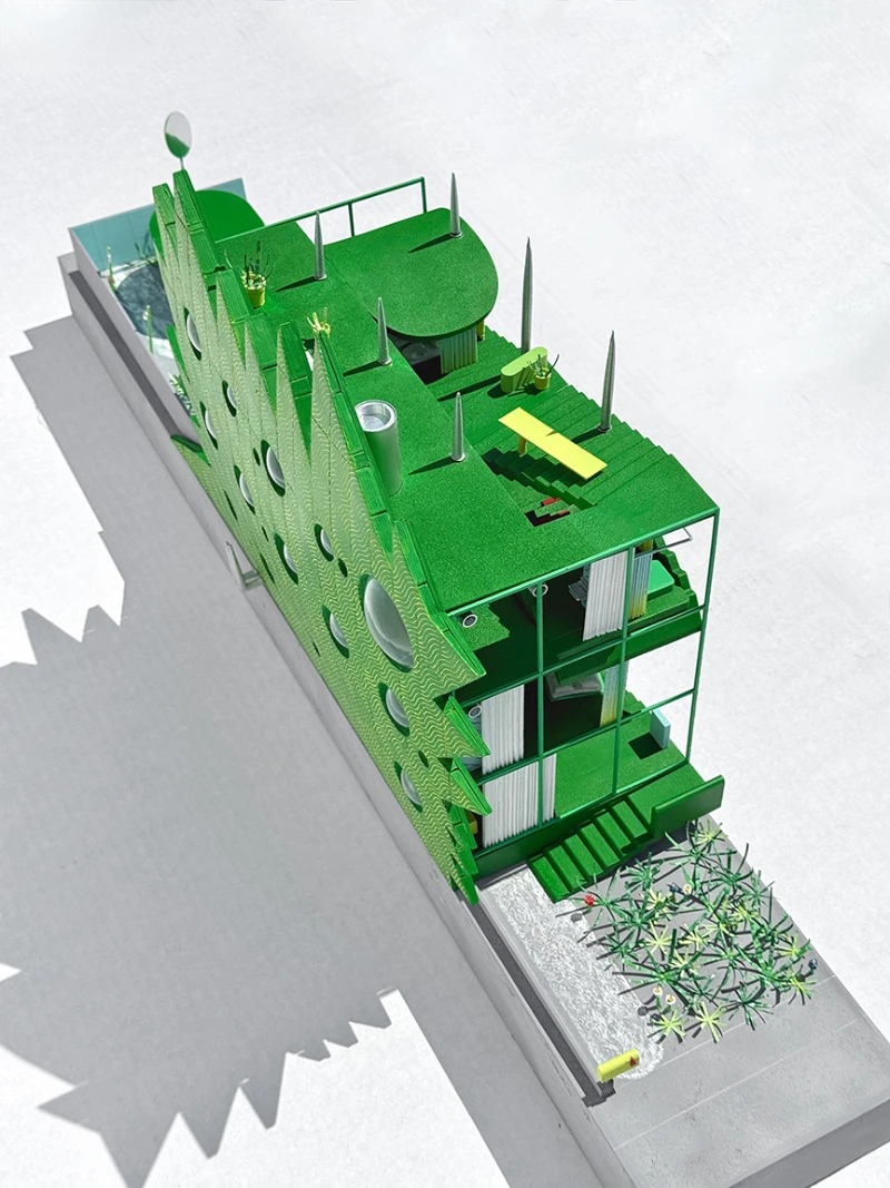 The project is conceived for a group of artist friends in Toronto. A series of interviews provided us with the programmatic structure of the building, and a series of priorities for each: to develop romance in the quotidian; independent zones with their own areas for food preparation; private spaces with sonic separation for sleep, sex, and retreat; and shared spaces for hosting, rehearsing, partying, and work.