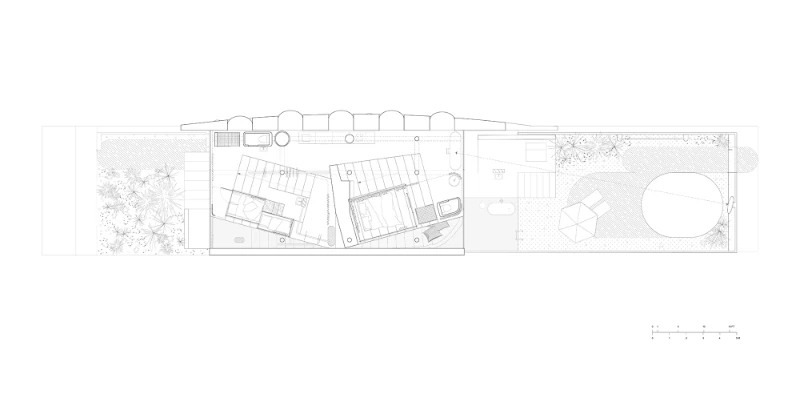In this home, beds materialize pavilions of privacy and appear, stretch, and multiply to conform to the relationships they serve. For instance, one sleeping zone gathers two beds together in a contiguous, stepped arrangement. This accommodates togetherness and distance: both conditions can be enacted when additional partners visit and spend the night.