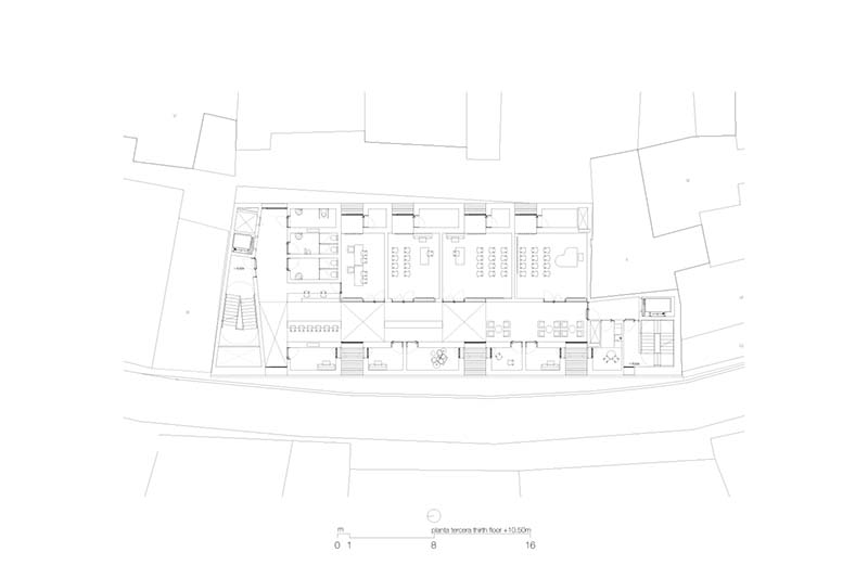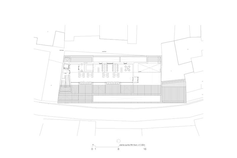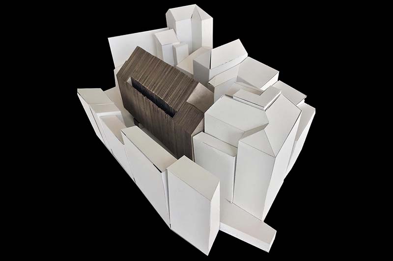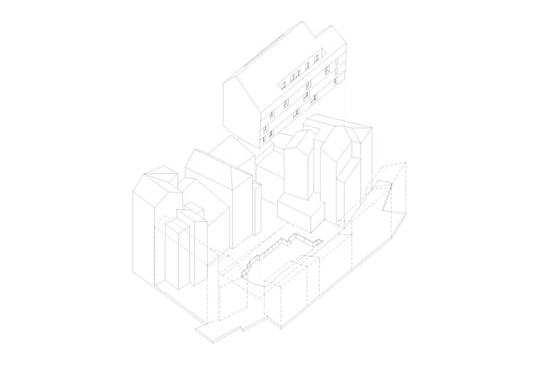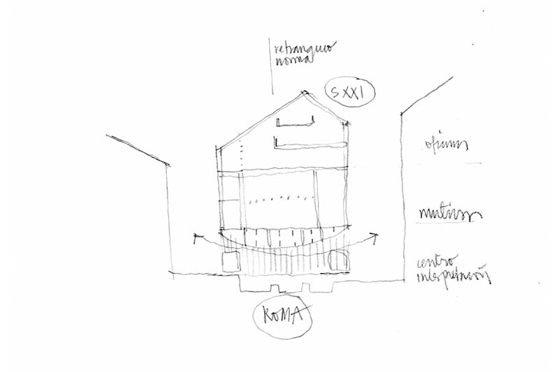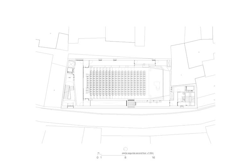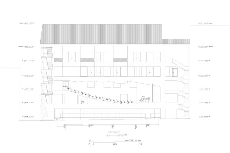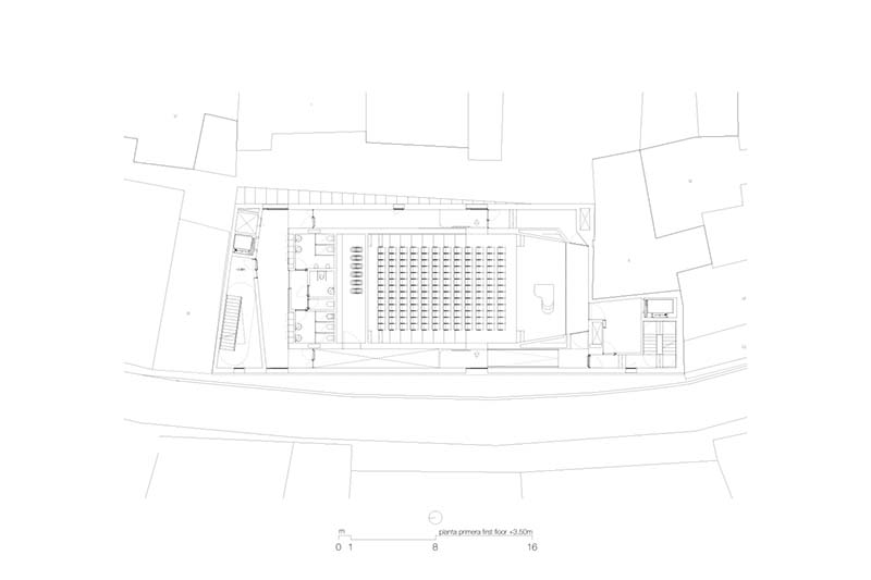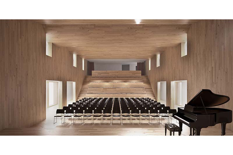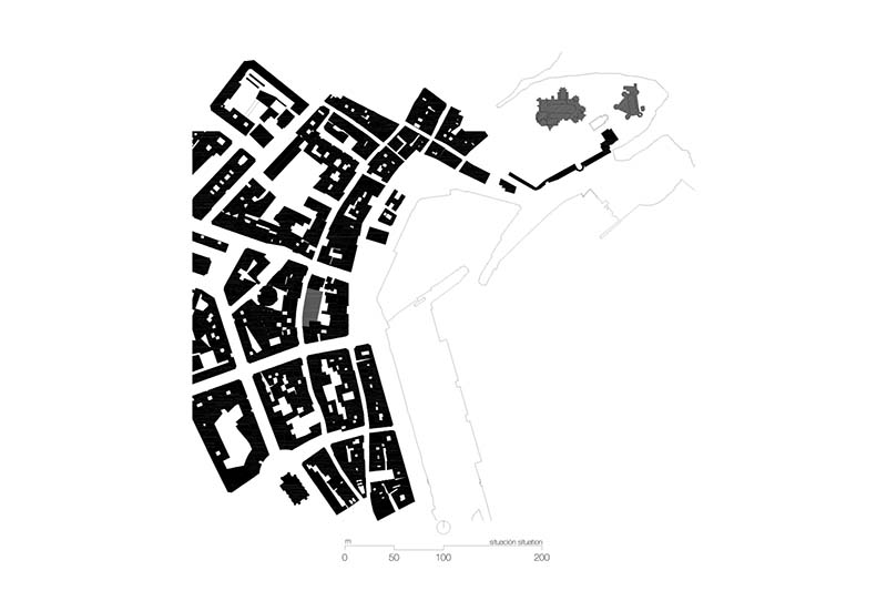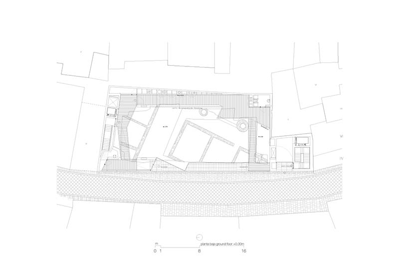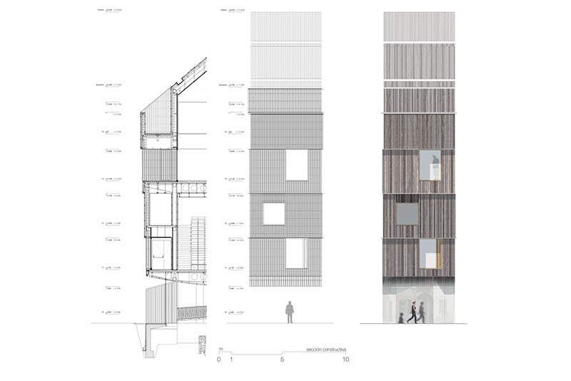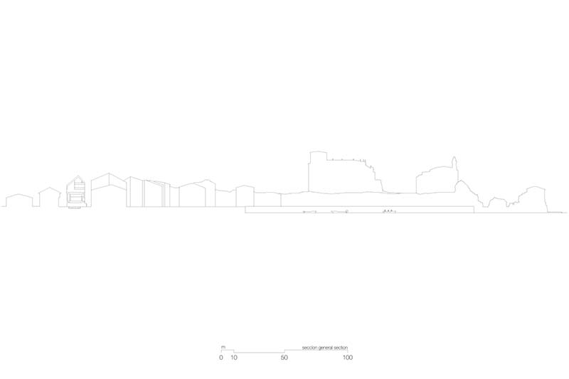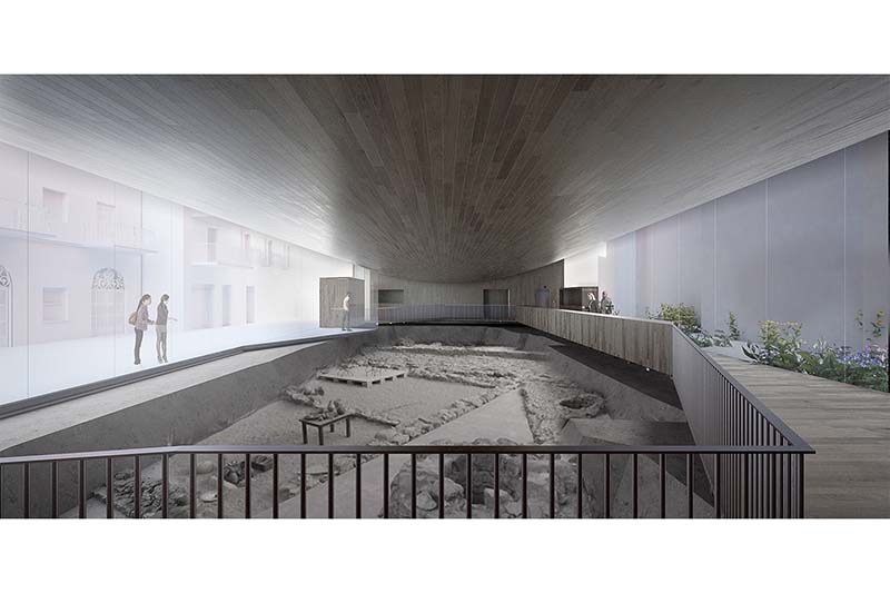 The building is designed to be gently floating over the existing Roman ruins of Flaviobriga, in order to hold a Music School at the same time that allows to keep studying the archeological site. The project is a sort of a wooden massive volume which brings back the local memory of Castro Urdiales, a town close to Bilbao whose history is tied to the construction of wooden fishing boats. With a titanic structural effort, the volume only touches the ground in a few supports on both far ends, allowing continuous transparency towards the existing interior courtyard at the back of the site. The street level is a public interpretation center devoted to study and disseminate the ancient history of the city. The second floor provides an auditorium to be shared by the municipality and the Music School at the upper levels. The building seeks to be effective and radical in its approach, although humble and sensitive in its materialization, and the interior spaces are flexible enough to be able to transform into other program needs in the future. The façade, covered in dark grain wood, hides several courtyards and interior voids which in addition to provide natural light, will allow the music to gently.