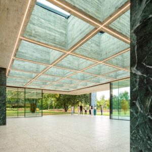 A shaft collects precipitation and conveys the water diagonally through the building to the reservoir below. Cooling ribs in the shaft and the rainwater collected in the reservoir ensure that the data centre is able to keep its interior cooled to the required 25 to 30 degrees Celsius.