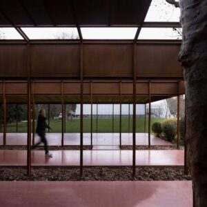 A part of this interior space is covered by a light glass roof, delimiting a solarium pavilion undercovered by a wooden grille, enabling the inhabitants to enjoy daylight while being protected from direct sun and rain. The double columns made of mirror-polished stainless steel tubes support the roof, leaving the structural axis free for the passage of a system of frameless sliding glass panels that enclose the space. The threshold moment of access occurs through an opening in the green perimeter, connecting to an existing room equipped with a small kitchen, a toilet, and an atelier. Additionally, an open area composed of wooden and grass surfaces completes the garden together with an outdoor shower. In the middle of this space, a mirrored cylinder conceals the presence of a large volume of technical ventilation, while at the same time providing space for a maintenance cabinet.