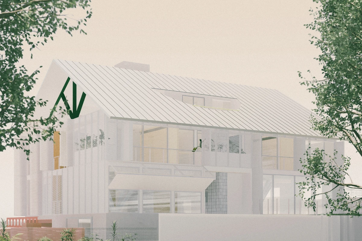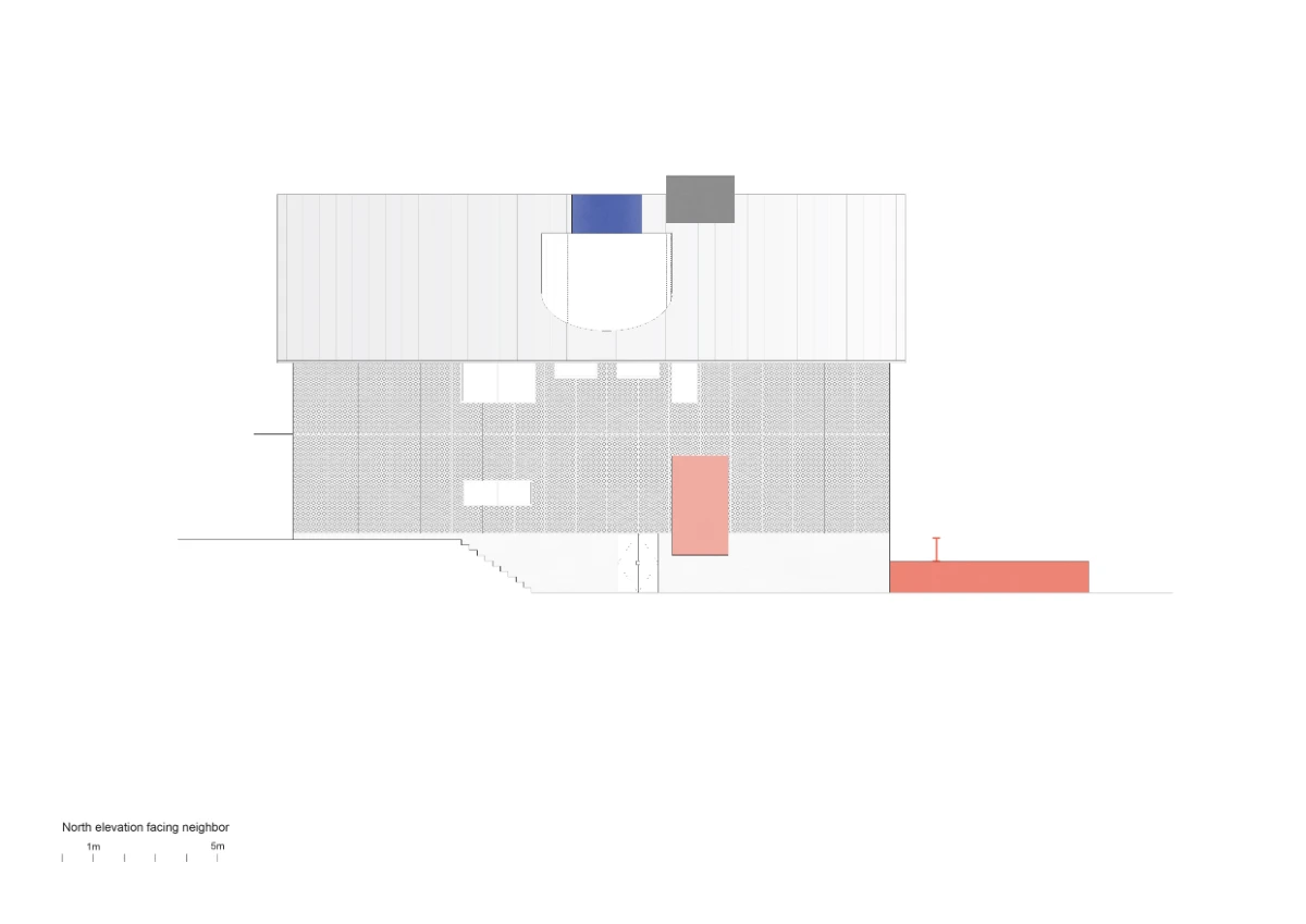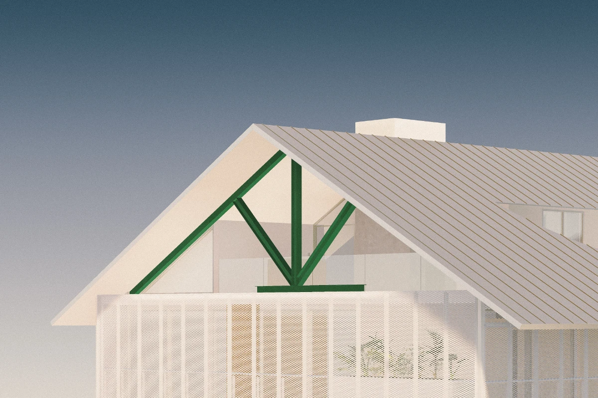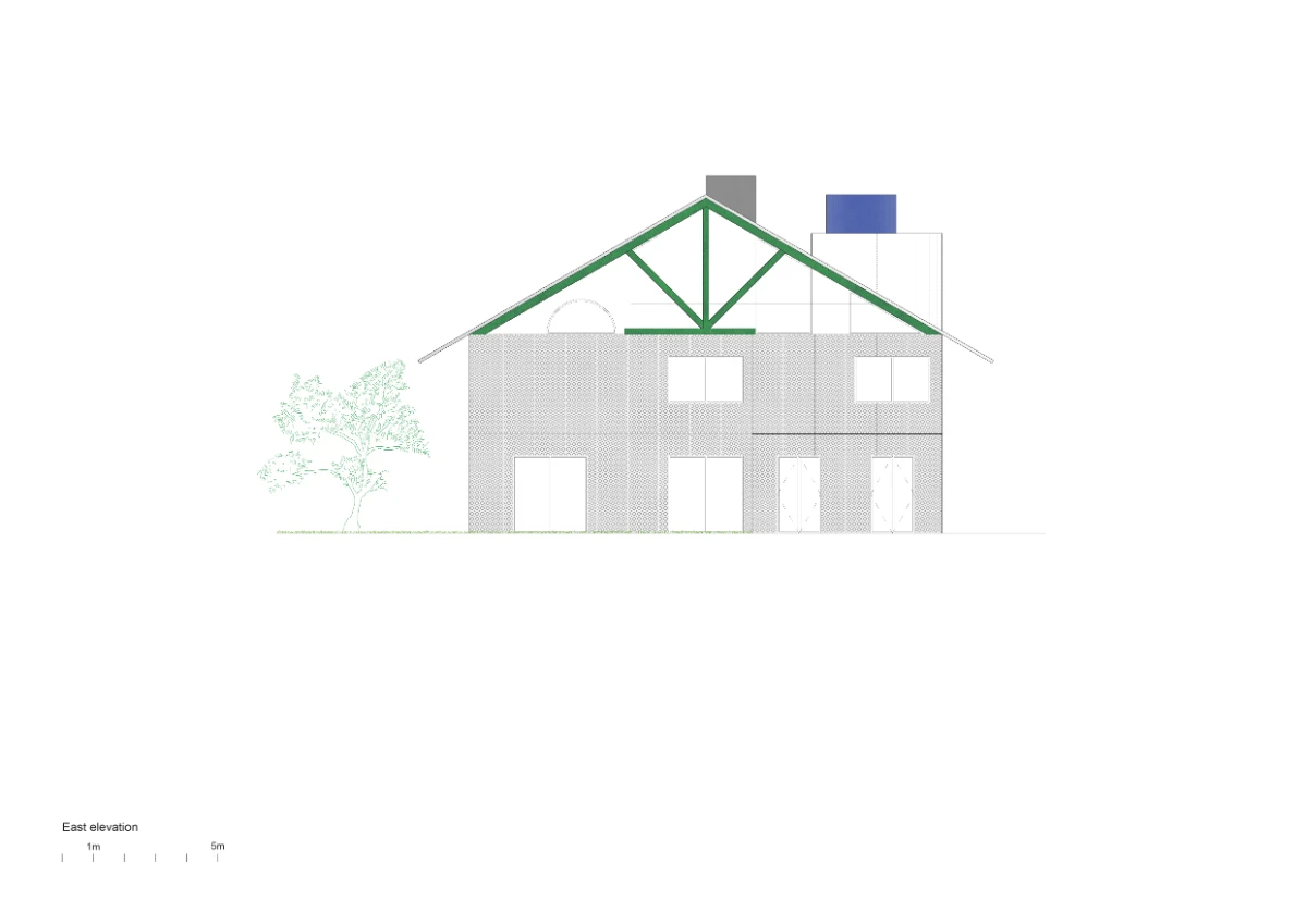 From the adjacent public park, the bigness of the house is neutralized by equally monumental raintrees, evoking an ambiguity of scale further confounded by the oversized elements of the house. A large pitched roof, with the appearance of a thin folded surface, reduces heat gain and contributes to the typological ambivalence of the house, appearing at once prototypical and idiosyncratic.