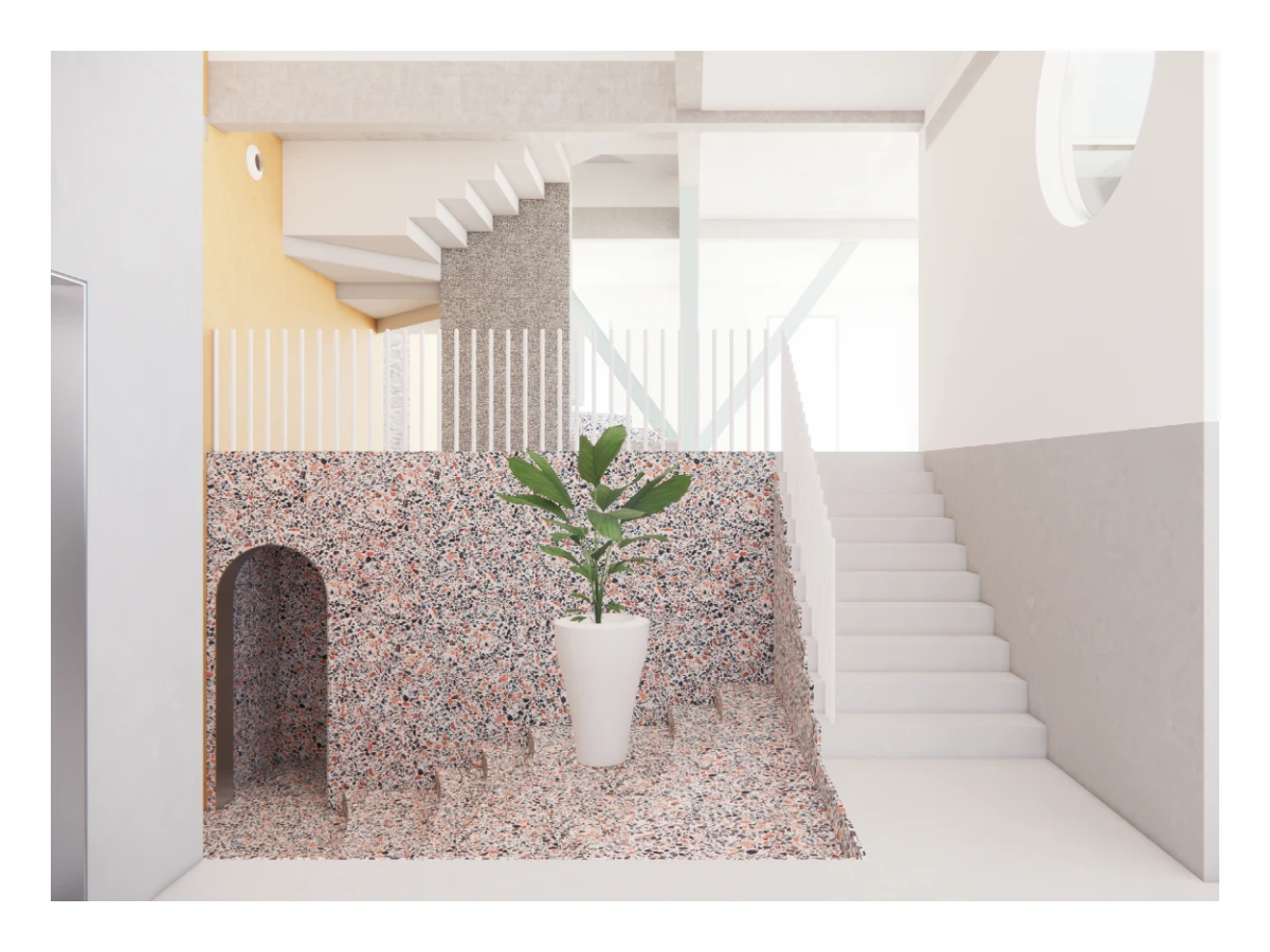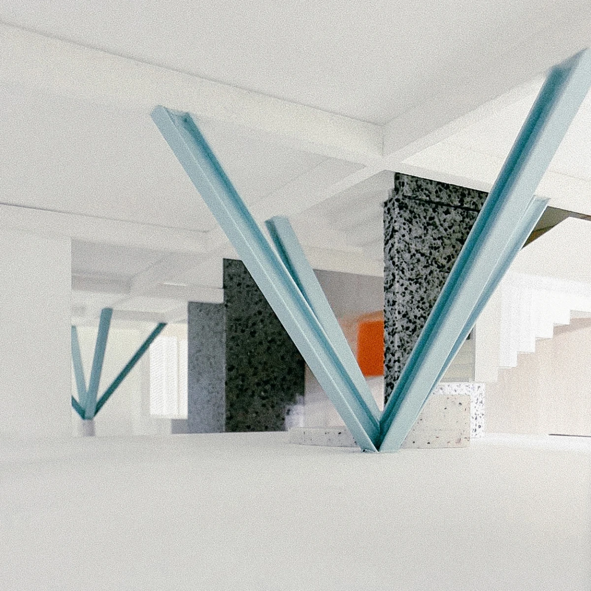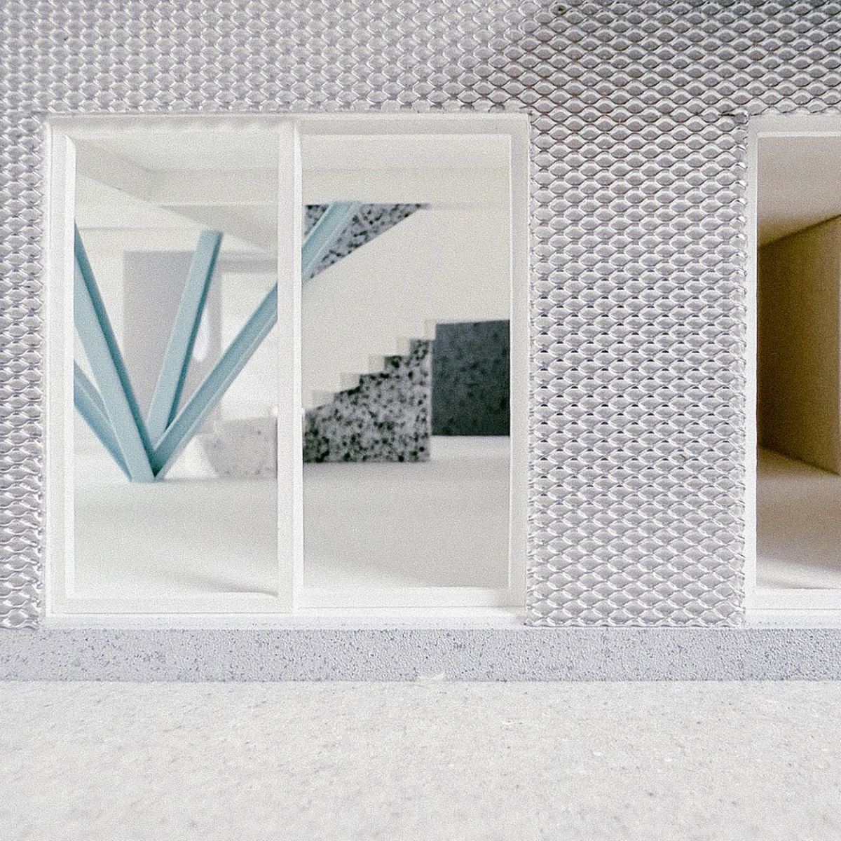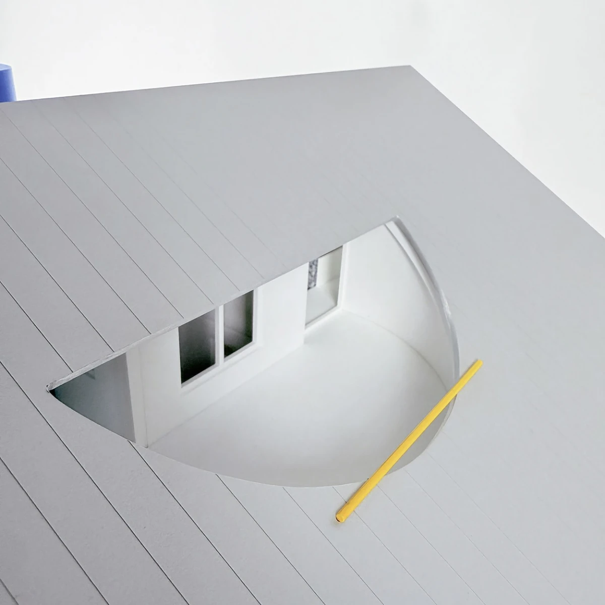 The house makes visible the mechanisms and instruments of domestic life: plumbing walls, water tank, cabinetry, and an elevator among others, take shape as monoliths. These monoliths are carefully arranged, like pieces in a still life composition, to organize the interior of the house.