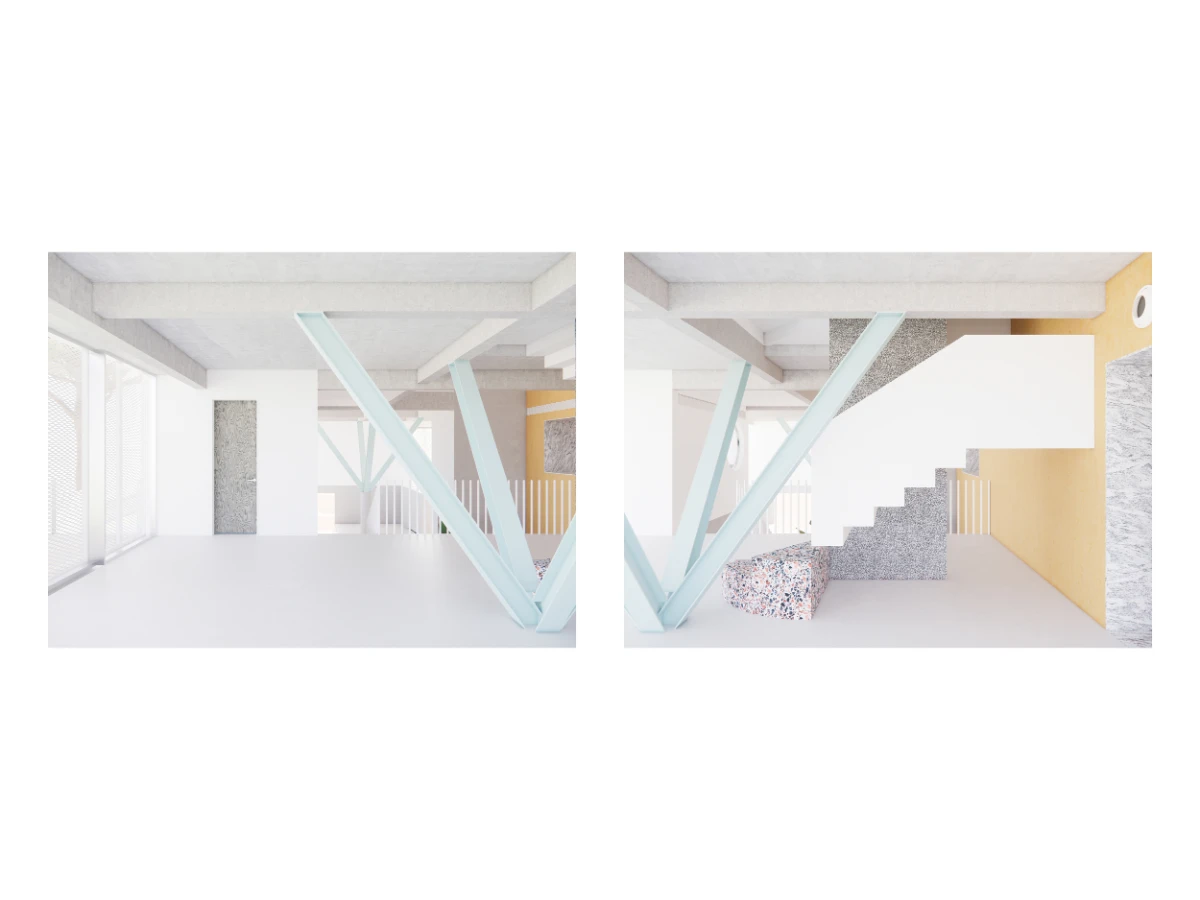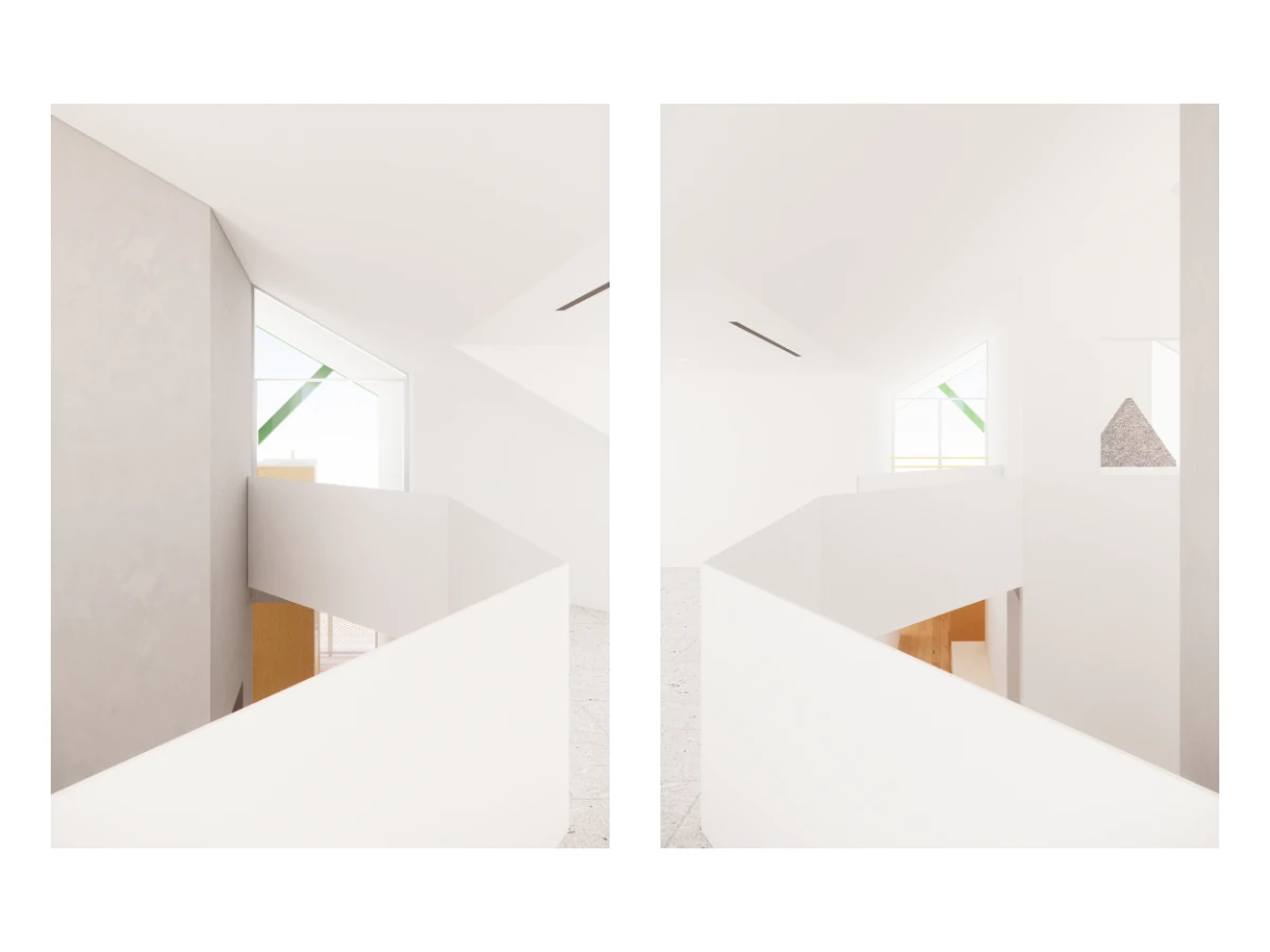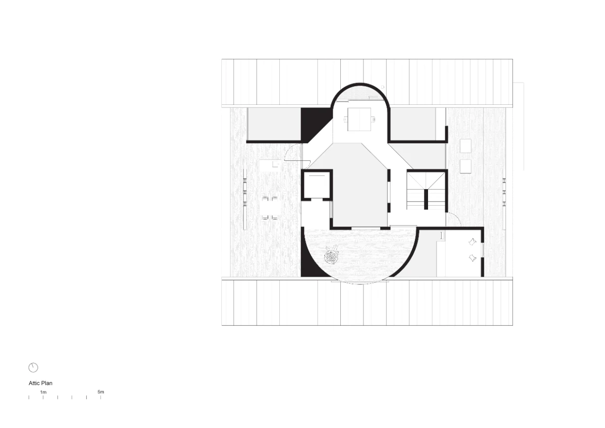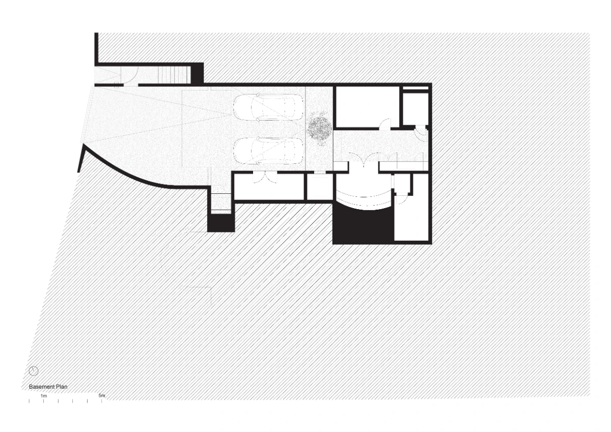 The floor plans of the house emerge from two distinct and deliberately agnostic conditions, general in shape and unspecific: an open plan on the ground floor responding to the topography of the site and a regular grid of rooms above. It is the monoliths puncturing these spaces that give the rooms specific functions through their adjacencies.