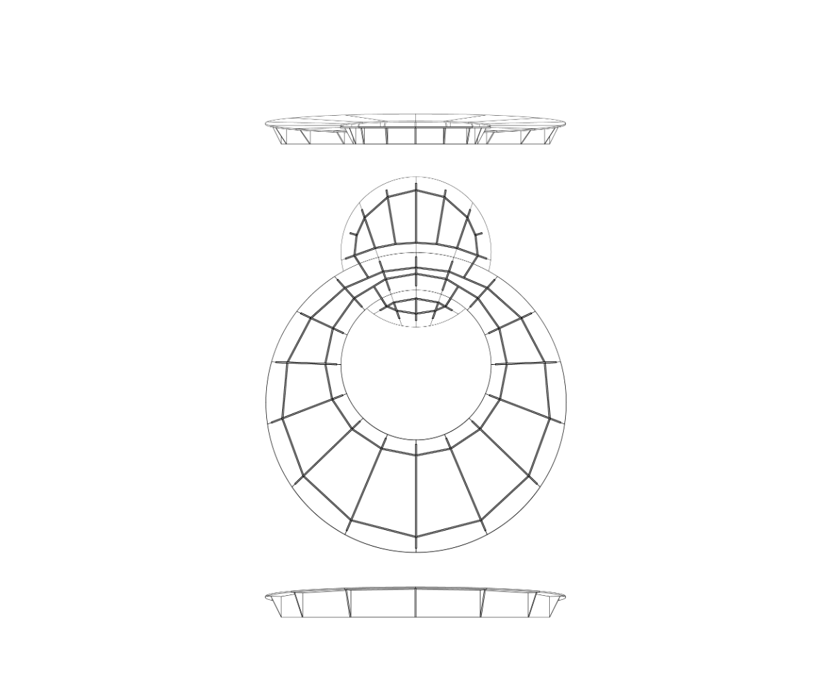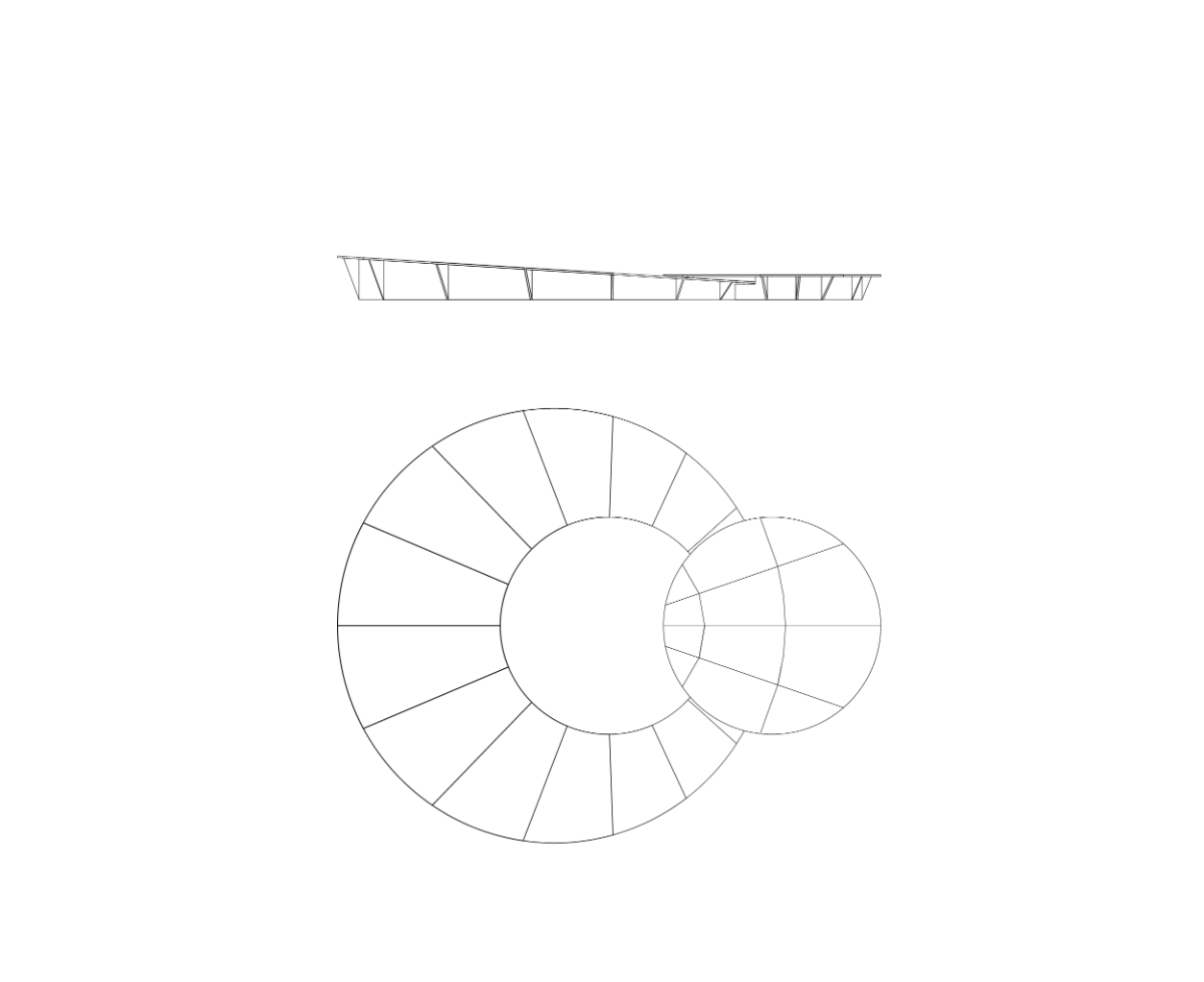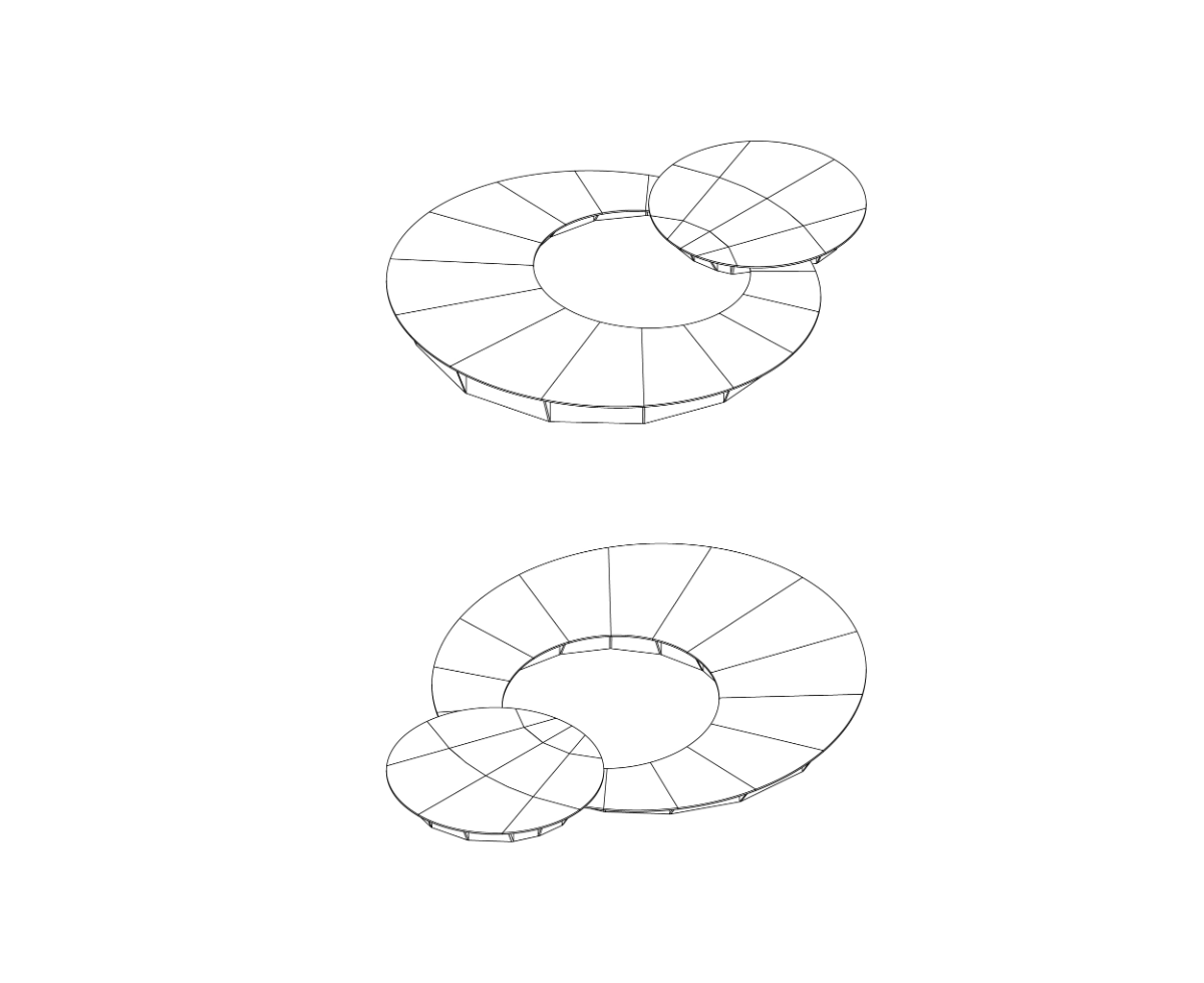 The project stands out for its geometric construction: two eccentric circles, one nested within the other but with different centers, evolve into tangent circles, creating a metaphorical “artistic orbit” that revolves around the community. The platform’s tilt echoes the angle of inclination between the plane of the lunar orbit and the ecliptic, symbolizing an ideal space where street arts meet the community in an inclusive embrace.