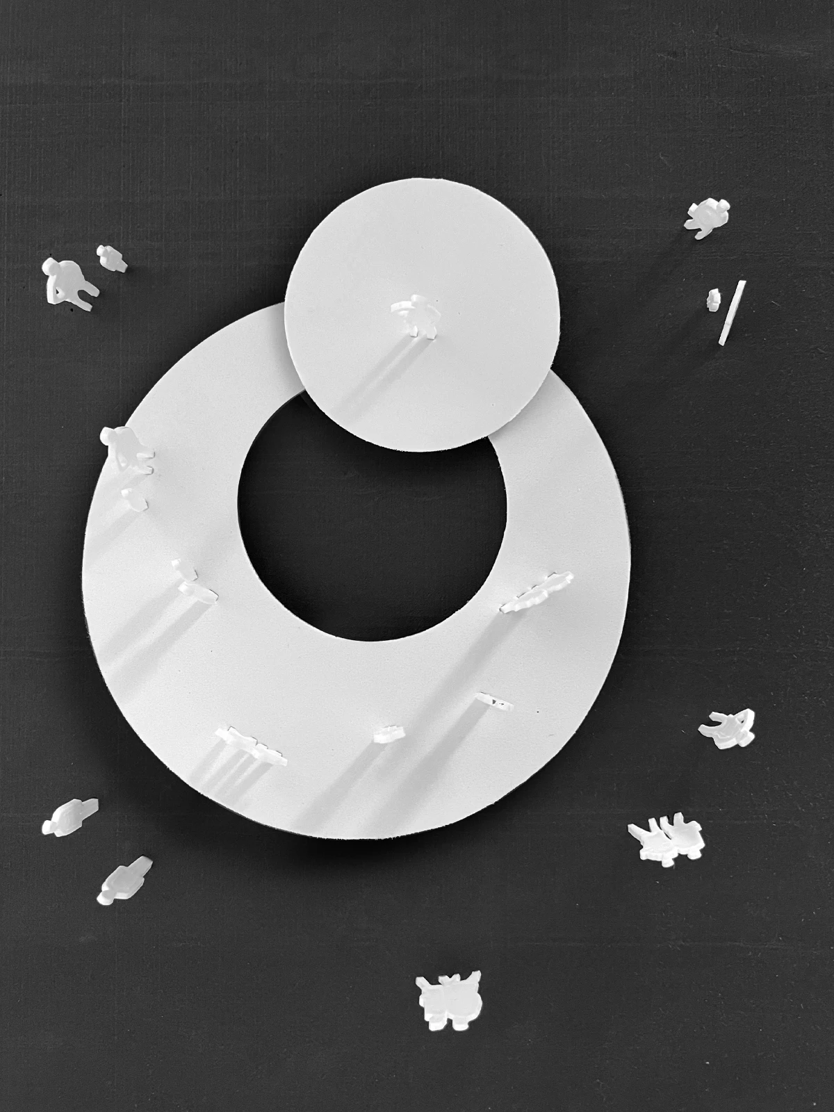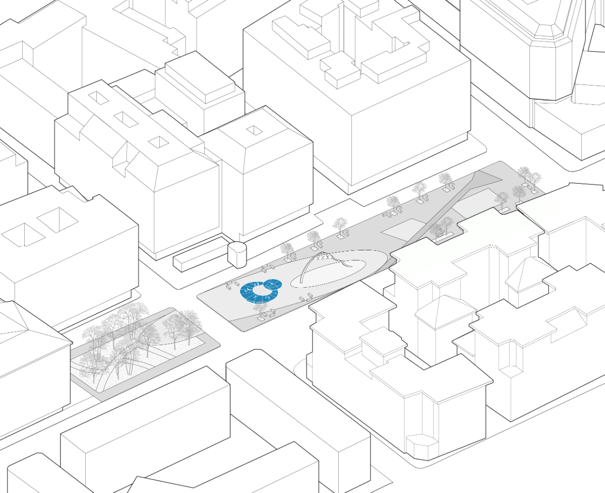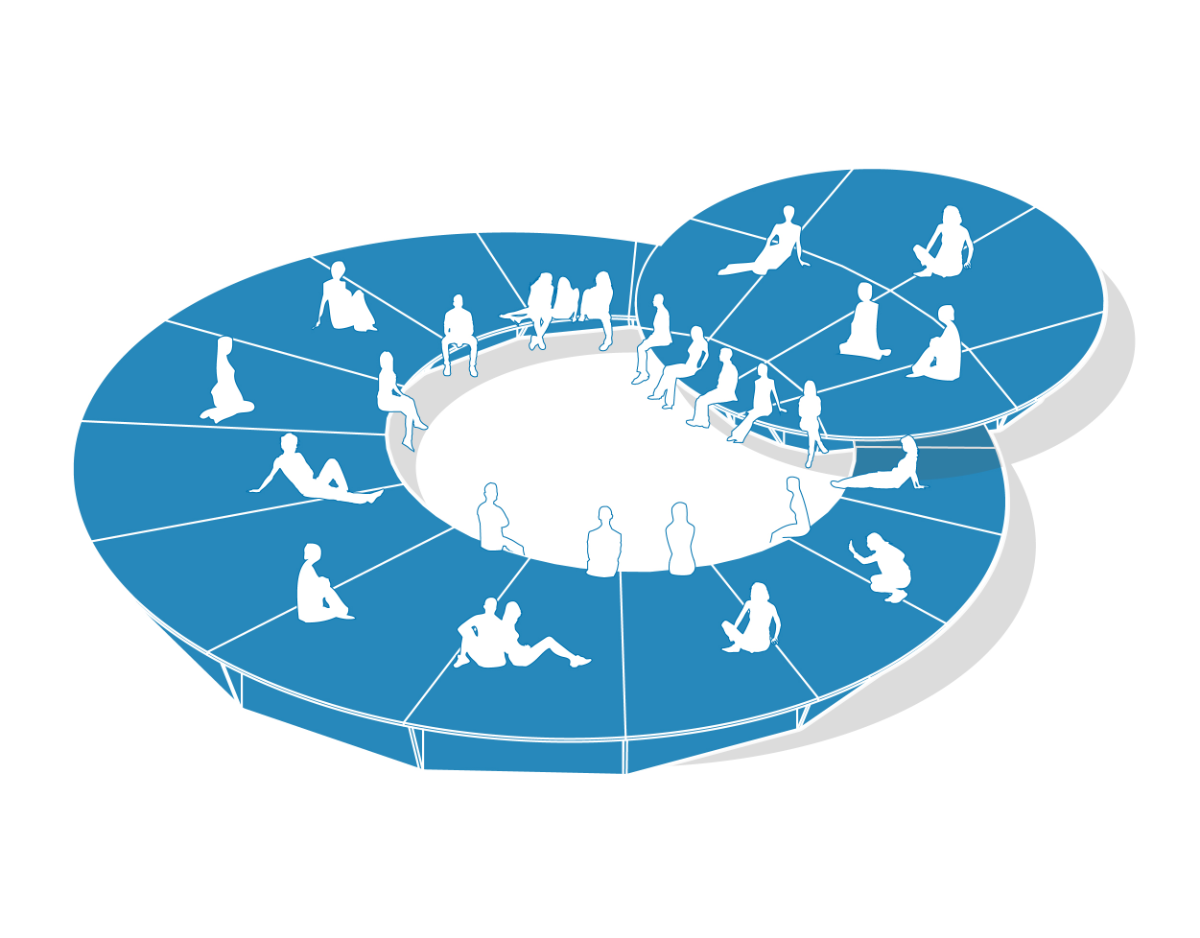The project stands out for its geometric construction: two eccentric circles, one nested within the other but with different centers, evolve into tangent circles, creating a metaphorical “artistic orbit” that revolves around the community. The platform’s tilt echoes the angle of inclination between the plane of the lunar orbit and the ecliptic, symbolizing an ideal space where street arts meet the community in an inclusive embrace.