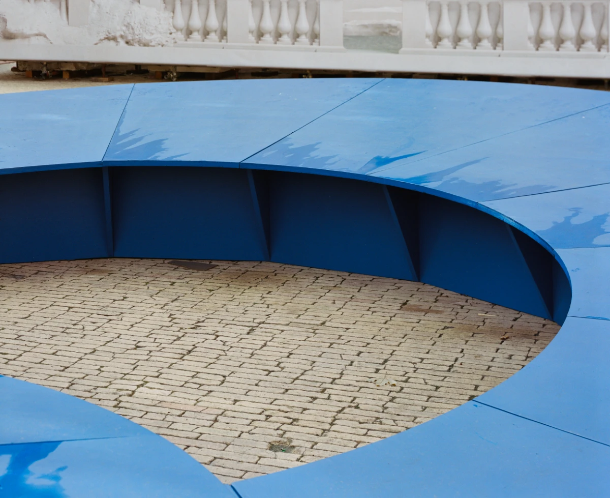 The structure, made entirely from panalex, features a radial, symmetric, and barycentric design. It includes a 7-meter diameter inclined ring and a 3.5-meter diameter flat platform. The finish showcases a blue, water-based exterior wood paint.