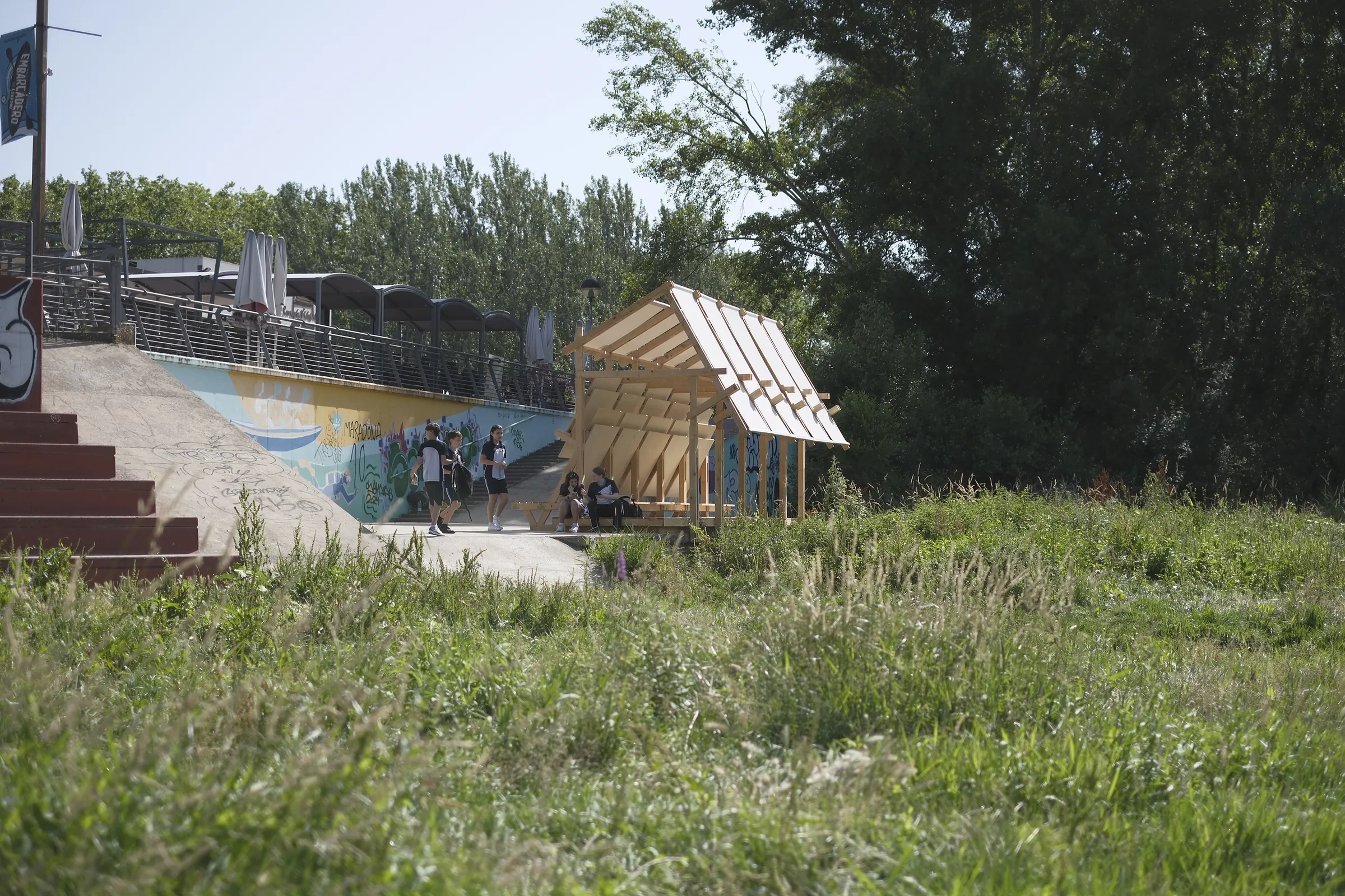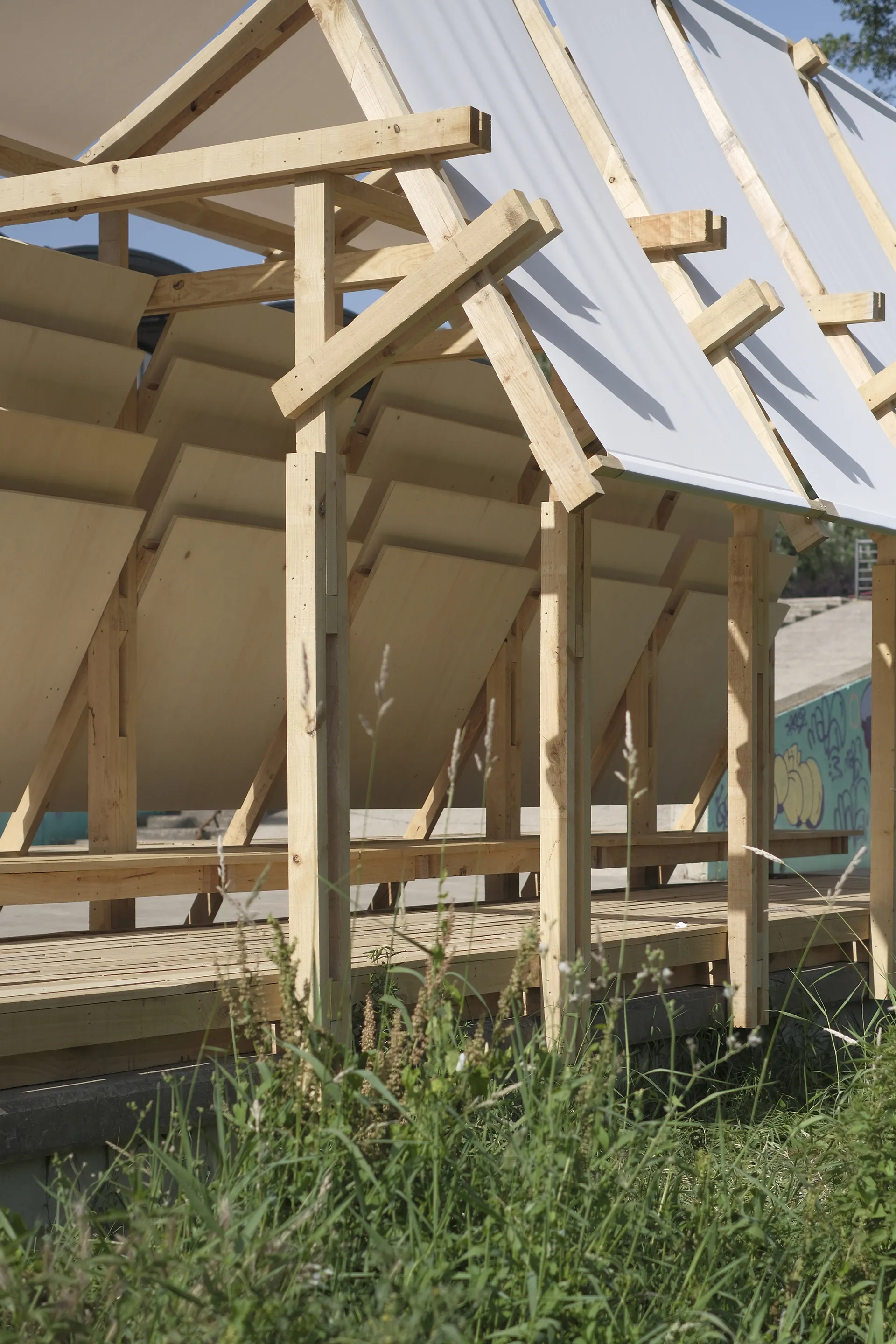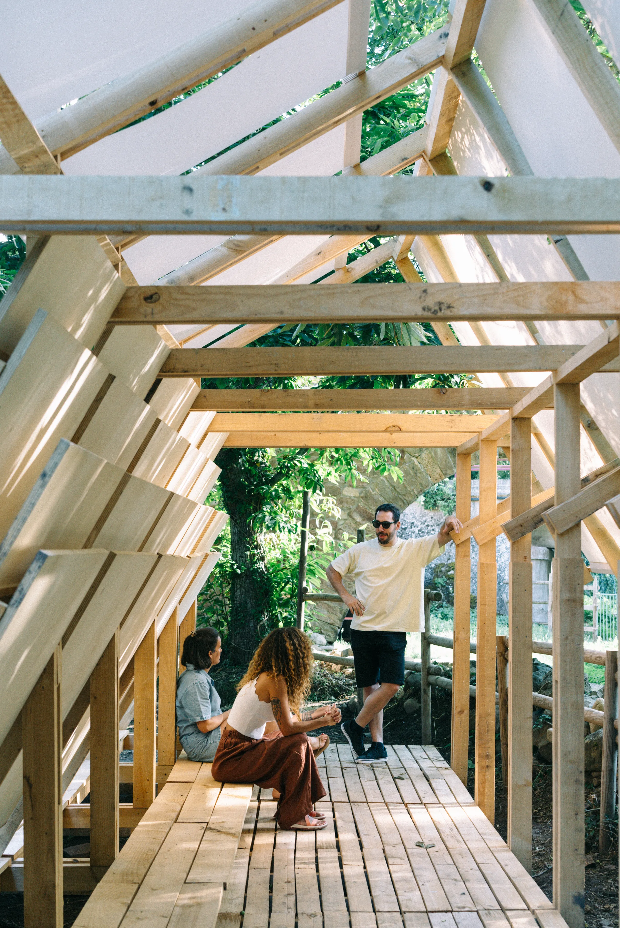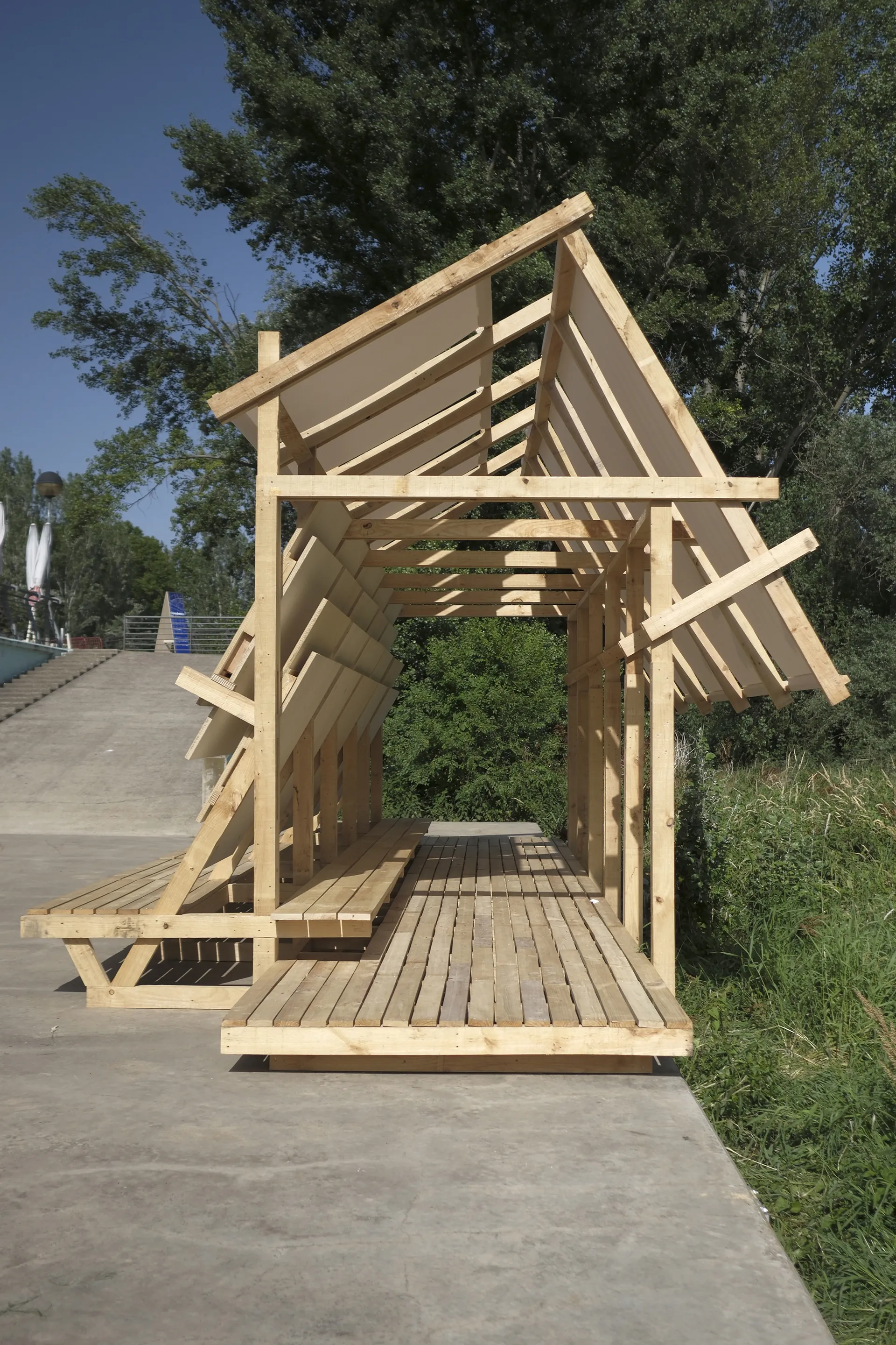 The installation proposed a handmade shaded wooden space that encouraged both environmental responsiveness and social exchange — pausing, learning, contemplating, and dwelling at the threshold between the man-made city and the natural environment.