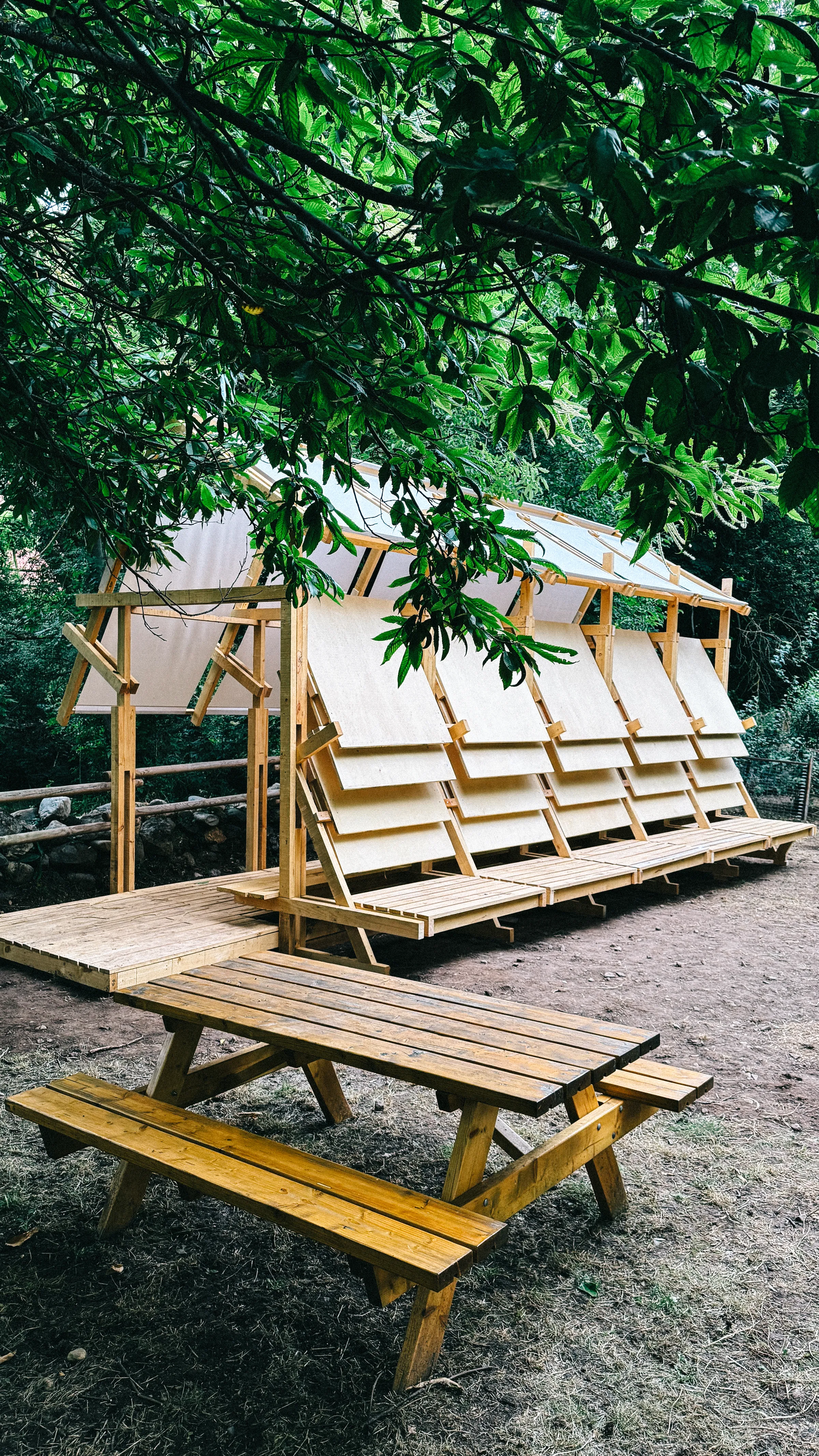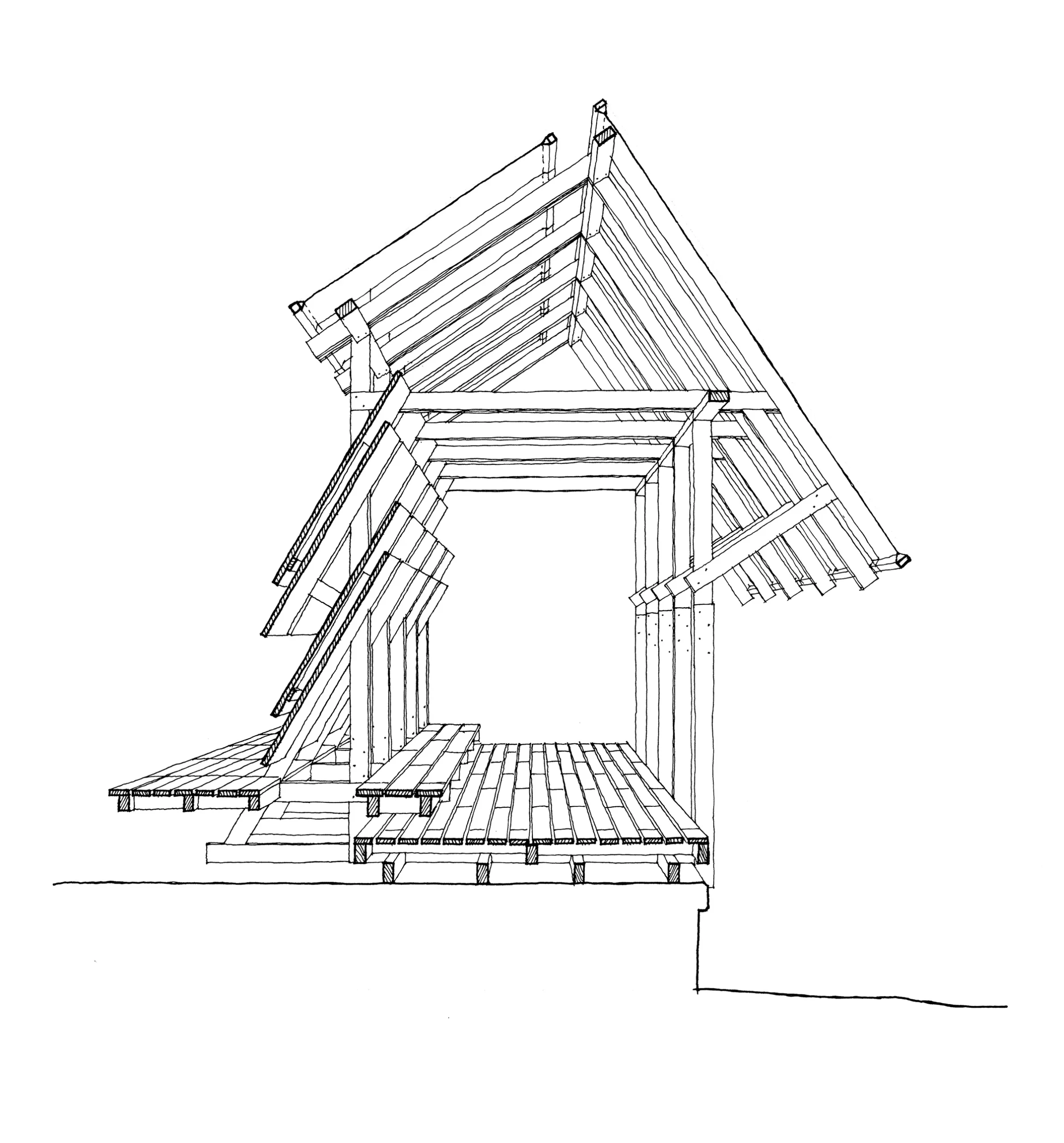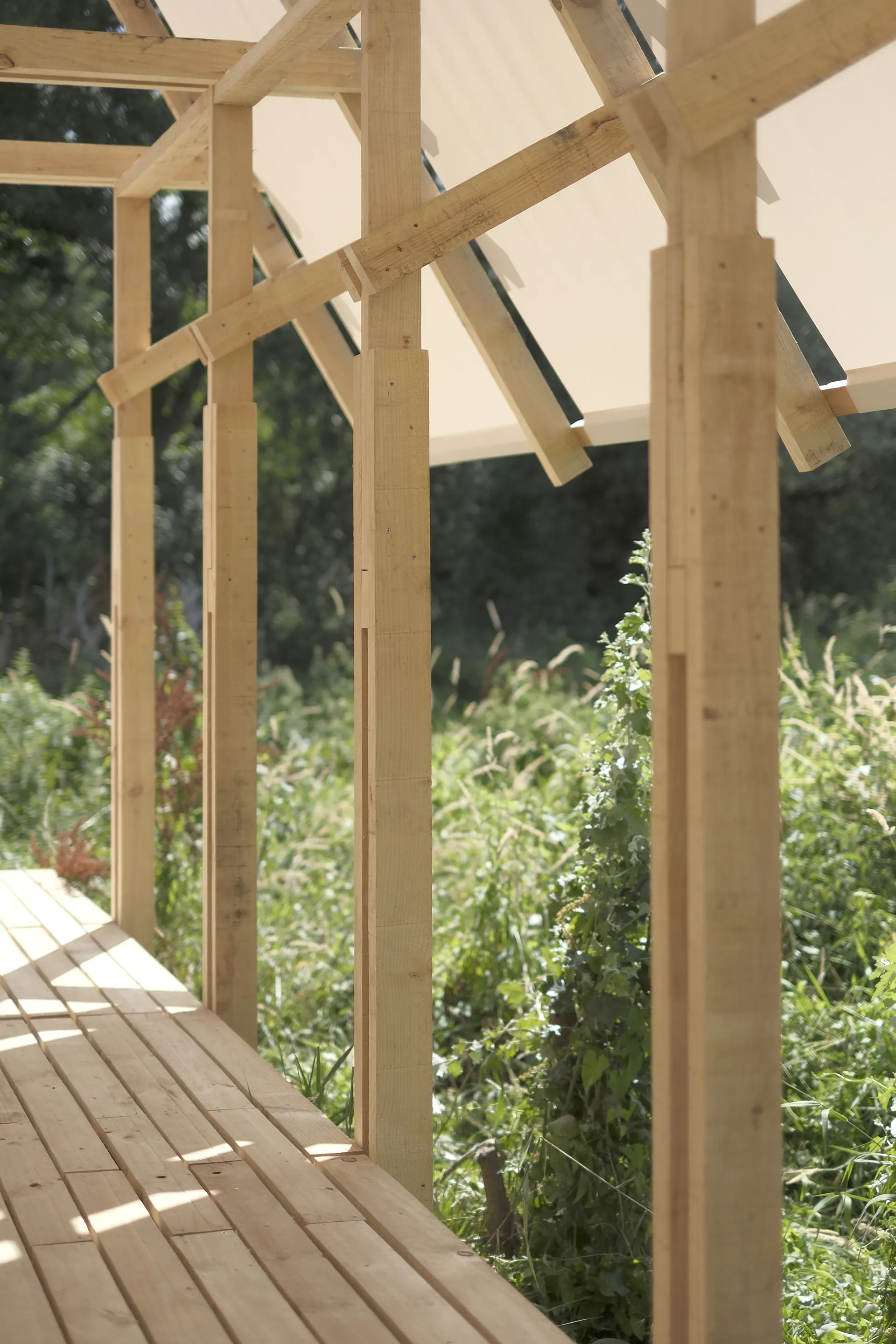 The installation proposed a handmade shaded wooden space that encouraged both environmental responsiveness and social exchange — pausing, learning, contemplating, and dwelling at the threshold between the man-made city and the natural environment.