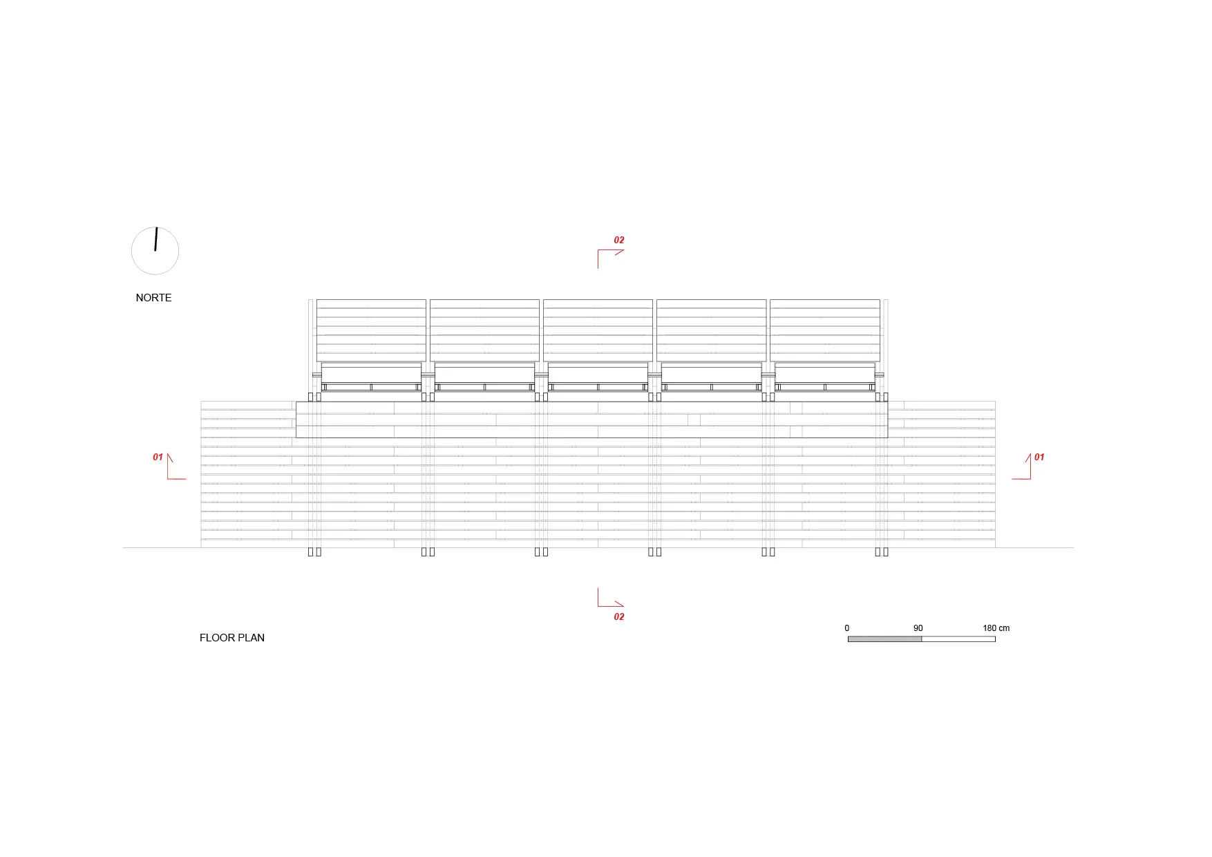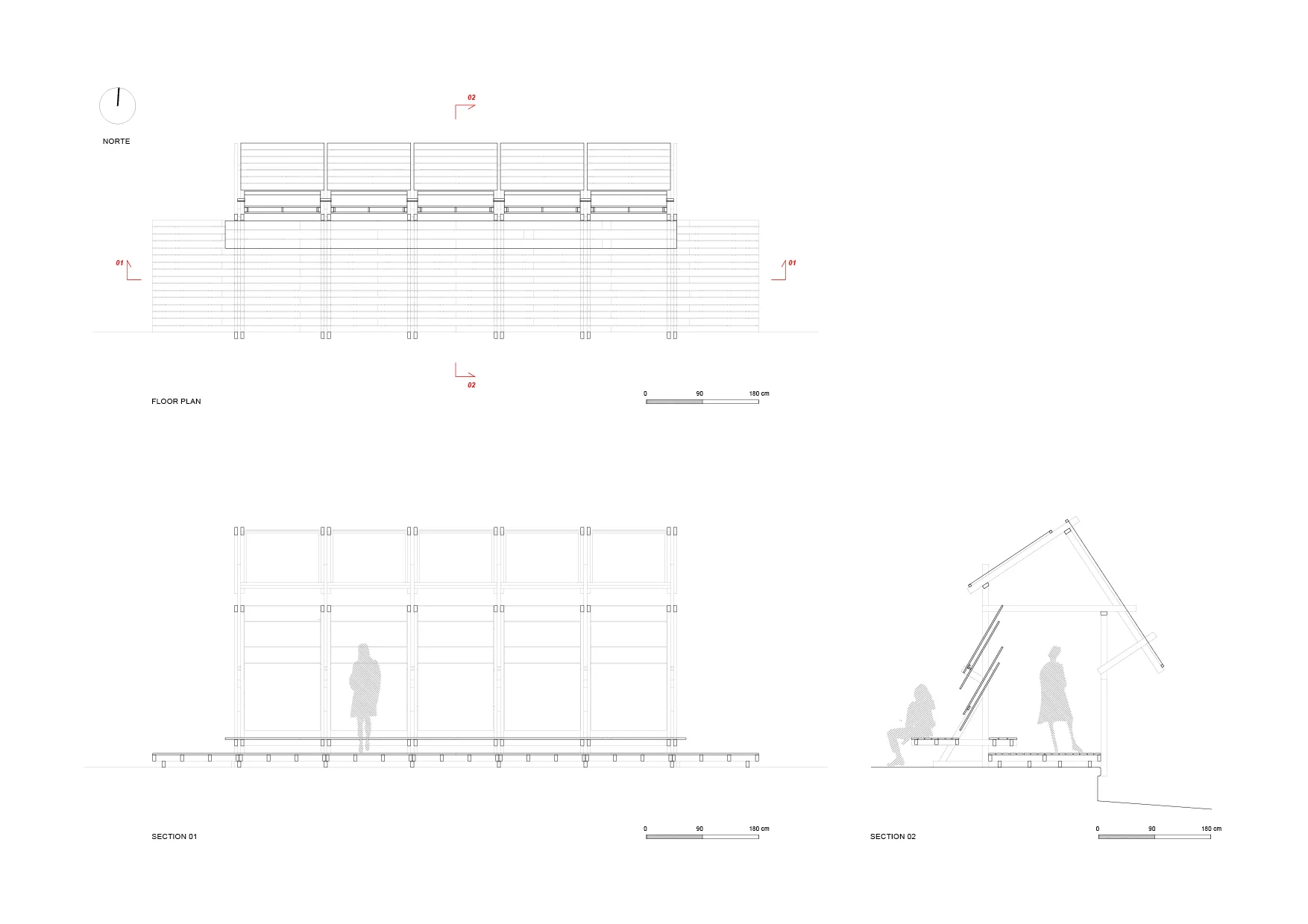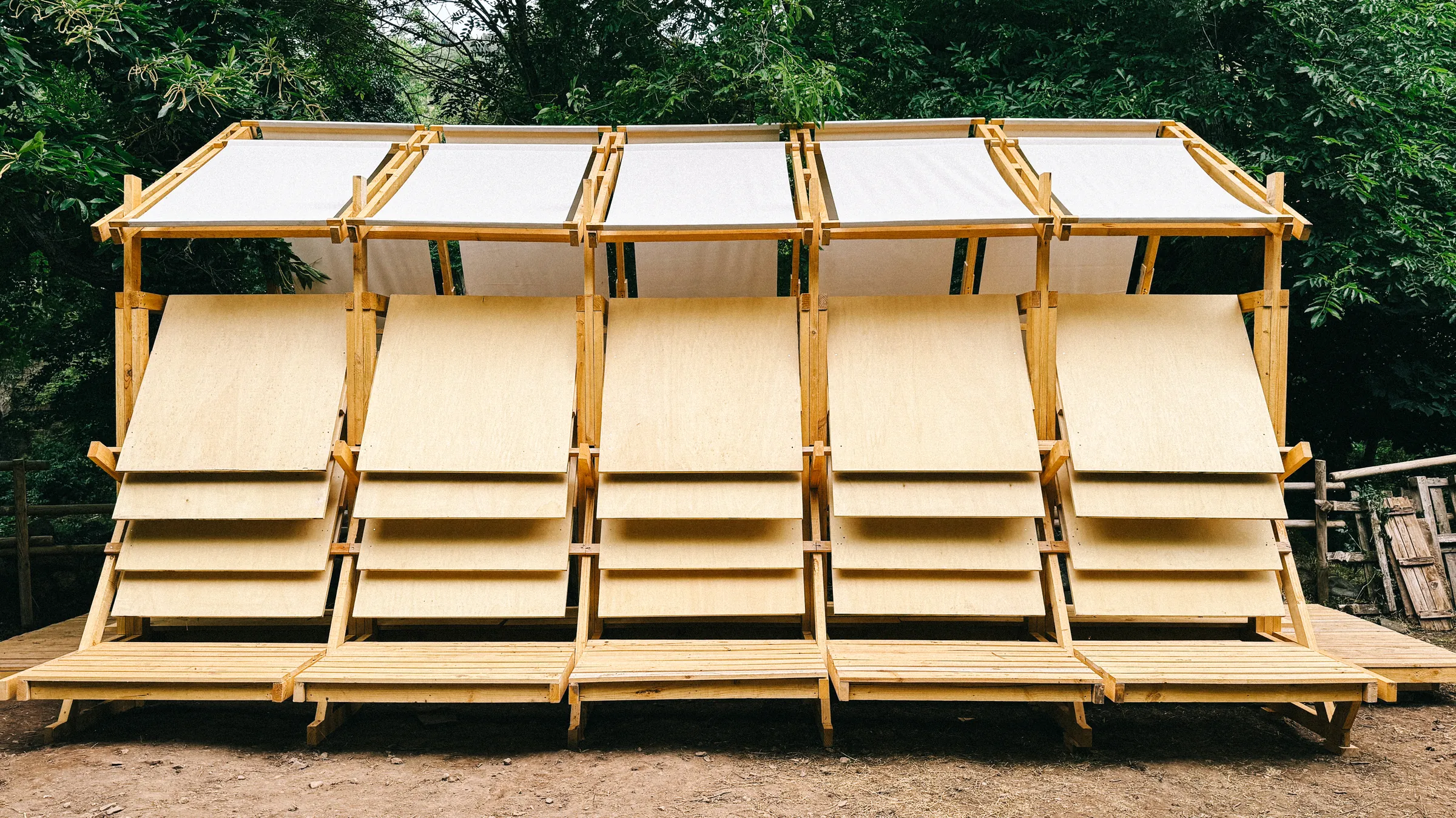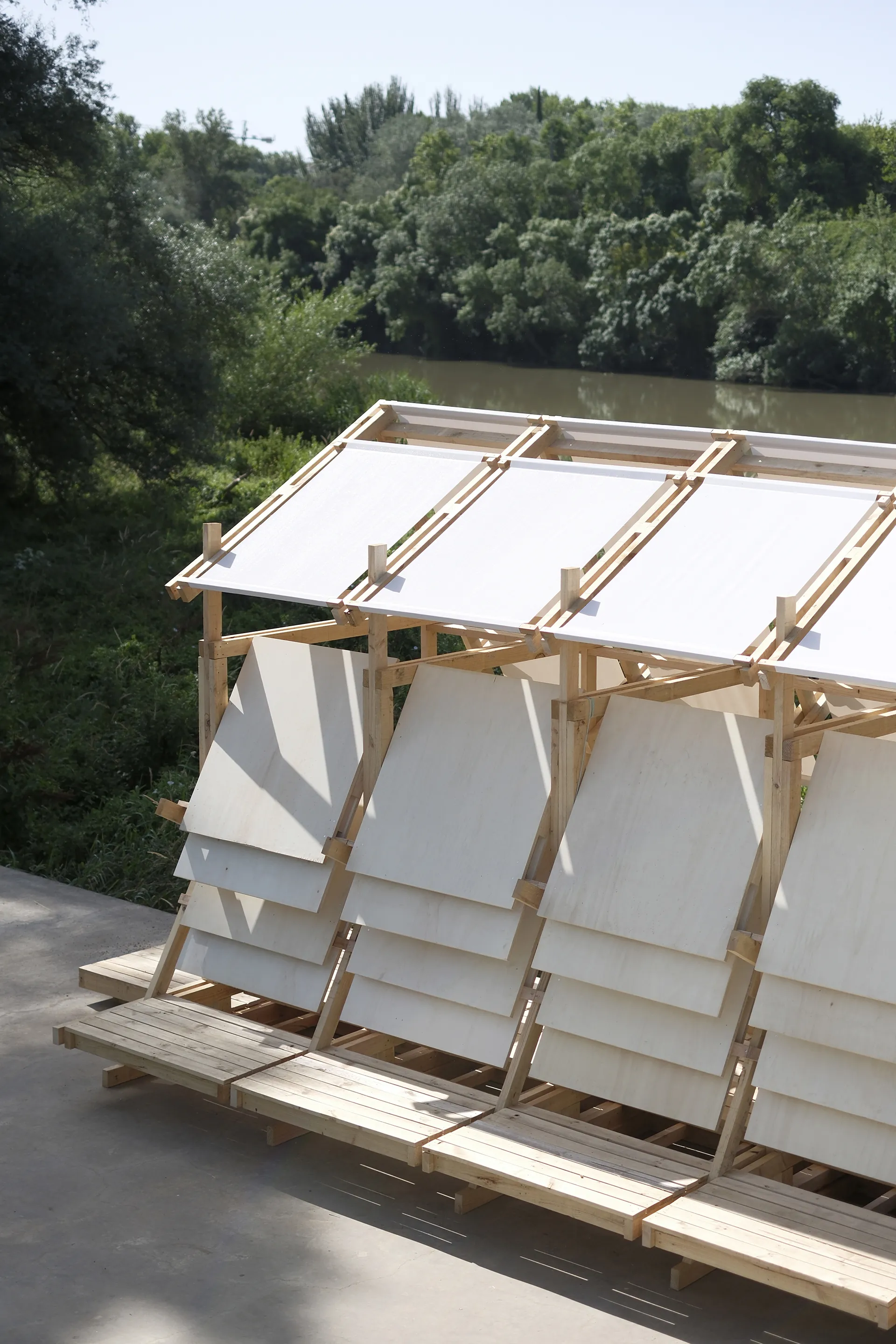 The southern façade opened fully to the river while remaining protected from direct sunlight. On the north, plywood panels block glare from the adjacent concrete wall and facilitate passive ventilation by directing hot air upward, helping to dissipate the heat absorbed by the slab throughout the day.