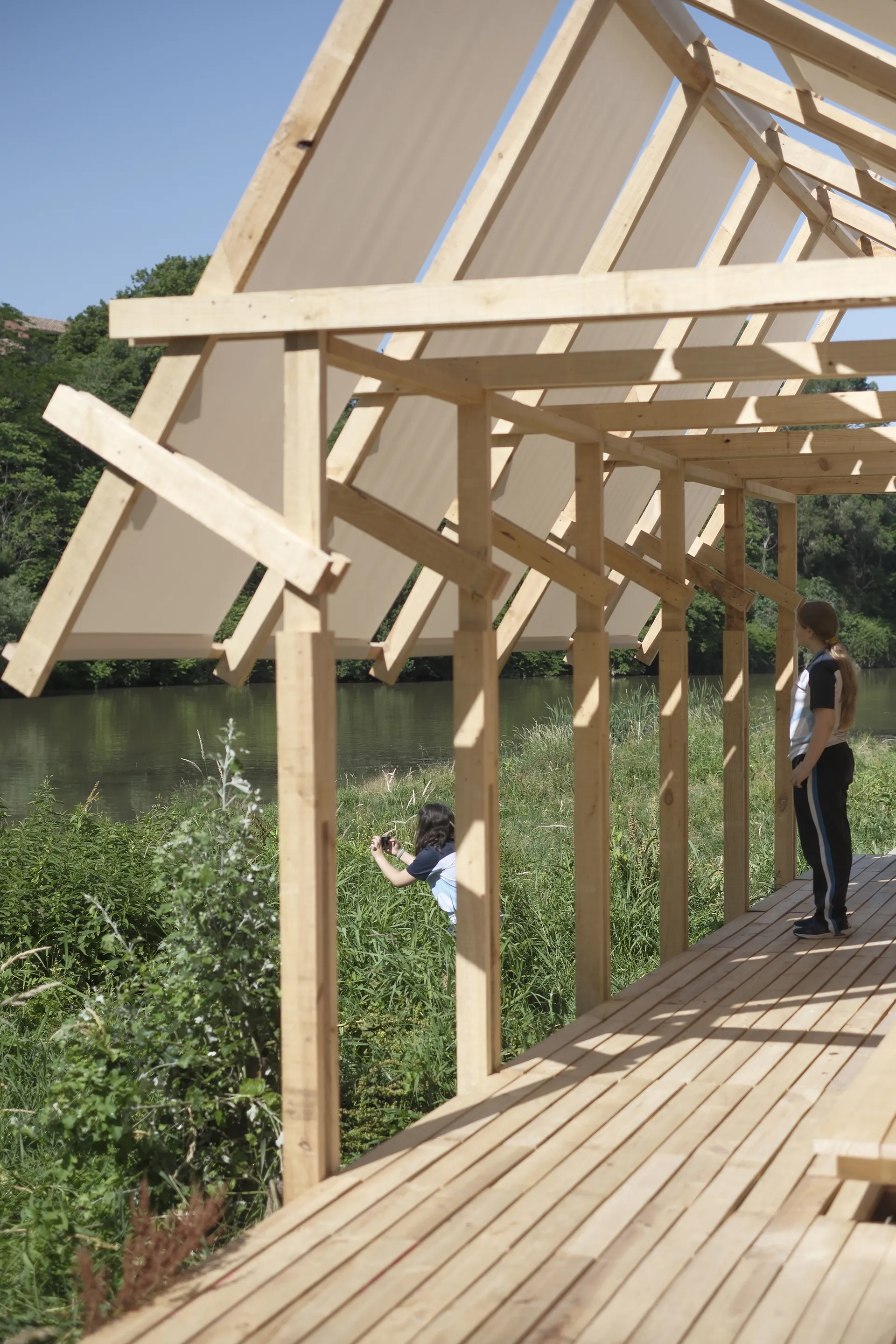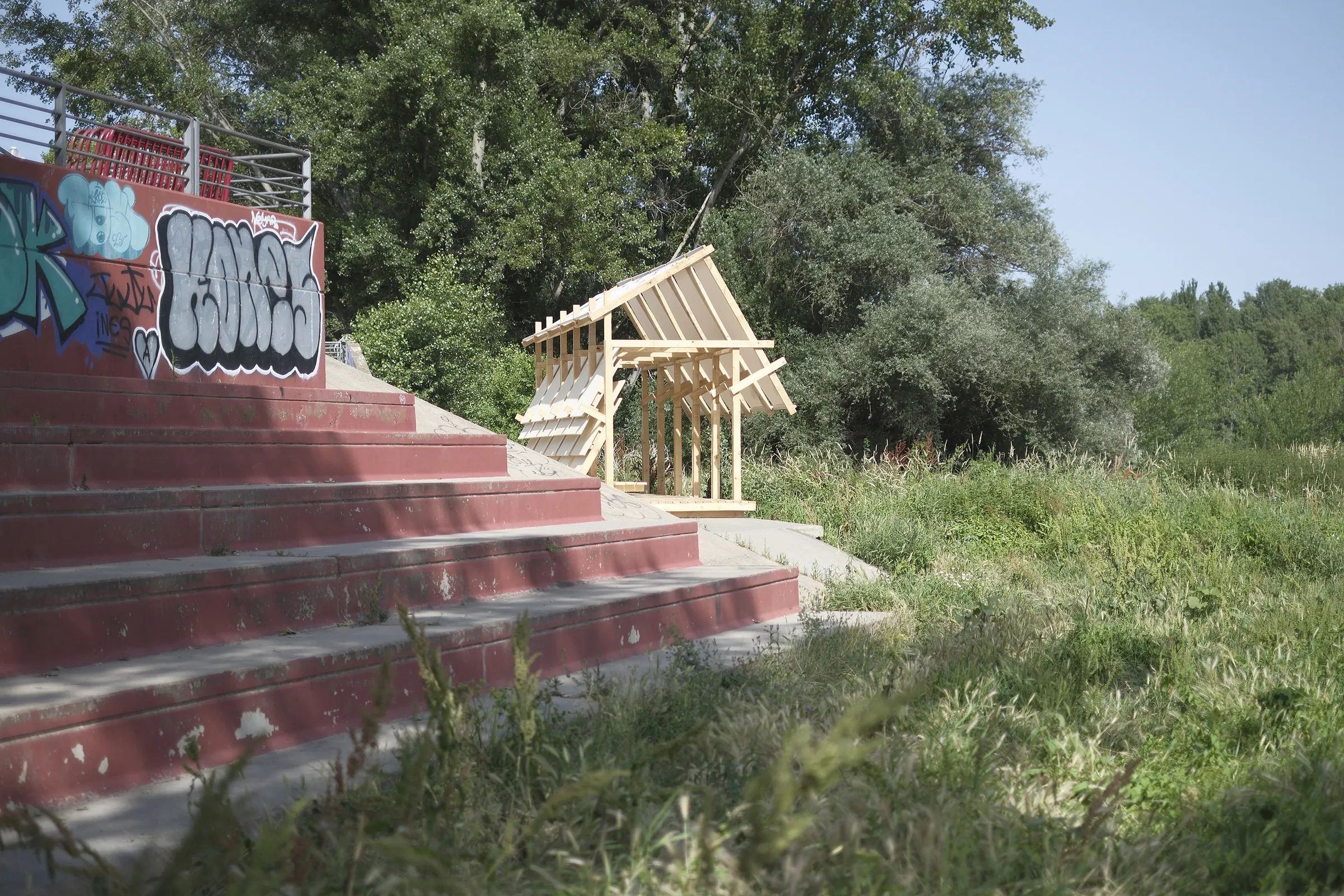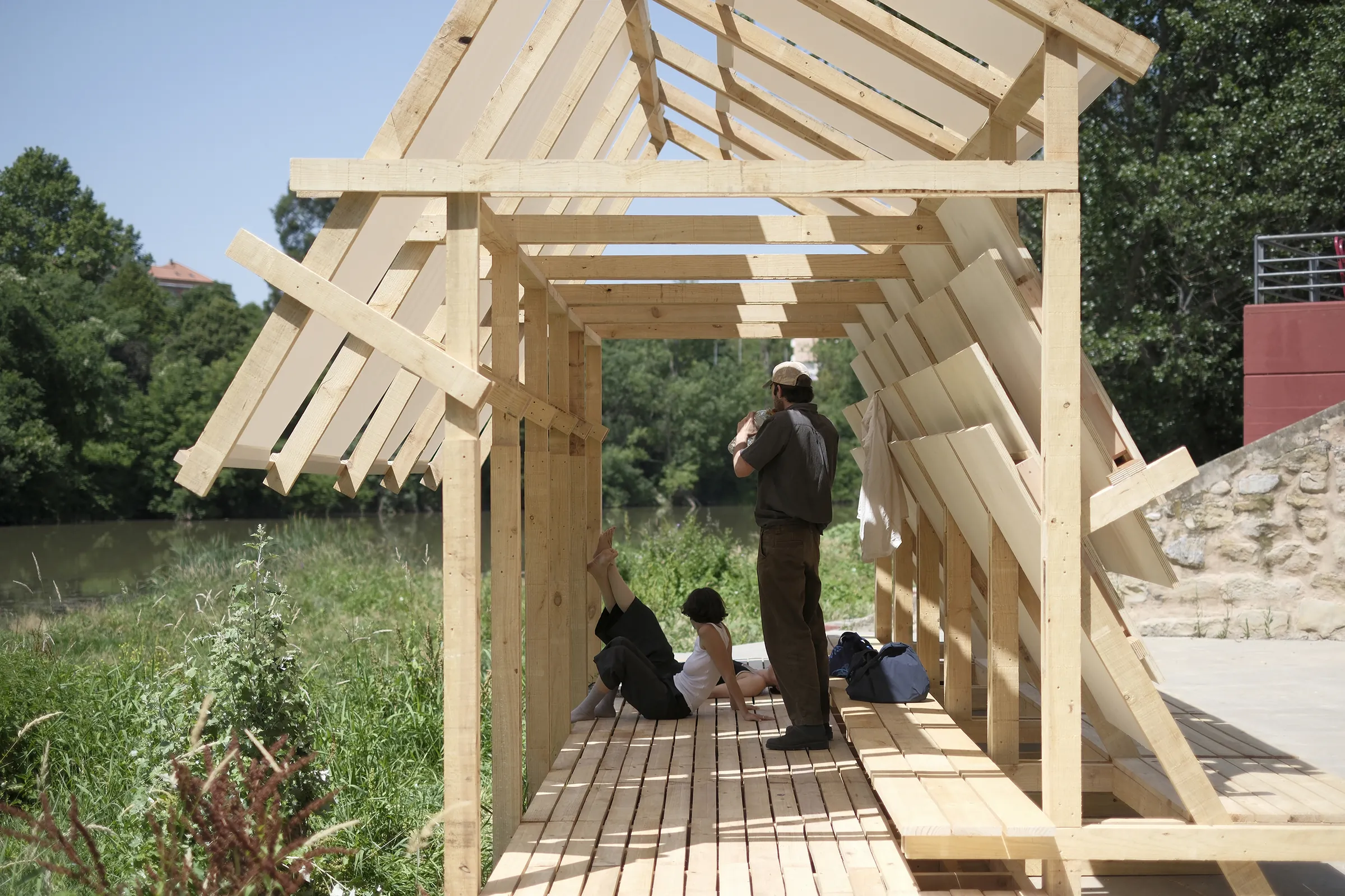 Habitar el Río was installed on the north bank of the Ebro river in Logroño, on a neglected concrete dock caught between the city and the season-shifting water levels of the river. Created for Concéntrico 2025 — the International Festival of Architecture and Design — the project responded to the festival’s emphasis on ecological awareness and collective inhabitation by reactivating a forgotten riverfront edge: once a bathing area, now reduced to a passageway.