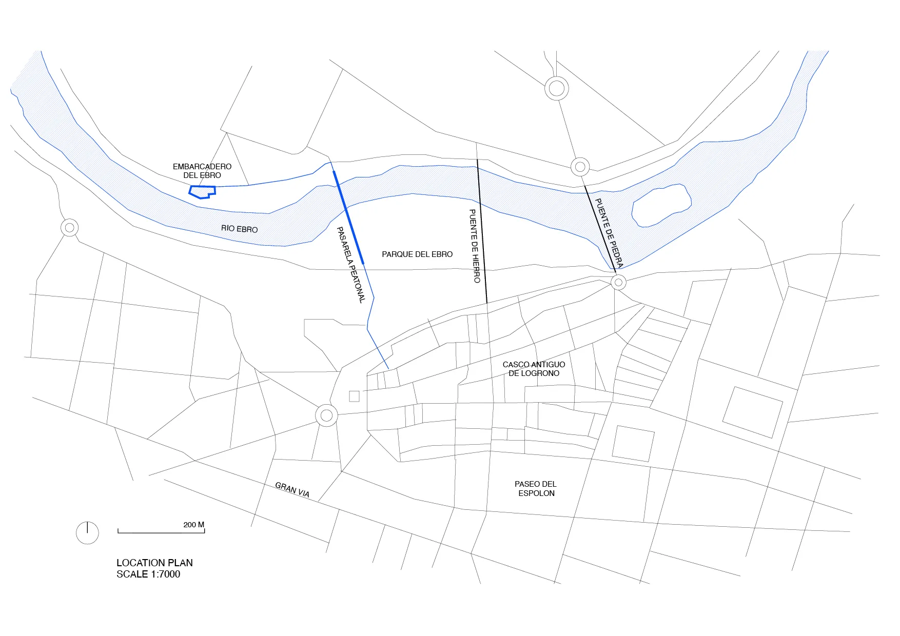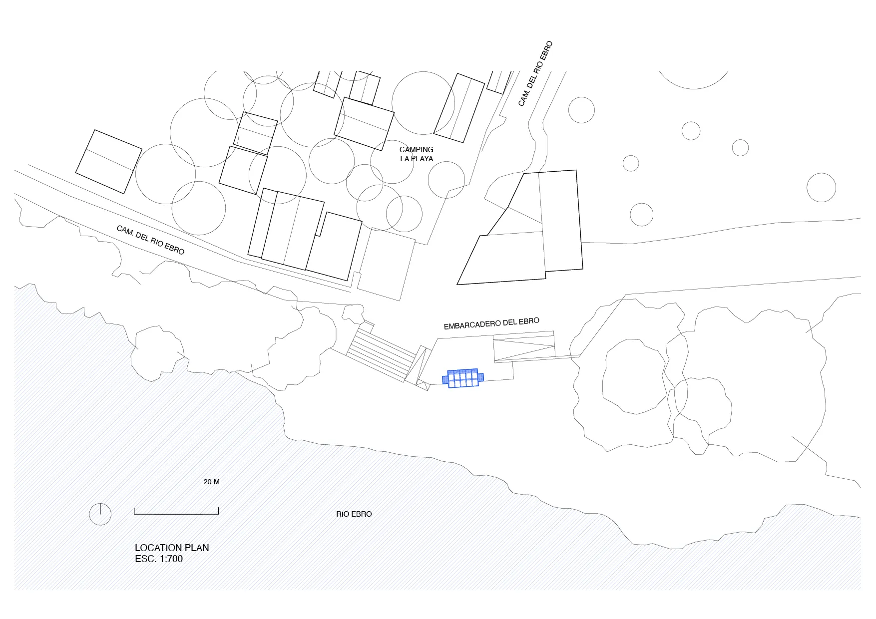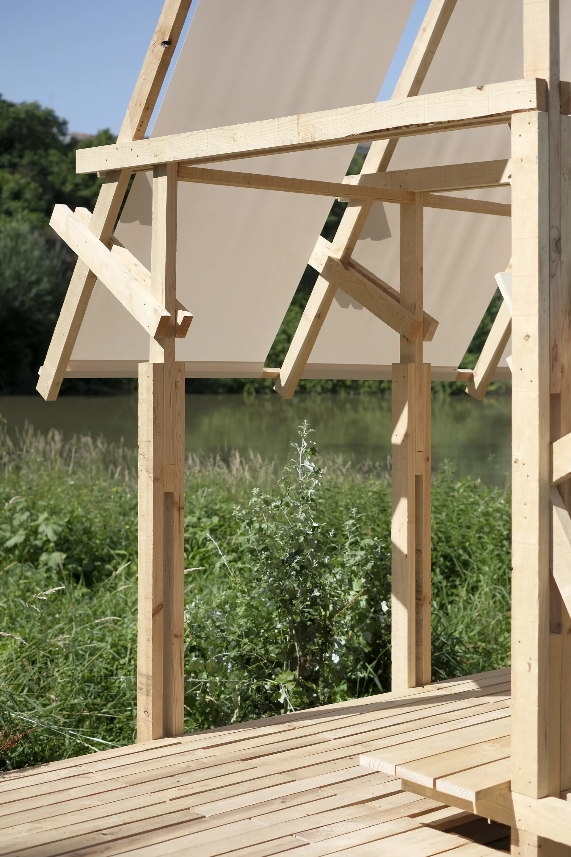 Habitar el Río was installed on the north bank of the Ebro river in Logroño, on a neglected concrete dock caught between the city and the season-shifting water levels of the river. Created for Concéntrico 2025 — the International Festival of Architecture and Design — the project responded to the festival’s emphasis on ecological awareness and collective inhabitation by reactivating a forgotten riverfront edge: once a bathing area, now reduced to a passageway.