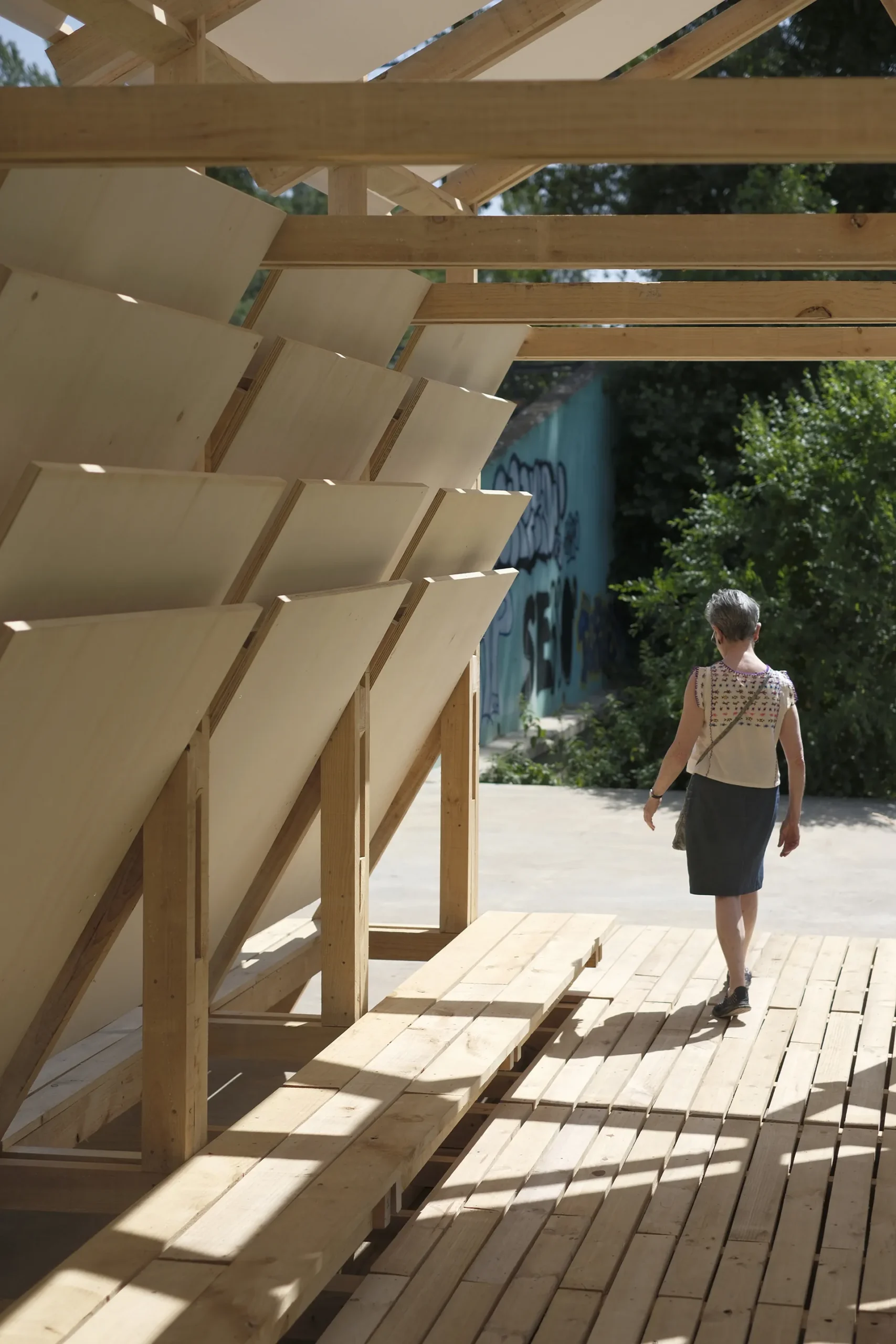 The structure was built collaboratively with students from the Faculty of Architecture at CESUGA (Centro de Estudios Universitarios de Galicia), combining prefabrication in A Coruña with on-site assembly in Logroño. The project was supported by Maderas Besteiro, Bandalux, Xunta de Galicia, and the Spanish Association for Forestry Sustainability (PEFC).