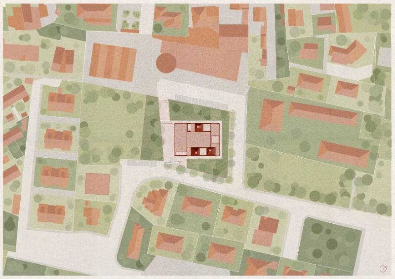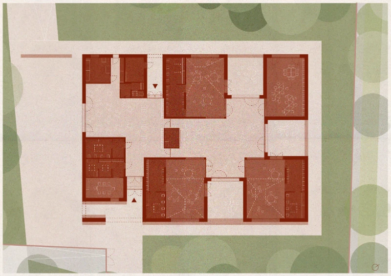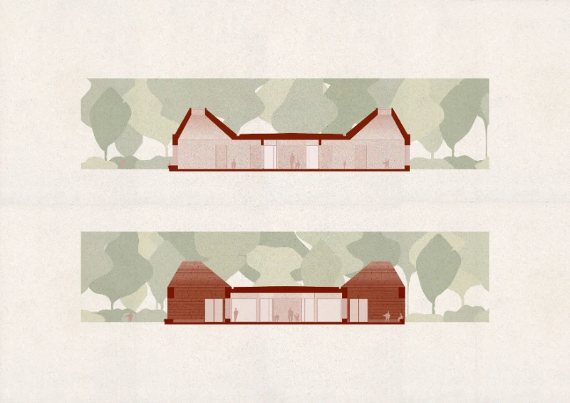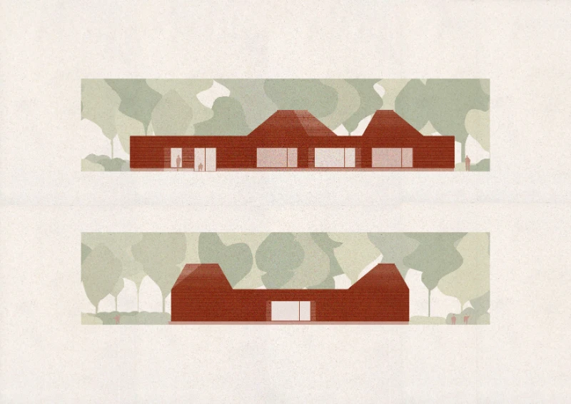 The school thus appears as a constructed landscape, a synthesis of memory and invention, of rural archetypes and contemporary pedagogy.