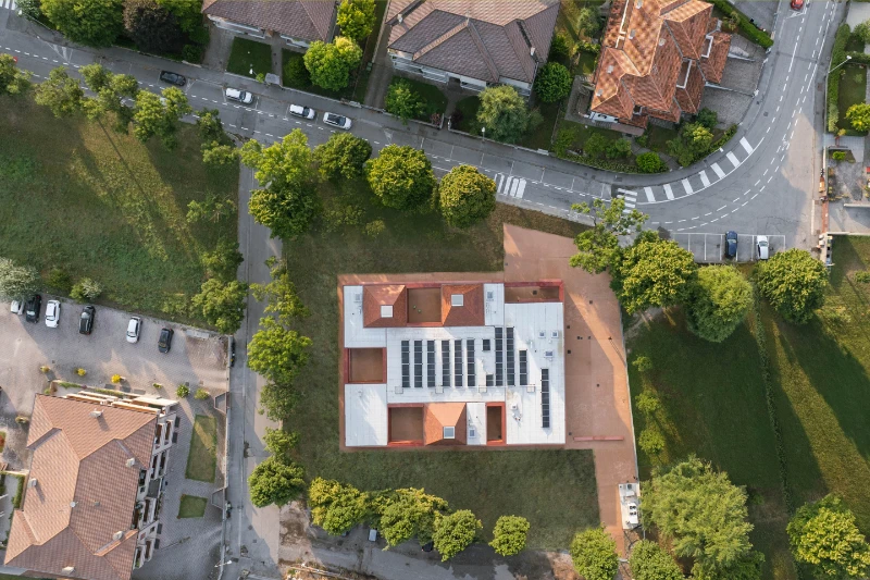 Its form identifies three classrooms, standing out as volumetric exceptions within a continuous terracotta skin, evoking the age-old tradition of clay construction and pitched tile roofs.
