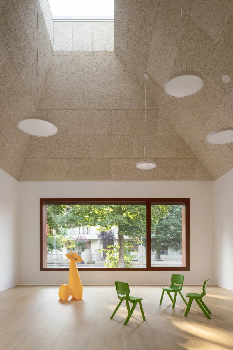 A primordial kindergarten, shaped by the spirit of the place and the emotions of the child. A space both protected and dreamlike, safe yet open to wonder. A small village, an abstract ensemble of pyramidal