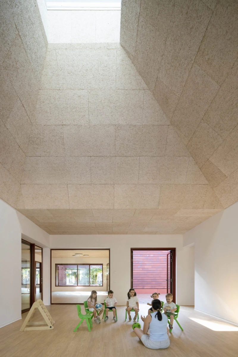 Like houses around a village square, the classrooms also face inward, engaging through a central agorà, a shared space for play and informal learning.