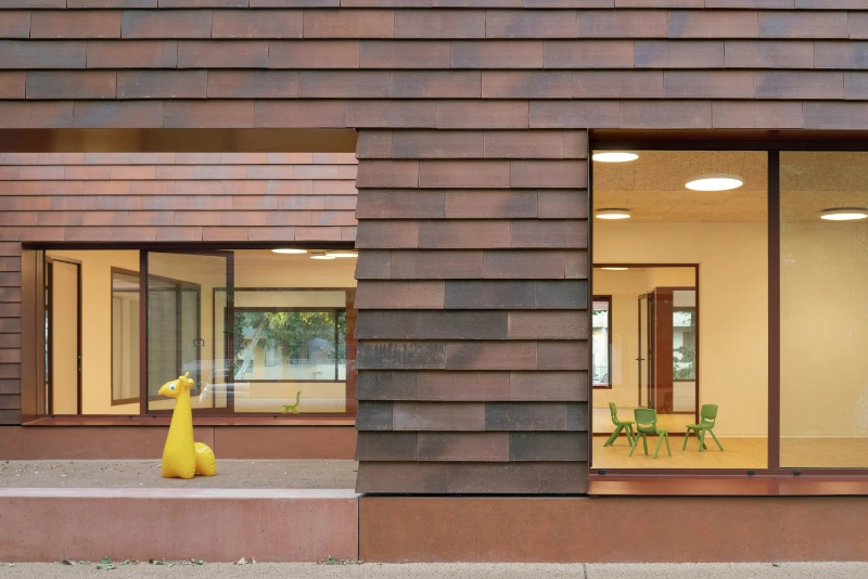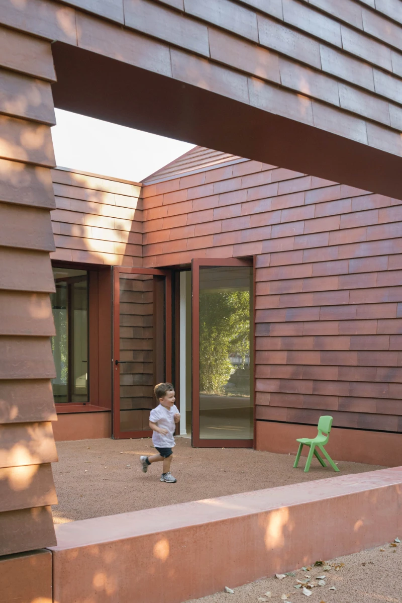 volumes joined by open courtyards. A vermilion school, warm and welcoming, rising among trees, nestled in green.