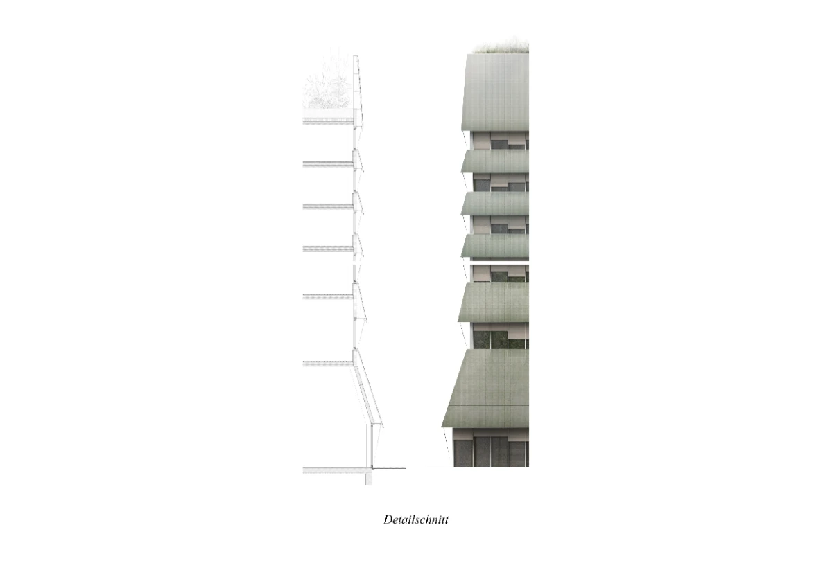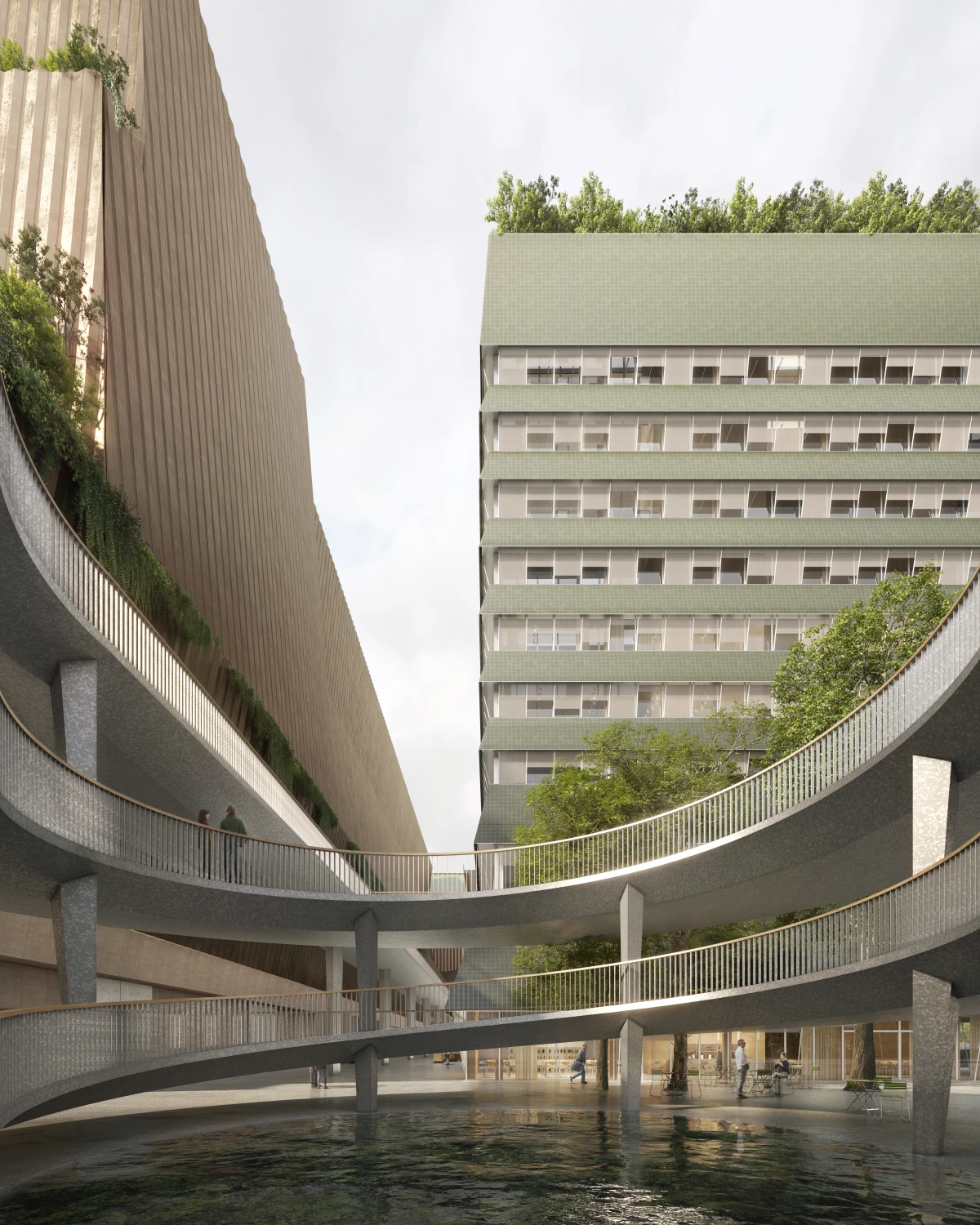 The facade features strategically placed offsets that serve as generous planters. These not only enhance the aesthetic appeal but also contribute to rainwater retention. Additionally, a significant portion of the roofs and facades is equipped with photovoltaic panels to harness solar energy. The integration of sustainable design elements extends to green roofs, which improve insulation and promote biodiversity. This thoughtful approach ensures that the project harmonizes with both its urban and natural context.