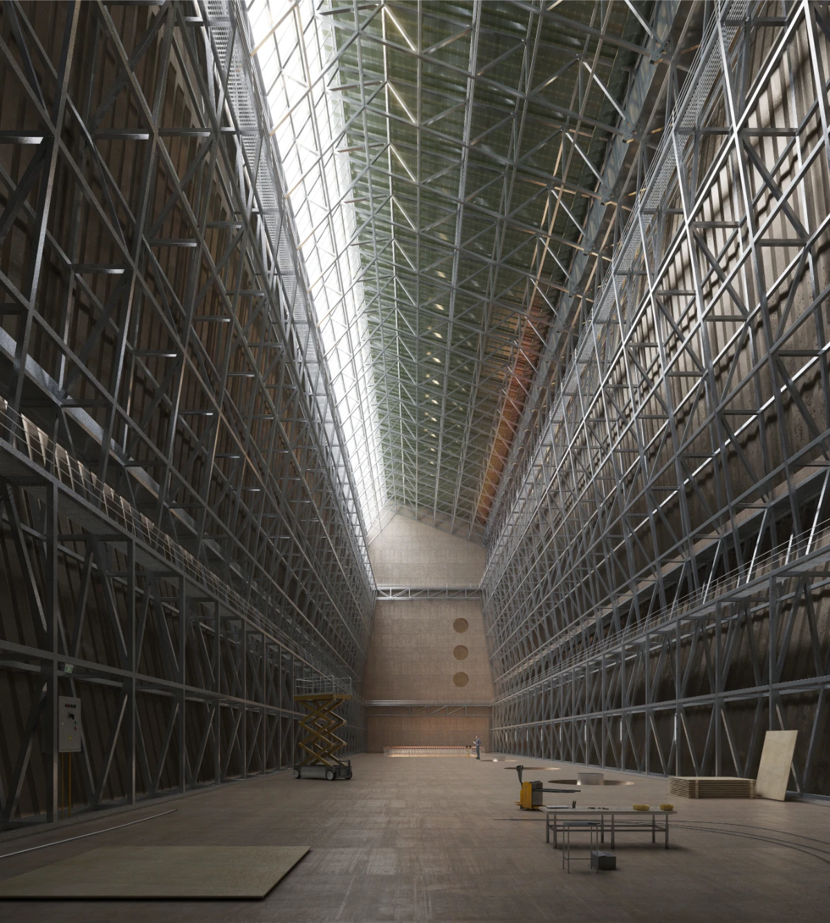 For the building envelope and upper levels, a steel frame structure is proposed. The buildings will be enclosed within a framework of regularly spaced trusses, forming a modular and redundant system. This design accommodates overhead cranes and multi-level access walkways while maintaining a sense of openness and transparency. The lattice framework efficiently supports linear ducts, conduits, and cable trays essential to industrial operations. The adaptability of this structure allows for future modifications or expansions, ensuring long-term operational efficiency.