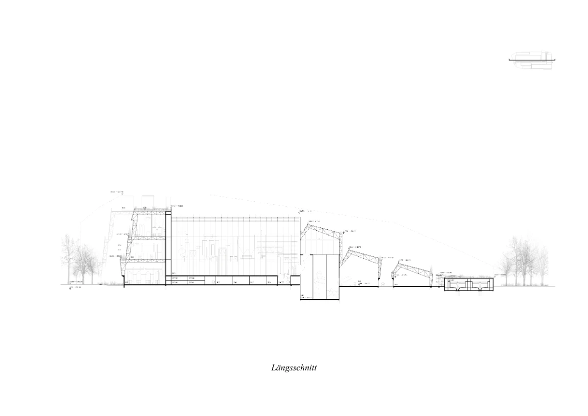 A factory is essentially a machine whose design reflects functional logic. The energy center takes inspiration from early industrial buildings with sloping roofs. Large sections fragment the imposing structure, creating dynamic interplay between light and shadow. The geometric arrangement of these sections forms sheds that introduce natural light into the interior spaces. The architectural composition balances industrial efficiency with aesthetic considerations, ensuring an integrated presence in the surrounding landscape.