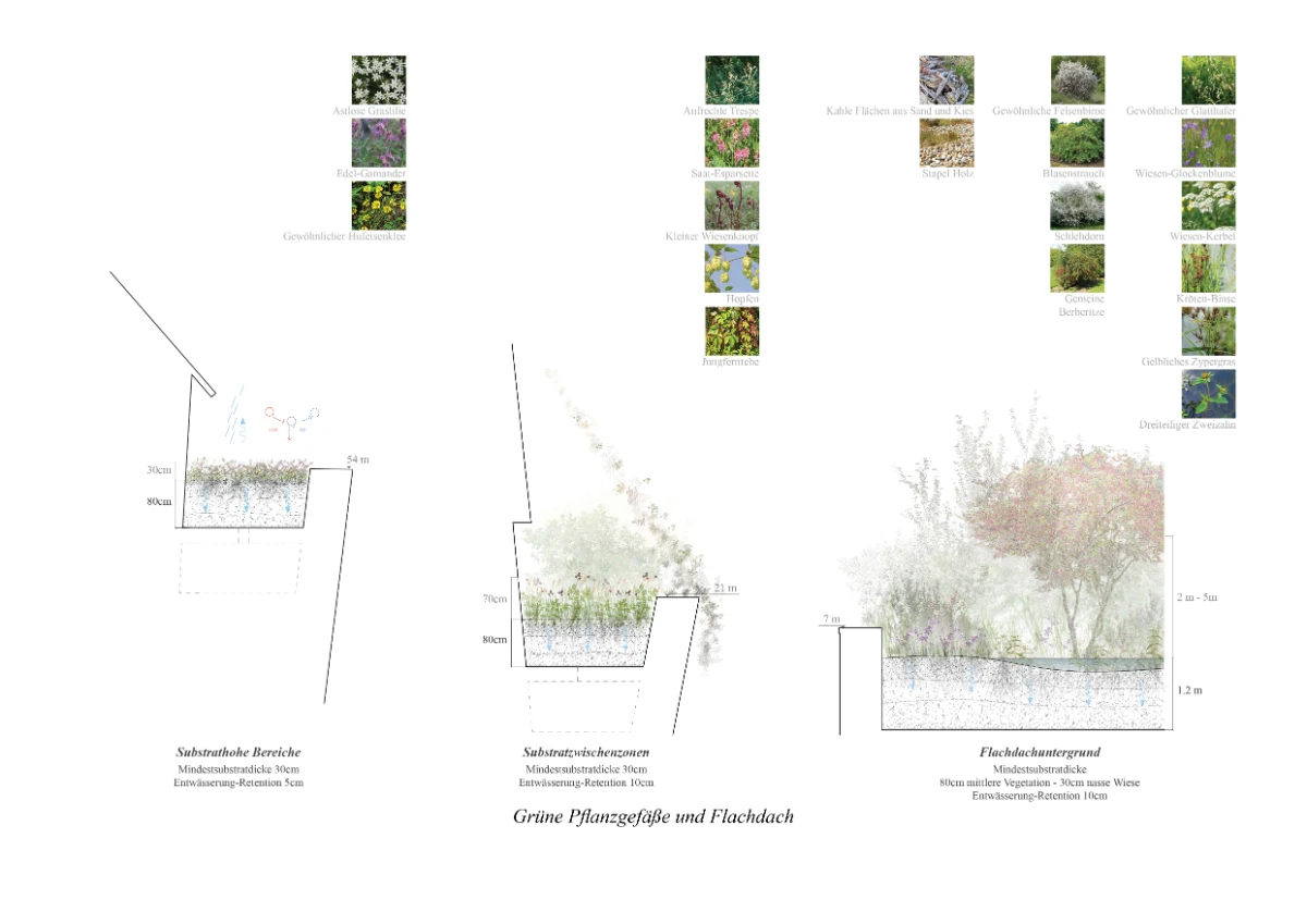 The roof features a shed layout to maximize natural light. Recesses within the projections and roof edges provide space for ecological niches, which double as rainwater retention basins. Additionally, the adaptable placement of bracing elements on the roof and facades allows for openings to facilitate the installation and replacement of technical equipment. To support this functionality, cladding and roofing segments are designed to be removable. Advanced insulation materials further enhance thermal performance, reducing overall energy consumption.
