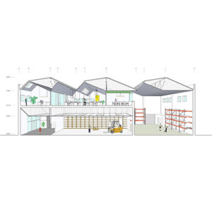 On the roof, a shed layout will allow light to enter and recesses in the projections or on the banks will allow the installation of ecological niches with a dual function as a rainwater retention tank. The positioning of the bracing elements on the roof and on the facade will be adaptable in order to create openings (from above or laterally) for the supply and replacement of technical equipment. The associated cladding and roofing segments will thus be designed to be removable.