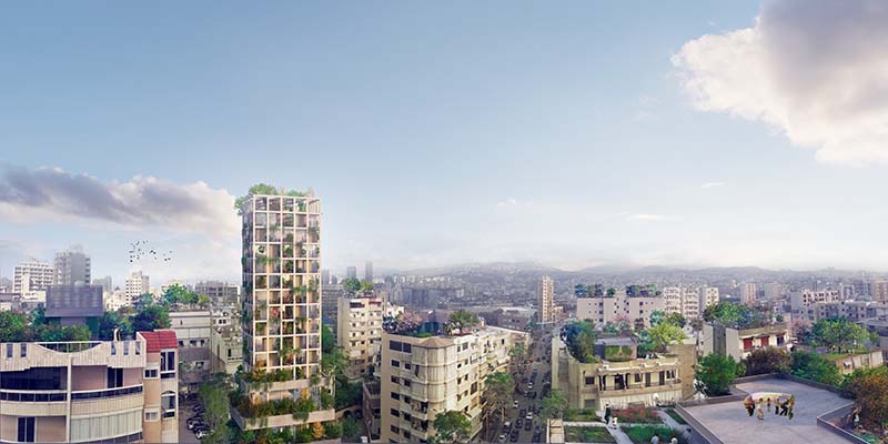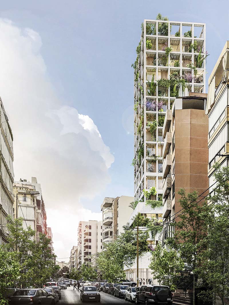 Today, one of the ways of salvation for the Lebanese progressive imbalances between the different communities lies in apprenticeships, and in particular, of women who too often stay away from the trades that unite society: trades linked to sustainable cities. A 14-storey mixed-used M-Tower located in Chyah, an eclectic suburb of the capital Beirut, exchanging with two green satellites: Beirut s Park renovated wooden Pavilion and Baabdat’s Peri-Urban agricultural farm. The tower comprise of a structural concrete shell and an open plan with planted edges with recycled wooden partitions, creating new flexible ways of living. This ecological project functions as a green vocational training, residential, economic and cultural center, including the maintenance of public or private green spaces.