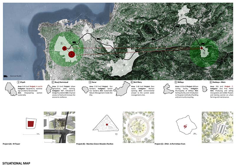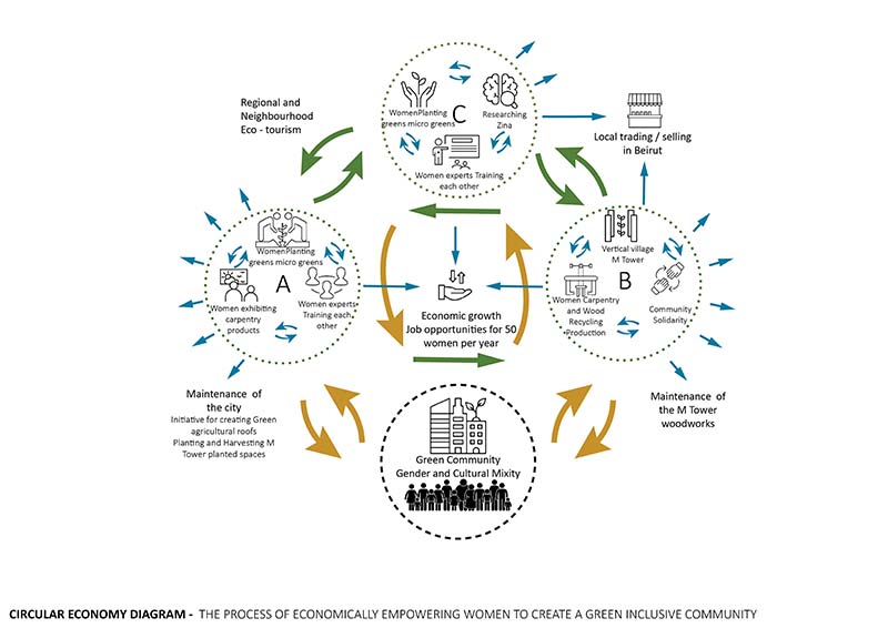 The construction process, users, maintenance and location in a dense urban environment while exchanging with two other green poles enable M-Tower to be a socially sustainable construction. Warchee ngo renovating the wooden park pavilion empowering Lebanese women in the construction and farming fields and ZINA, managed by two women agricultural engineers, sharing their techniques of edible products cultivation requiring little space and little qualification that can constitute significant sources of income. This will enable women to share ecological values and be self-sustainable economically while acquiring expertise to train their colleagues into creating a socially viable environment. The three locations are linked by an electric shuttle to initiate eco-tourism and facilitate workshops.