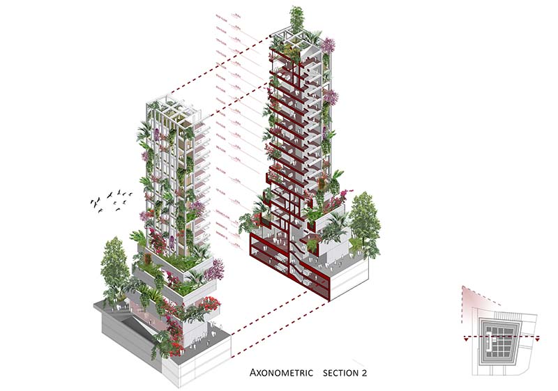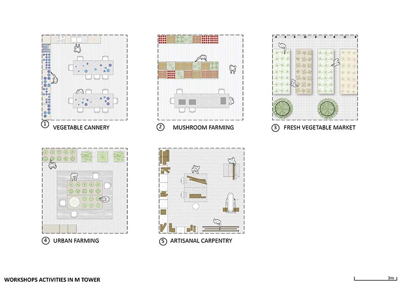 Through participatory approach in collaboration with an ngo and a Peri-urban Bio-farm, the M-tower will house diverse qualities of green spaces: aquaponics on the roof and agricultural productions requiring darkness (mushrooms, endives) in the basements. The remaining floor slabs will be planted by high and low green trees as well as edible greens. This green continuous layering will create natural shading and an adequate cross ventilation catering for a bio diverse urban vertical lung as a pilot project. Working community women will affect the upcoming generation initiating the do-it-yourself techniques. Planting wooden boxes will be created by recycling the concrete construction formwork. Community composting of the organic wastes will be collected and used as a natural aggregate.