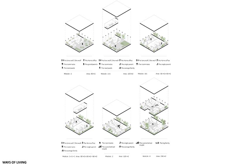 The modular concrete structure and wooden recycled envelop create flexibility in the inhabited volumes transforming them into tailored housing systems in their sizes or budgets. These Configurations allow social and economic programmatic mixity leaving room for sharable or reversible housing. Inspired from the Lebanese extended family housing culture to create a vertical sustainable village. Carpentry, planting, maintenance workshops, for women are located in the lowest floors along with community parking.