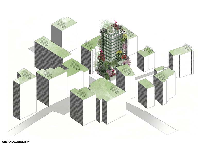 The vertical green village responds and criticizes its neighborhood by using vertical ecological gardens as a buffer and as a manifesto of existence within the Chyah area. The proposal shows the interaction between a very dry congested area with a fluid forested vertical environment creating internal privacy for its inhabitants and acting as a sustainable activator for greener link between the street and the roofs. The volume acts as an inclusive green corridor offering programmatic flexibility.