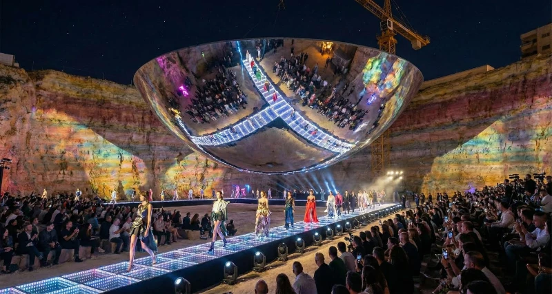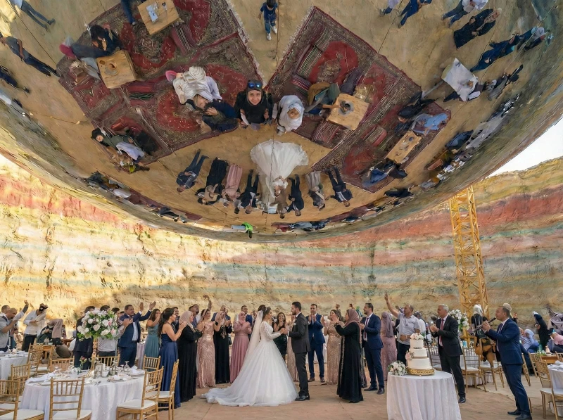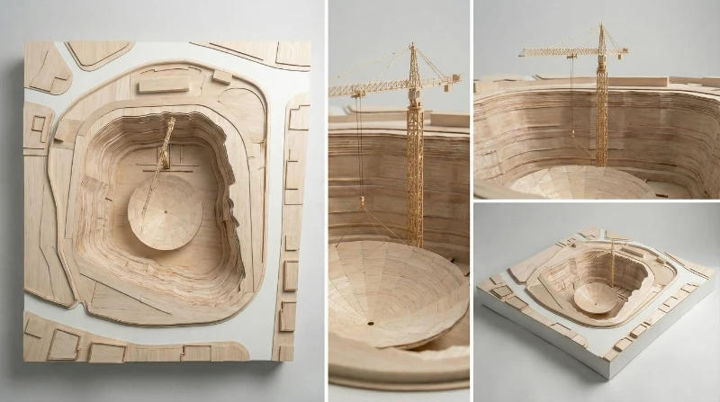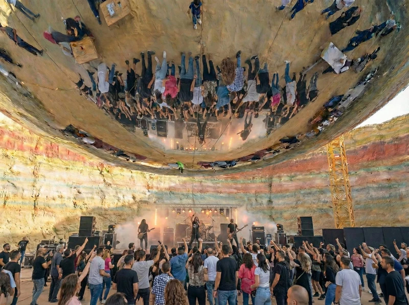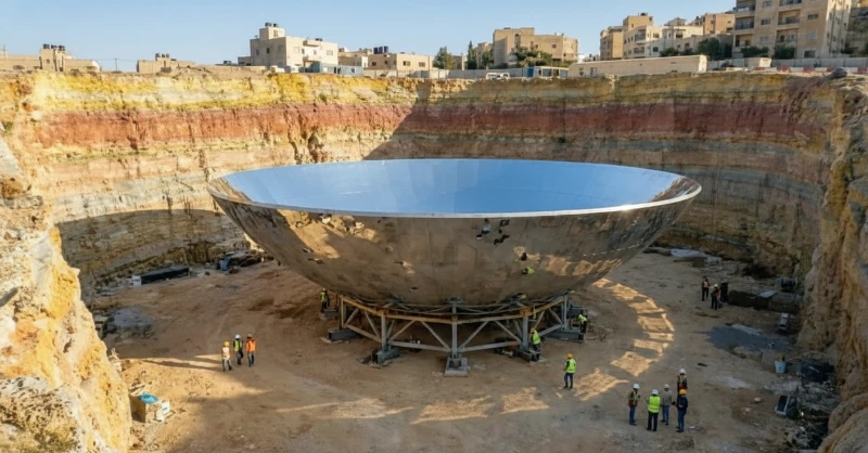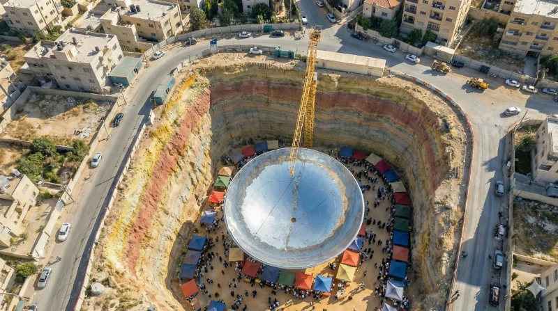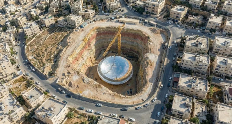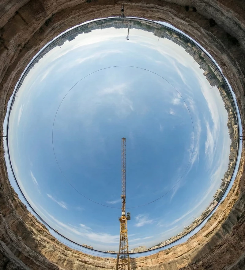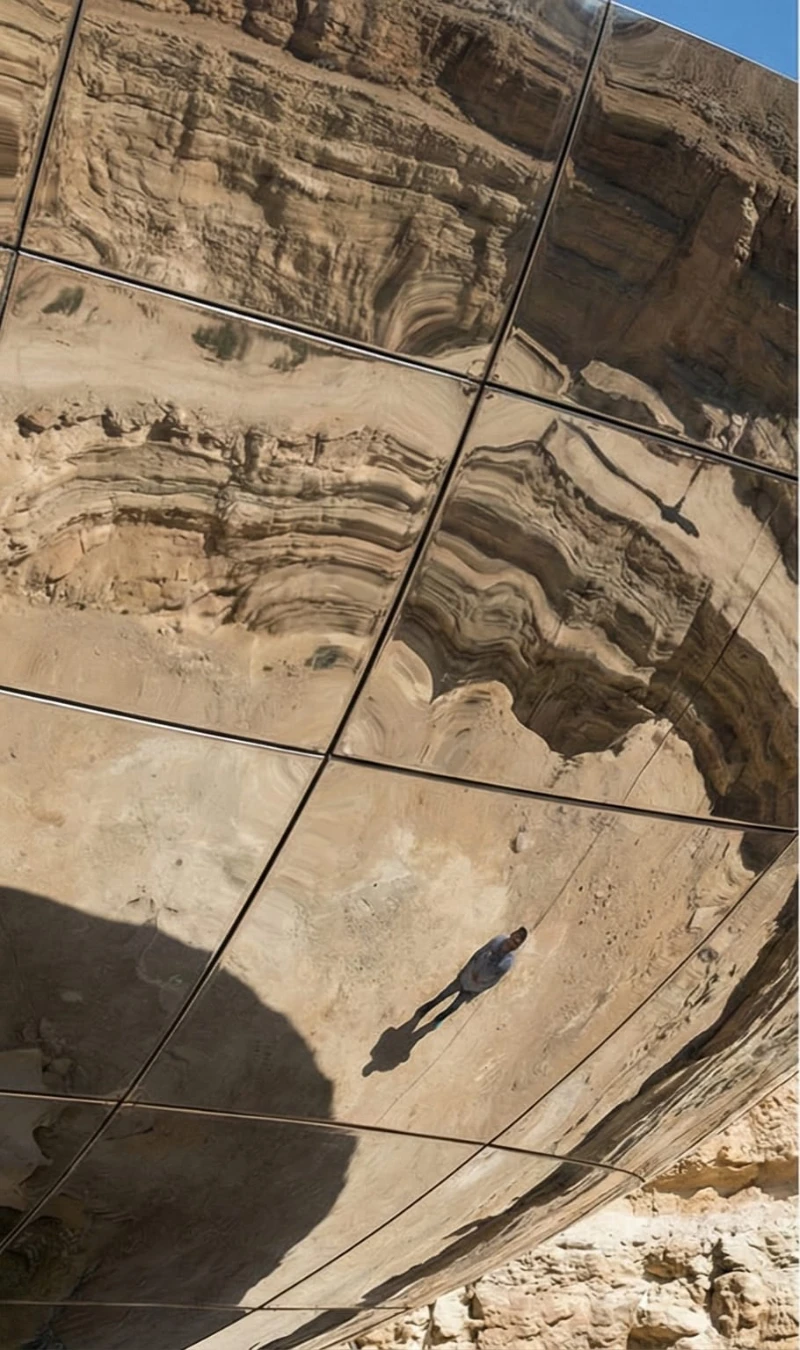 Suspended above the void is a giant convex mirror—an eye hanging in the air—that captures the city’s sky, its clouds, and its constant motion, and pours them inward, projecting them underground as an alternative sky. Here, the human experience is inverted: the visitor does not descend to confront the soil, but to see the city suspended above them—as if the sky had fallen downward, and the depth had become a mirror of the surface. Two temporalities—the immediate and the geological—merge into a single panoramic scene, where fragility and solidity coexist.
