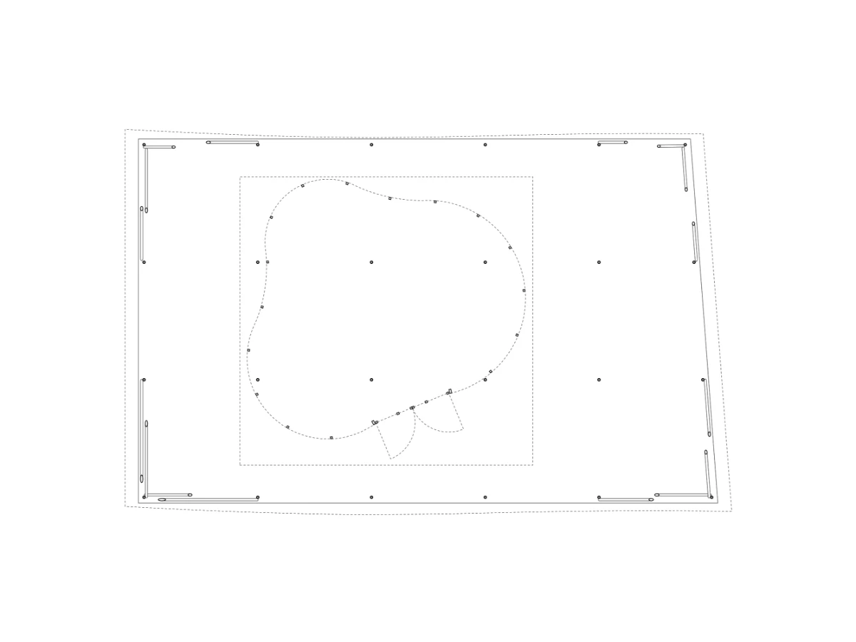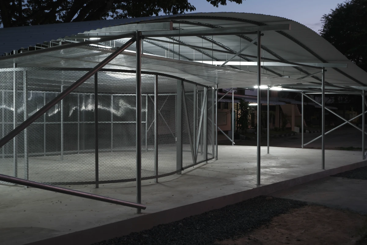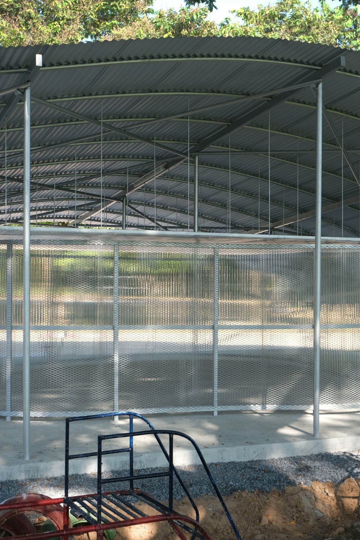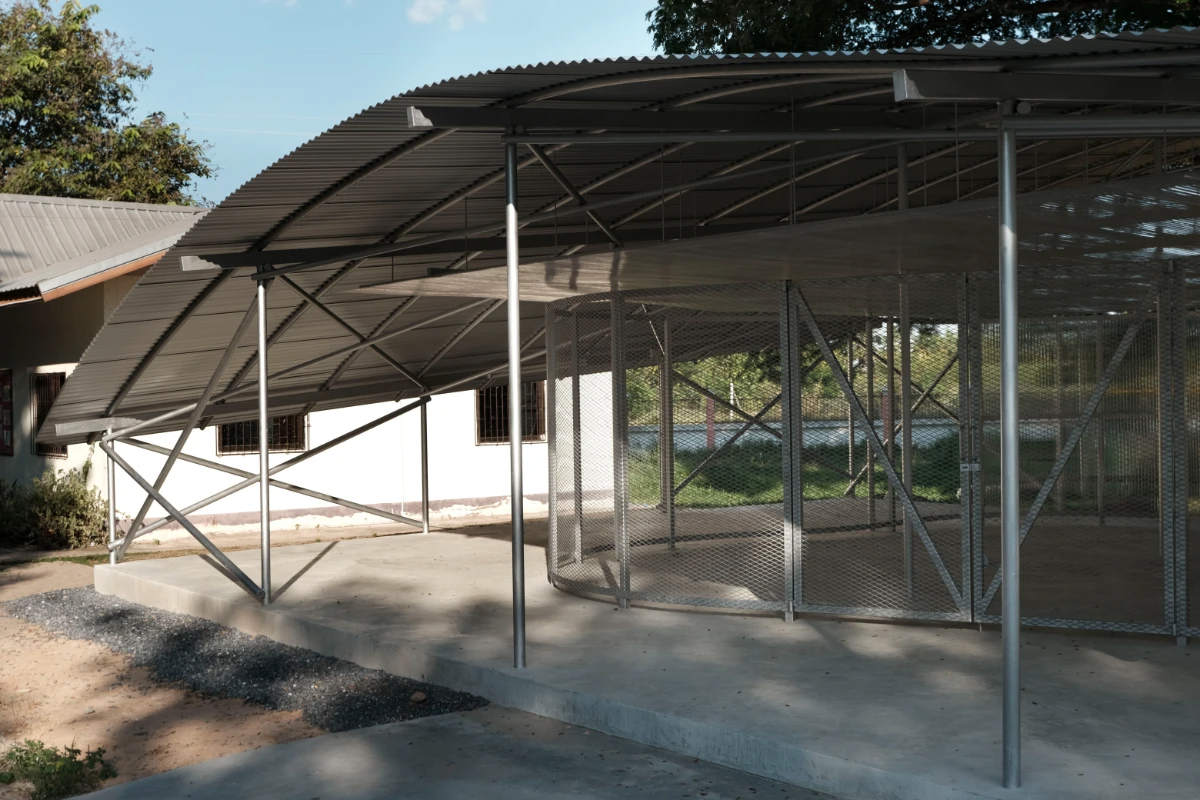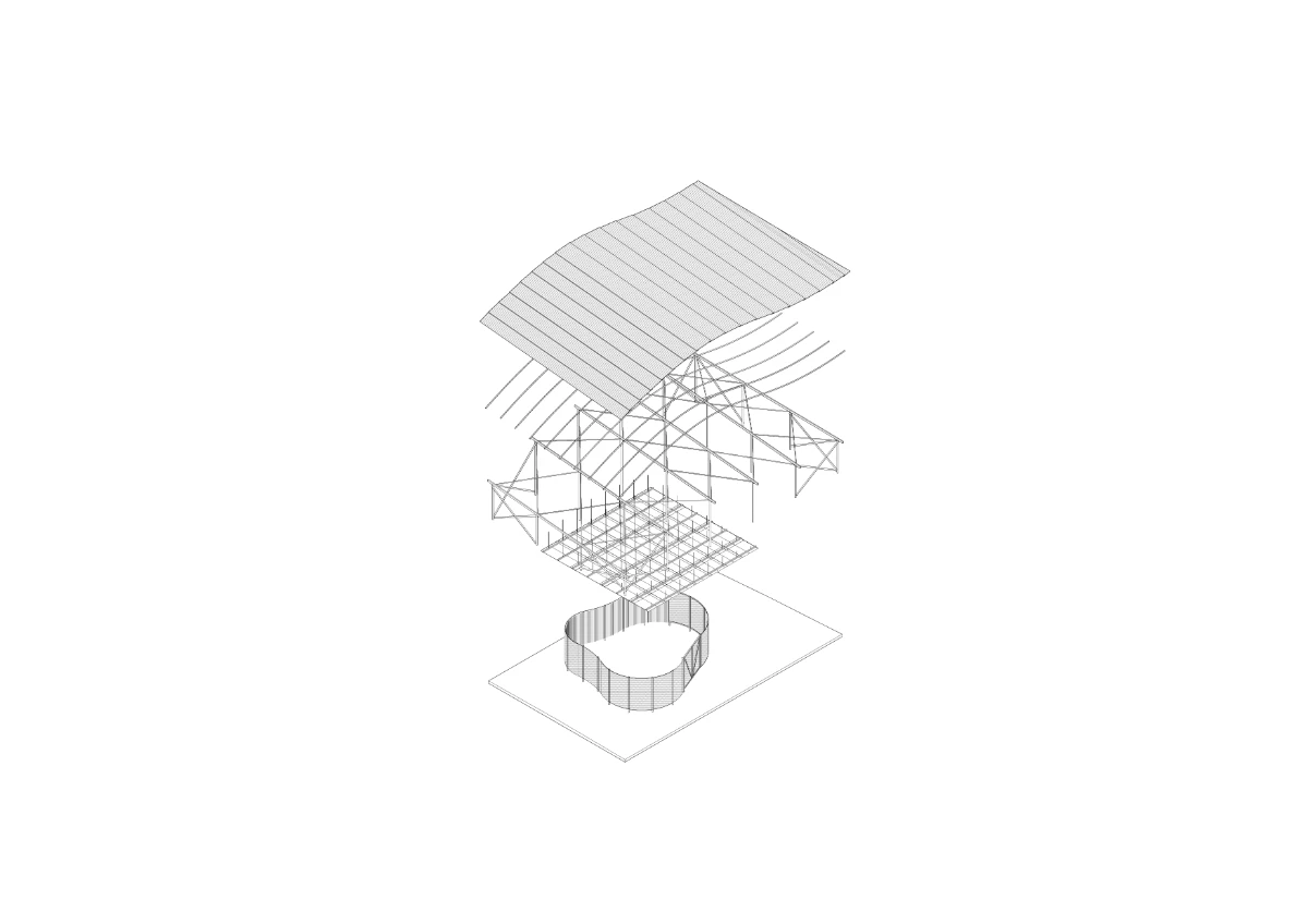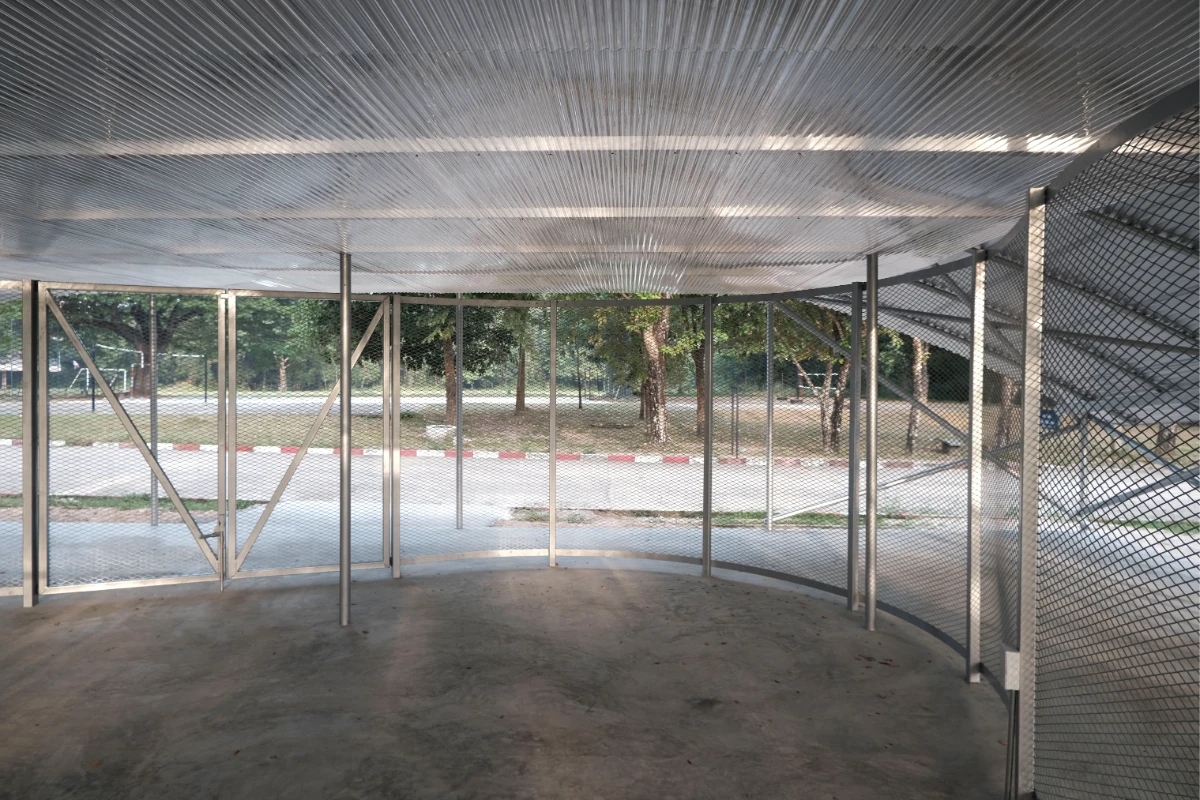 The curved roof helps channel air through the interior, promoting natural ventilation. Steel members, sized similarly to the playground equipment, reinforce visual relationships and can be manually bent on-site for ease of construction and maintenance. The form is a transformation of a simple pitched roof, shaped by various external factors.